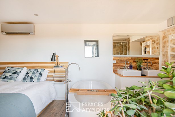 En contrebas, et aussi accessible depuis l'entree, la terrasse se devoile comme un prolongement naturel de la maison. À ce meme niveau, la suite parentale a ete pensee comme un cocon prive, avec son dressing et un acces direct a l'exterieur, offrant une atmosphere paisible et intimiste. Un WC independant complete cet espace.