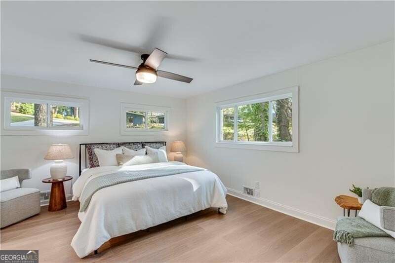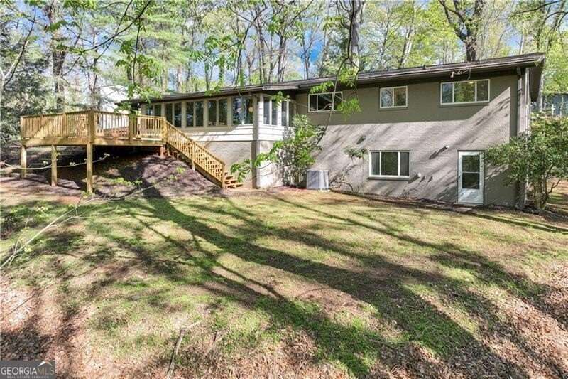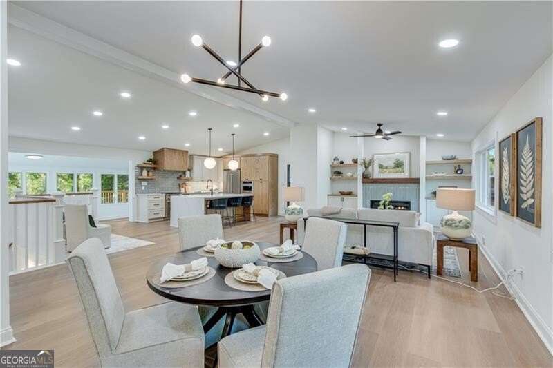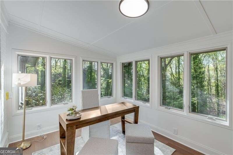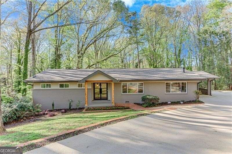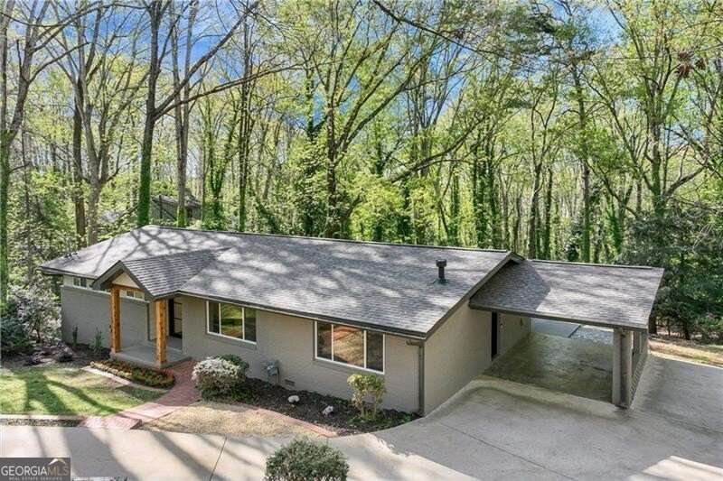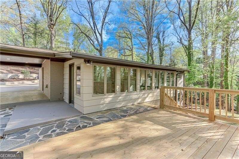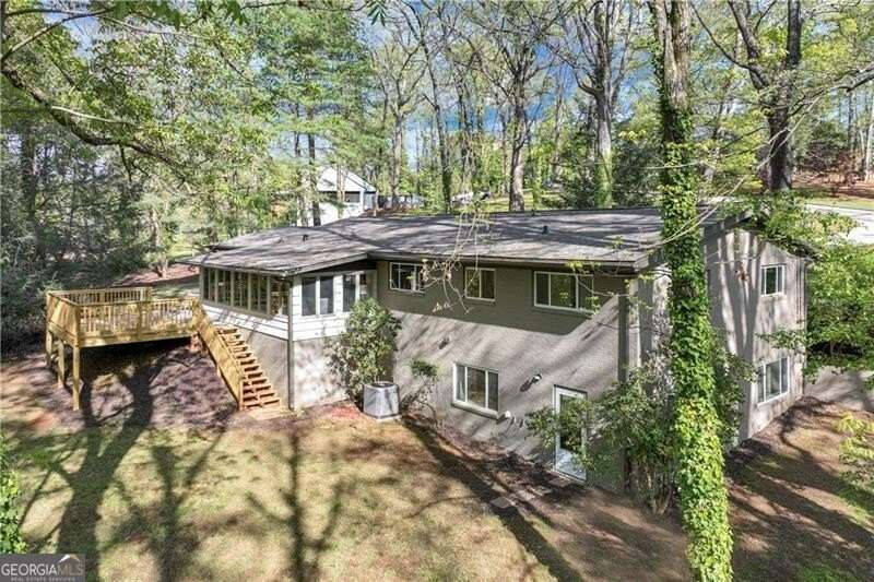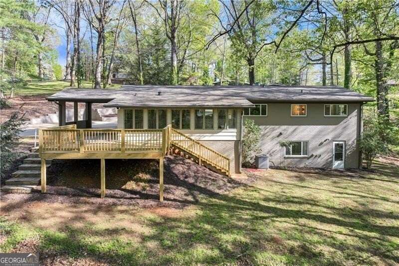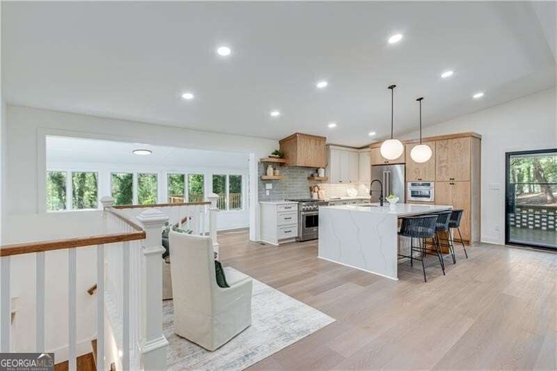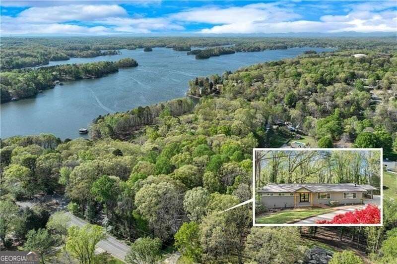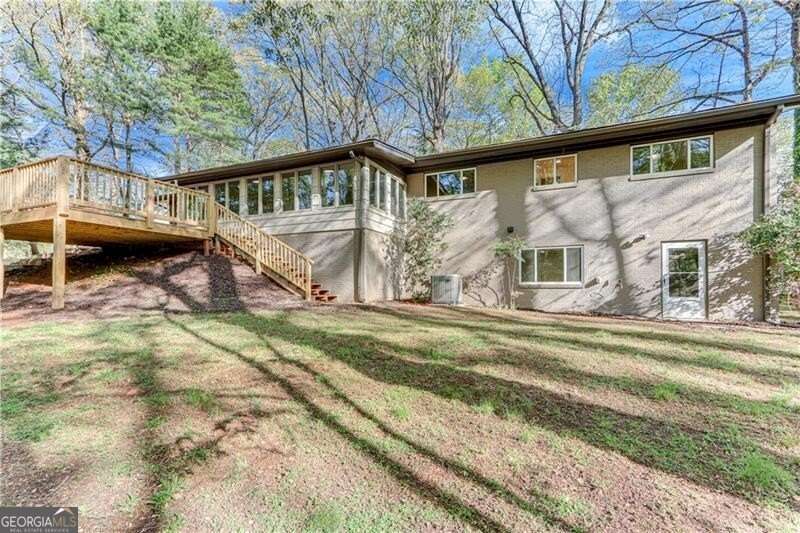 Stunning mid-century in the heart of Gainesville, located on a quiet street in a Lake Lanier neighborhood with seasonal lake views. Enjoy privacy with well-spaced homes and a serene backyard setting. This stunning home features wrought iron exterior doors, a fireplace flanked with built-ins, and a beautifully reimagined island kitchen with custom white oak cabinetry, open oak shelving and quartz counters, with stainless KitchenAid appliances. The main-level owner's suite offers a luxurious double-headed shower and a custom walk-in closet. The sunroom across the back, with its own exterior entry, is ideal for a home office. The terrace level includes not only living/dining space with a bar, sink and Kitchen-Aid fridge, but also a bedroom suite, a bonus room for hobbies or storage, and a second laundry room. Nearly everything is new: windows, plumbing, electrical, roof-and washer/dryer on main level. A rare blend of timeless style, functionality and location. No HOA. Owners are agents.