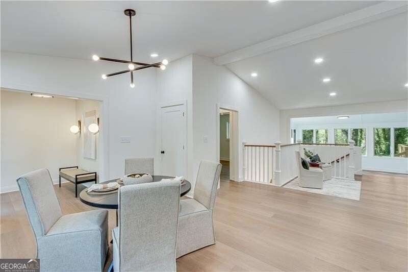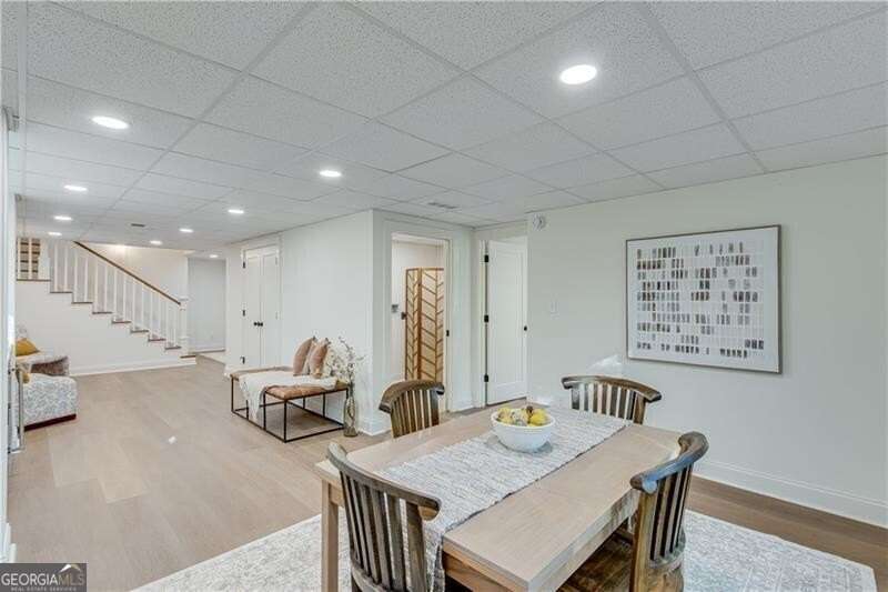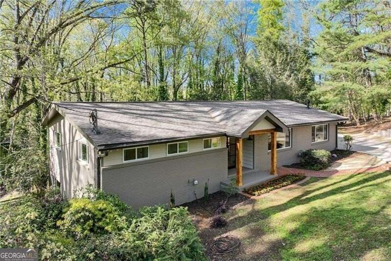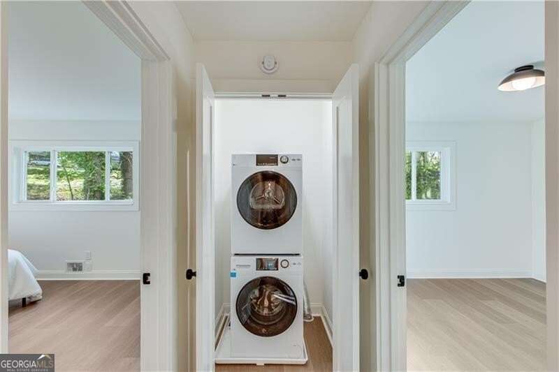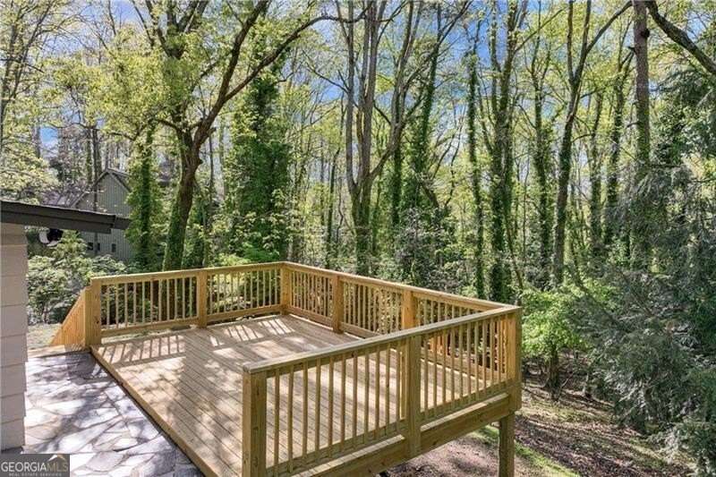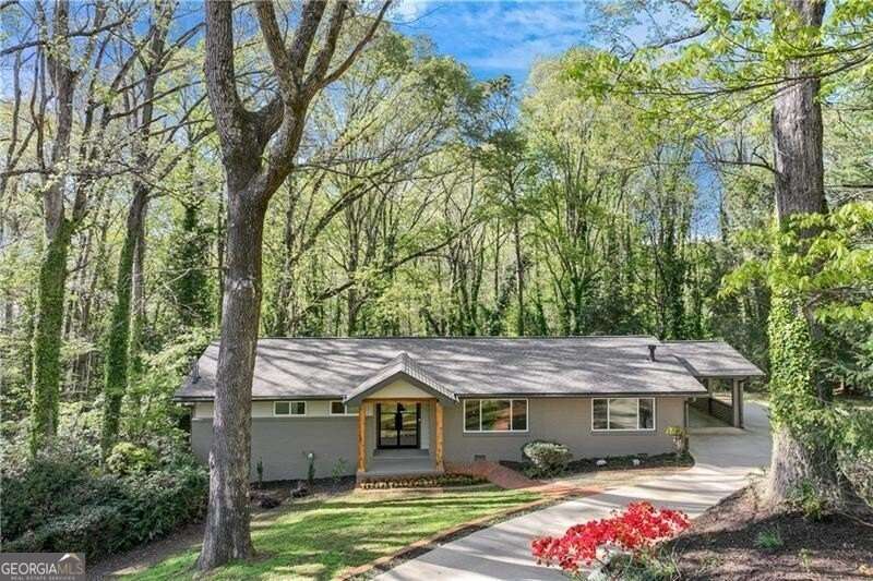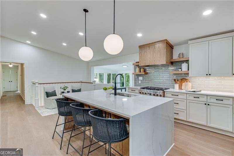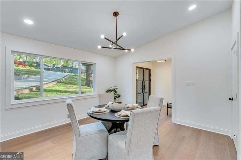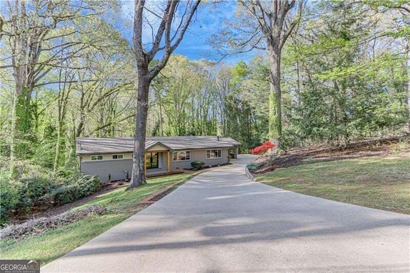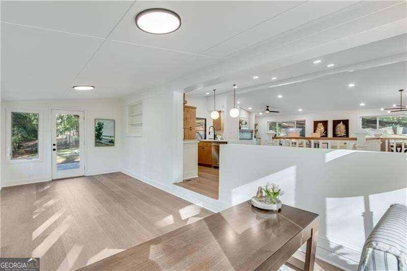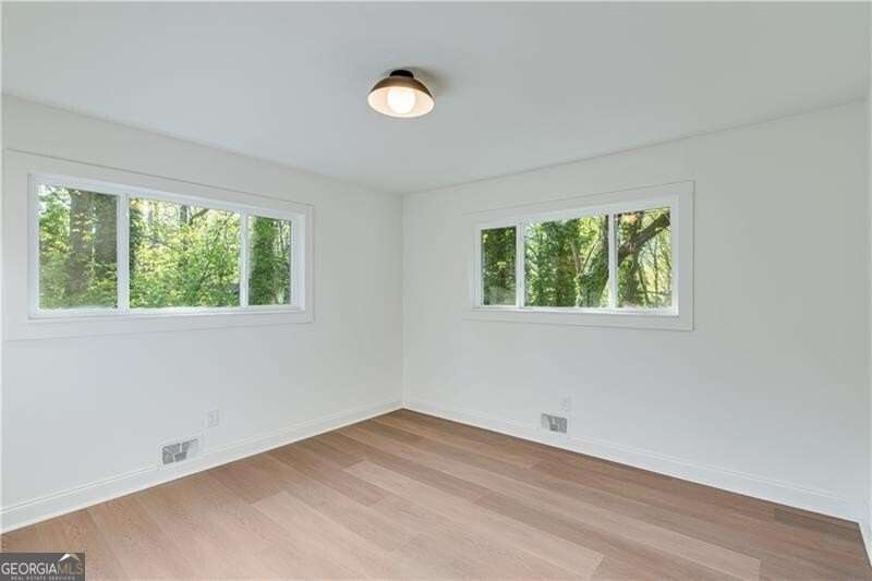 Stunning mid-century in the heart of Gainesville, located on a quiet street in a Lake Lanier neighborhood with seasonal lake views. Enjoy privacy with well-spaced homes and a serene backyard setting. This stunning home features wrought iron exterior doors, a fireplace flanked with built-ins, and a beautifully reimagined island kitchen with custom white oak cabinetry, open oak shelving and quartz counters, with stainless KitchenAid appliances. The main-level owner's suite offers a luxurious double-headed shower and a custom walk-in closet. The sunroom across the back, with its own exterior entry, is ideal for a home office. The terrace level includes not only living/dining space with a bar, sink and Kitchen-Aid fridge, but also a bedroom suite, a bonus room for hobbies or storage, and a second laundry room. Nearly everything is new: windows, plumbing, electrical, roof-and washer/dryer on main level. A rare blend of timeless style, functionality and location. No HOA. Owners are agents.