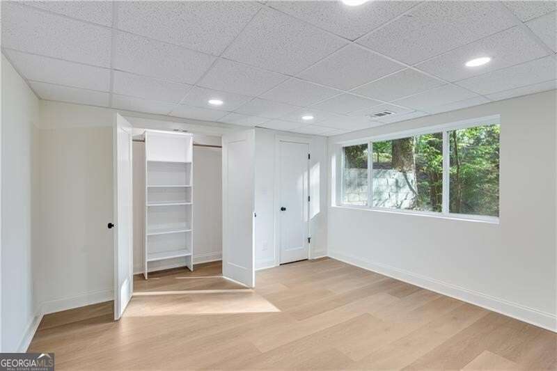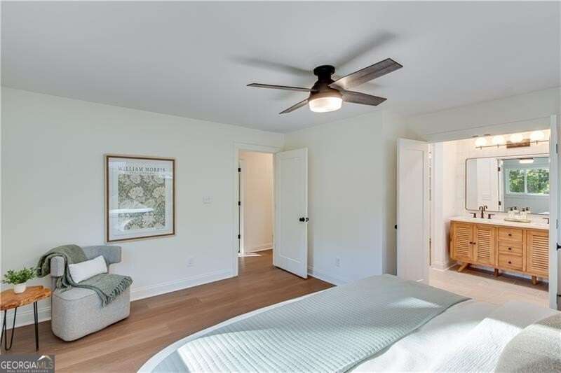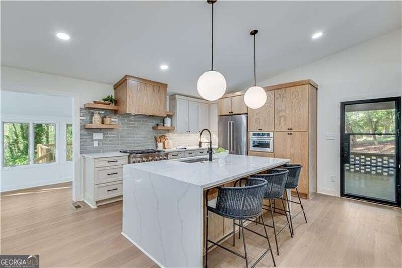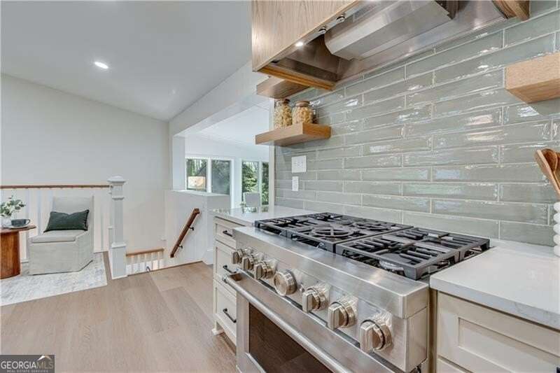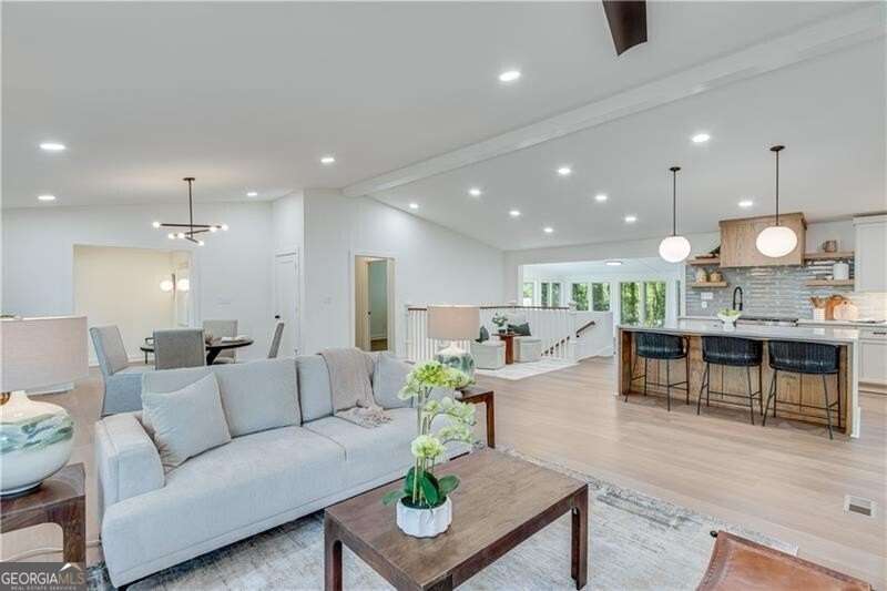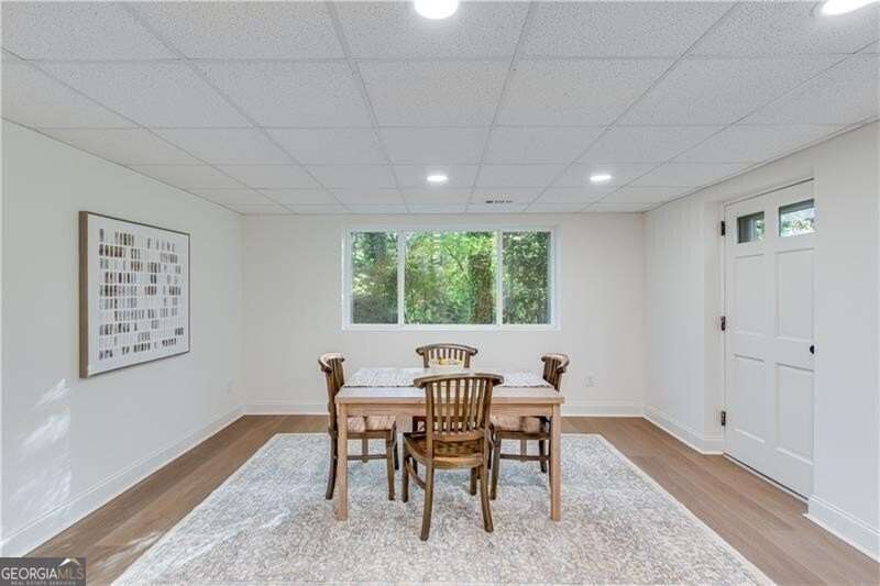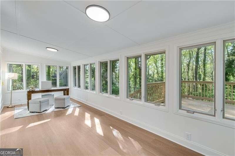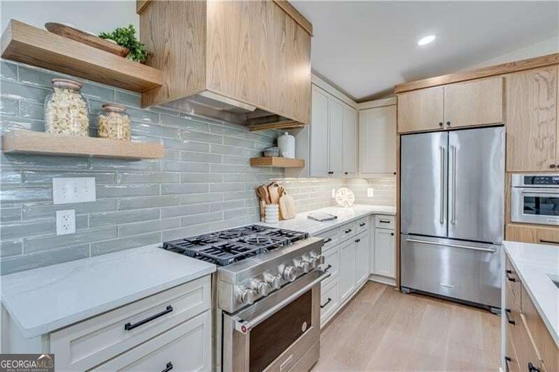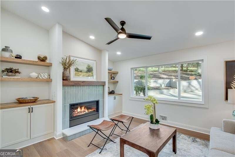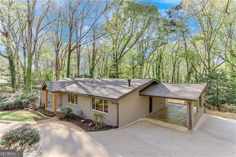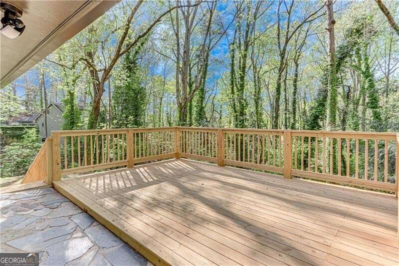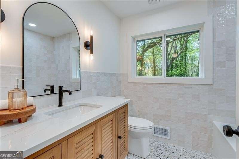 Stunning mid-century in the heart of Gainesville, located on a quiet street in a Lake Lanier neighborhood with seasonal lake views. Enjoy privacy with well-spaced homes and a serene backyard setting. This stunning home features wrought iron exterior doors, a fireplace flanked with built-ins, and a beautifully reimagined island kitchen with custom white oak cabinetry, open oak shelving and quartz counters, with stainless KitchenAid appliances. The main-level owner's suite offers a luxurious double-headed shower and a custom walk-in closet. The sunroom across the back, with its own exterior entry, is ideal for a home office. The terrace level includes not only living/dining space with a bar, sink and Kitchen-Aid fridge, but also a bedroom suite, a bonus room for hobbies or storage, and a second laundry room. Nearly everything is new: windows, plumbing, electrical, roof-and washer/dryer on main level. A rare blend of timeless style, functionality and location. No HOA. Owners are agents.
