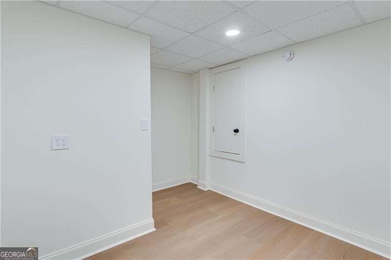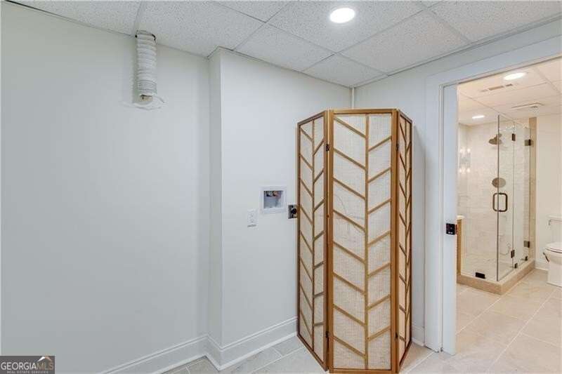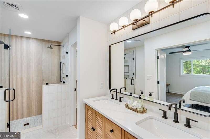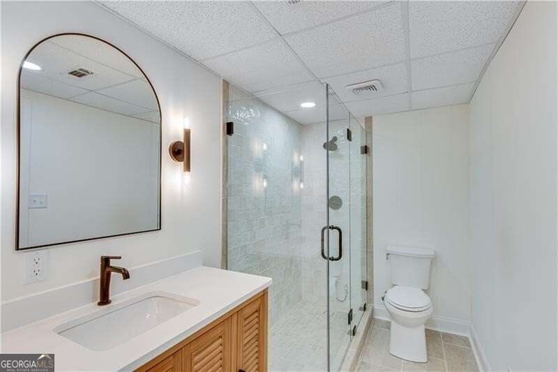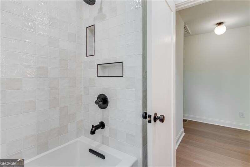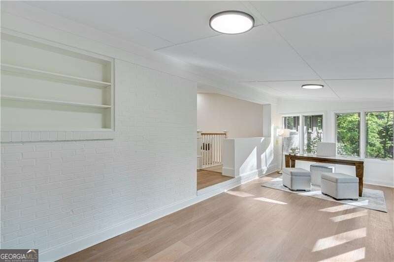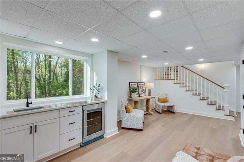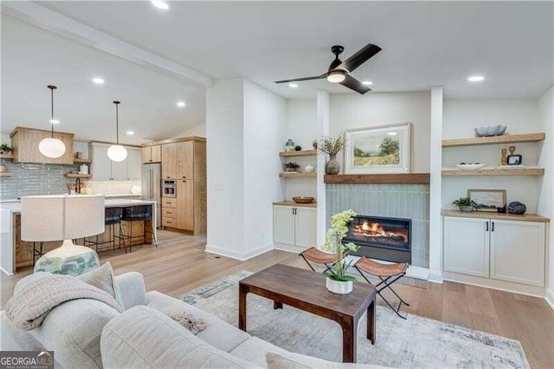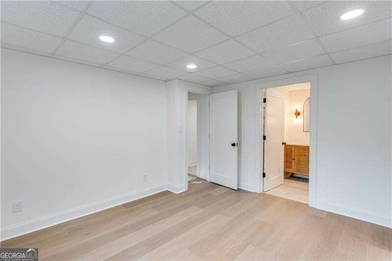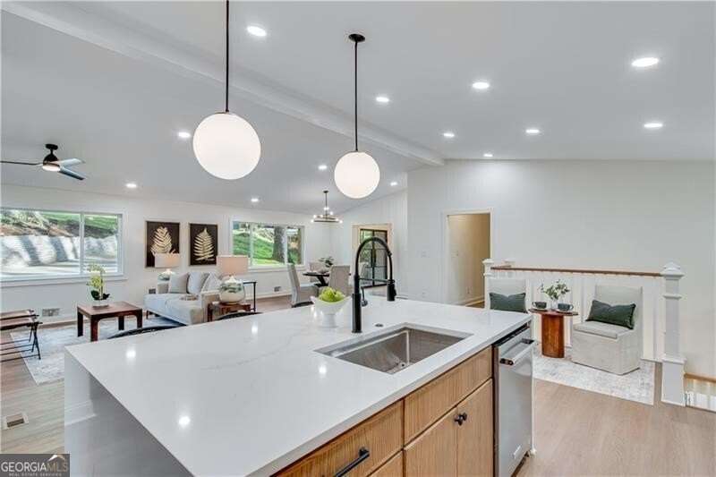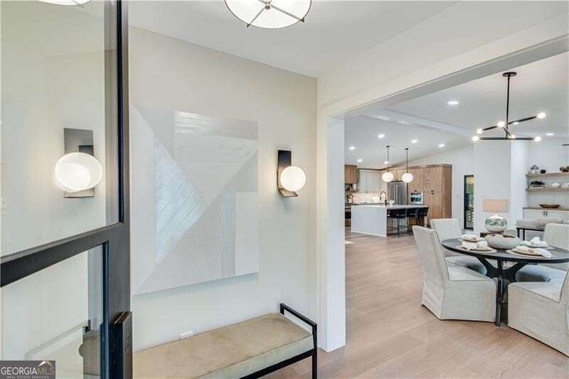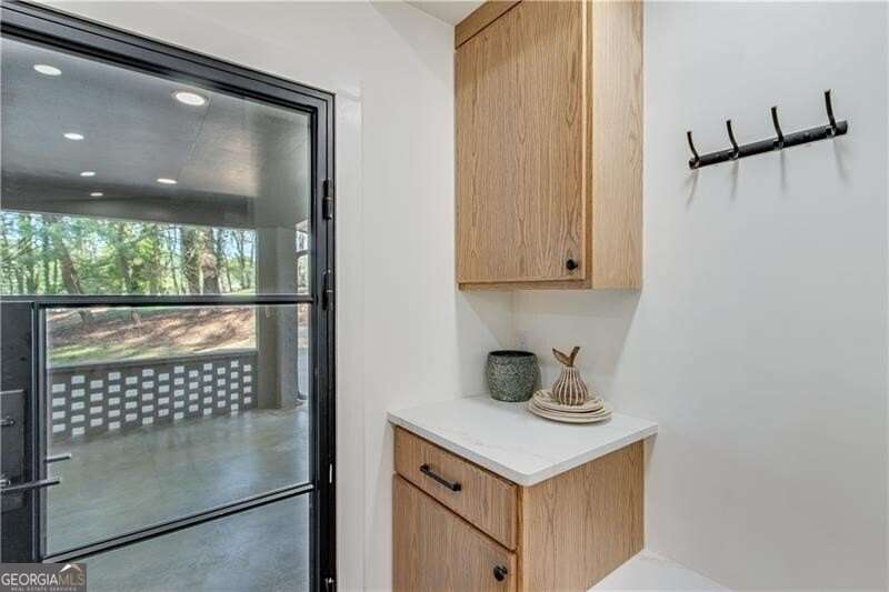 Stunning mid-century in the heart of Gainesville, located on a quiet street in a Lake Lanier neighborhood with seasonal lake views. Enjoy privacy with well-spaced homes and a serene backyard setting. This stunning home features wrought iron exterior doors, a fireplace flanked with built-ins, and a beautifully reimagined island kitchen with custom white oak cabinetry, open oak shelving and quartz counters, with stainless KitchenAid appliances. The main-level owner's suite offers a luxurious double-headed shower and a custom walk-in closet. The sunroom across the back, with its own exterior entry, is ideal for a home office. The terrace level includes not only living/dining space with a bar, sink and Kitchen-Aid fridge, but also a bedroom suite, a bonus room for hobbies or storage, and a second laundry room. Nearly everything is new: windows, plumbing, electrical, roof-and washer/dryer on main level. A rare blend of timeless style, functionality and location. No HOA. Owners are agents.