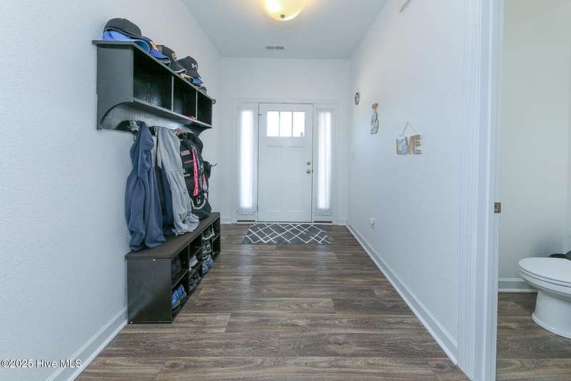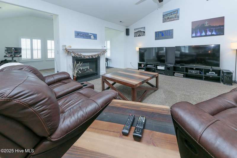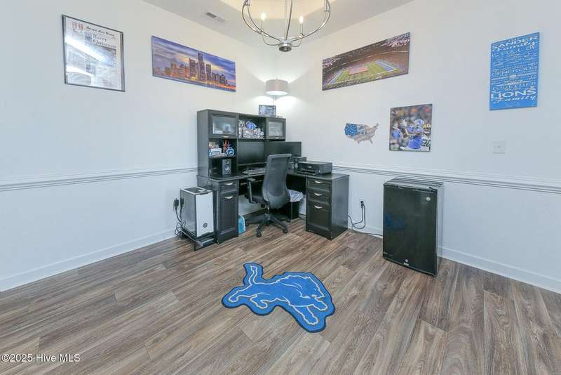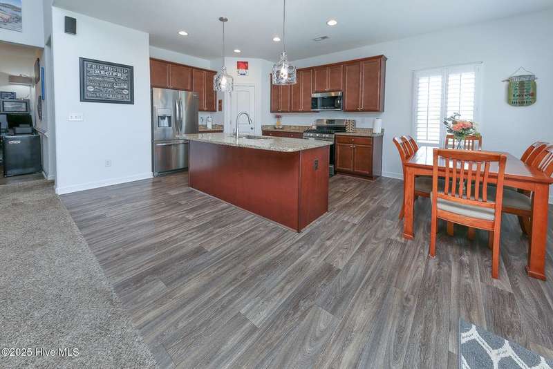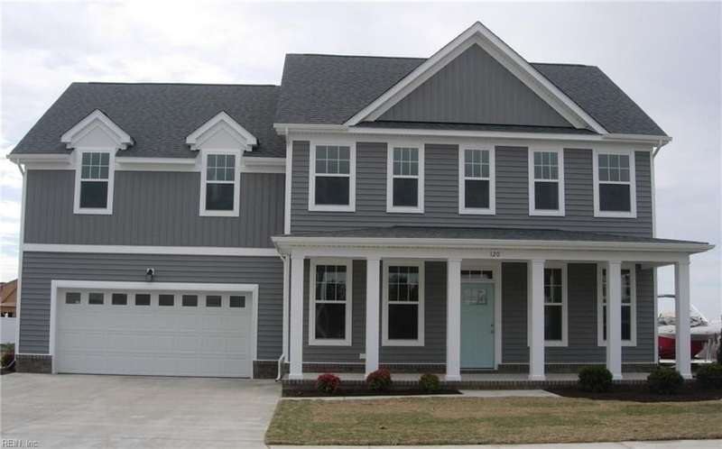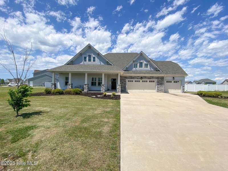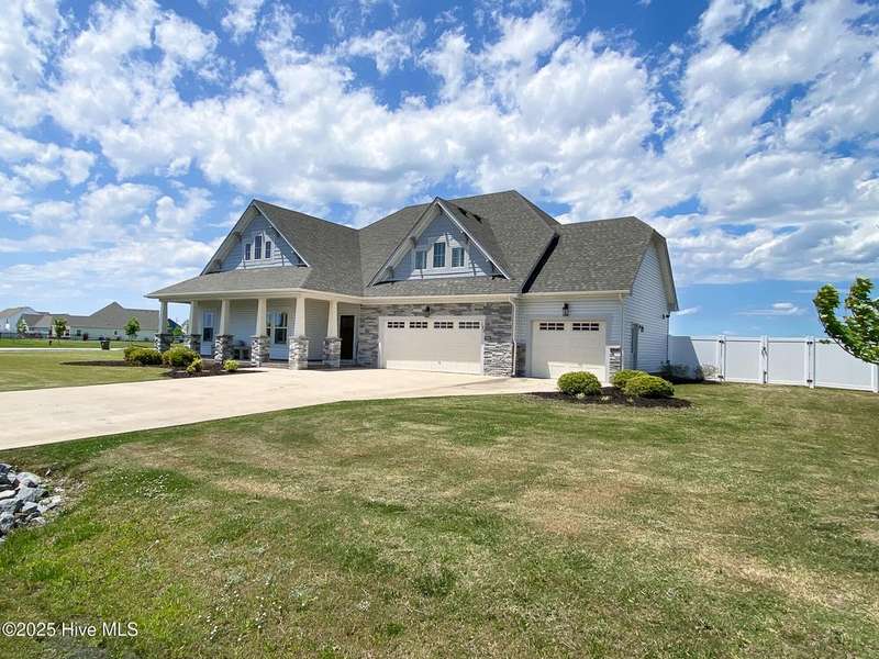 This Craftsman-styled home boasts stone columns and accents. This special home is loaded with upscale finishes like plantation shutters; gourmet kitchen; master bath with jetted tub; large finished room over 3-car garage with full bath. This expansive open room can be used as a bedroom or game room or divided up into several rooms. Family room on main level has a 2-sided fireplace enjoyed from the family room and the sunroom. Large corner lot, 0.68 acre, has a view of the pond behind the house. The back yard has a patio and is nicely fenced with white vinyl fencing. This gem is just mins from the VA/NC line and a nice drive to OBX. Walk to the library and the new elementary school. Footprint was enlarged when house was built resulting in almost 3,000 sq ft (2,961 sq ft). total. Seller will contribute to buyer's closing costs.