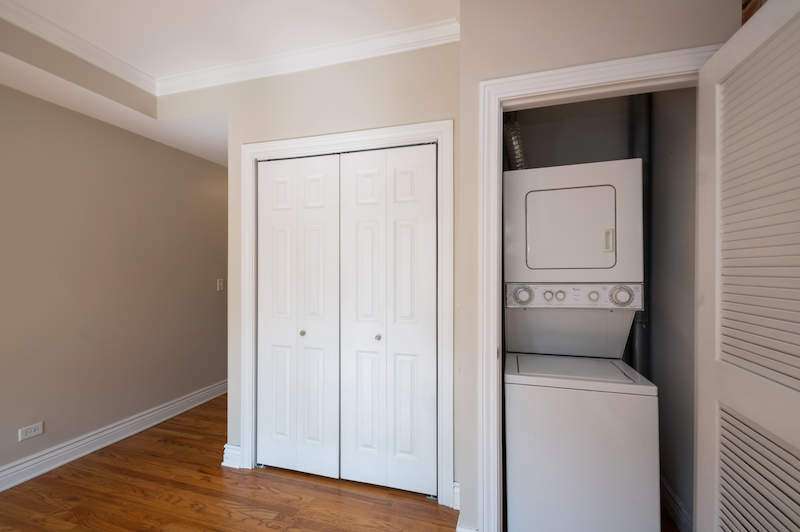 Two bedroom/one bathroom, corner unit in the Heart of Bucktown on a tree-lined street with lots of sunlight! Hardwood floors throughout the unit. Beautiful, upgraded bathroom, inviting kitchen with island, In-Unit washer/dryer, central A/C, good closet space, basement storage, plus private rear deck! Great location surrounded by dining, night life, shopping, and across from Red June Cafe. A convenient walk to the Blue Line. Easy on street parking.