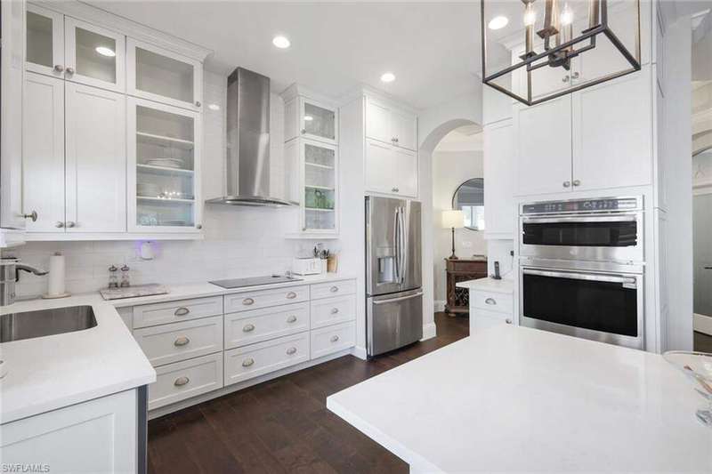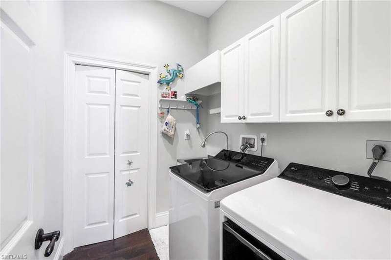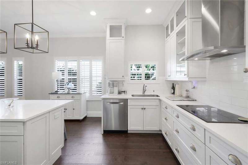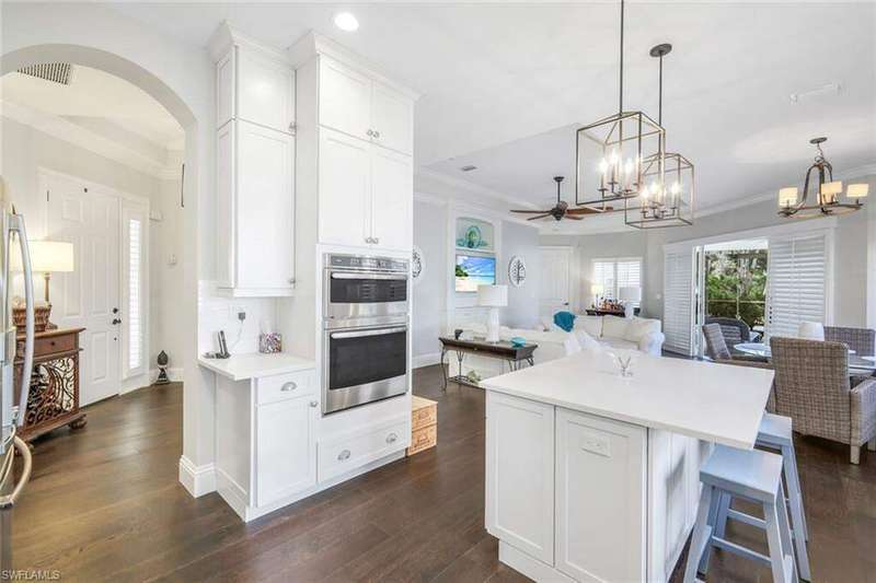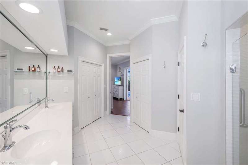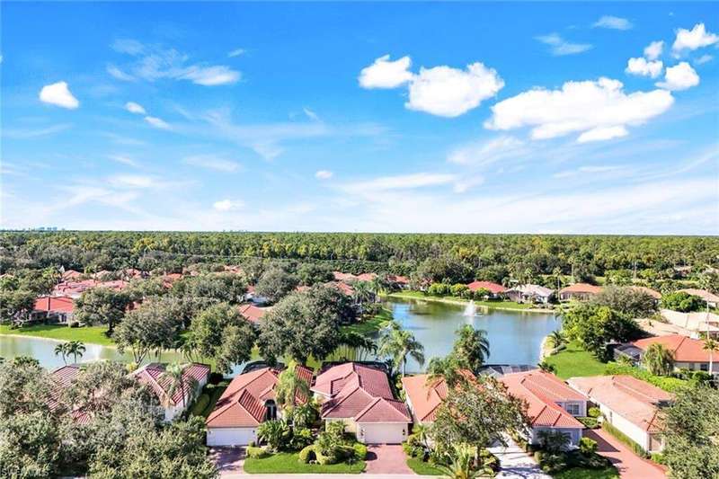 Mediterranean Villa in Vineyards Country Club!! This private villa in the Fountainhead neighborhood overlooks a lake and offers tranquil views. The open floor plan blends living and entertaining spaces with engineered wood and ceramic tile flooring, custom plantation shutters complemented by light Caribbean-inspired colors. The contemporary kitchen features white Quartz countertops, white cabinetry, volume ceilings, and a built-in entertainment center. Volume ceilings enhance the spacious feel of the home, and a built-in entertainment center adds a touch of modern convenience. Outdoor amenities include a large lanai, heated caged pool and spa, privacy walls, and tropical landscaping. The master suite has direct access to the lanai and pool, Master bath features dual sinks, a garden tub, separate shower, and two walk-in closets. A second bedroom has its own bath, and a den with French doors that can serve as a third bedroom. Conveniently located near I-75, shops, restaurants, and just minutes from the beach and 5th Avenue, this home is a unique opportunity in a desirable community. The furnishings are negotiable, making this relaxing, beautiful, and quiet getaway an exceptional opportunity in one of the area's most sought-after communities.