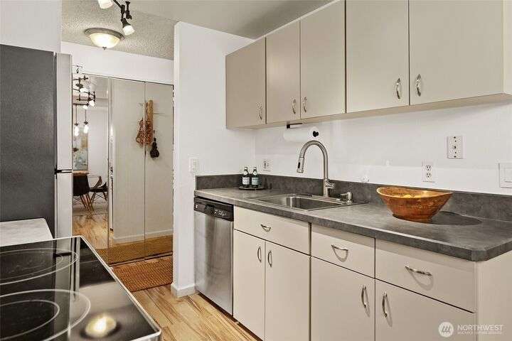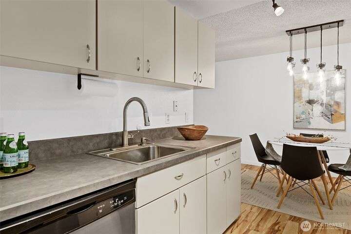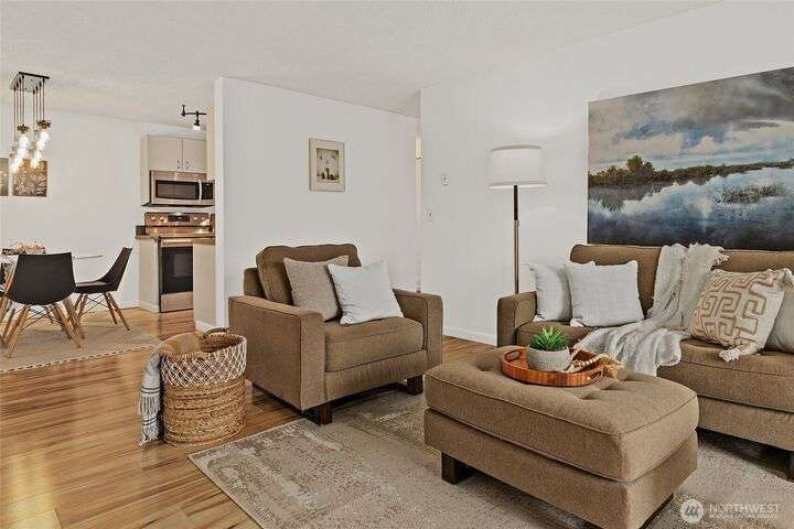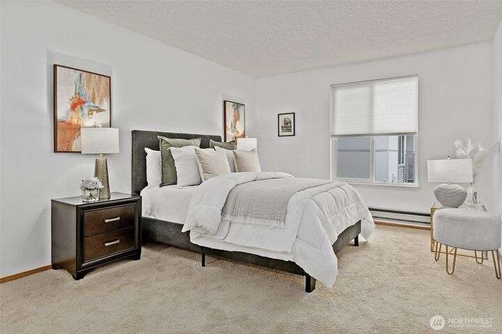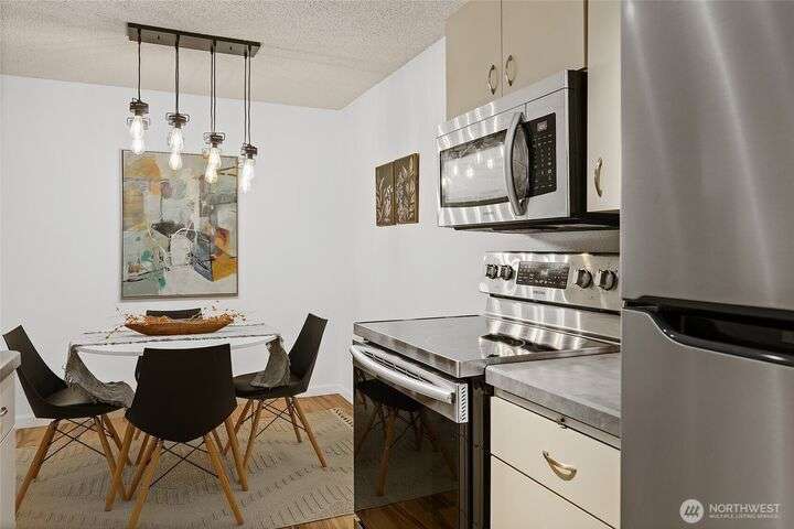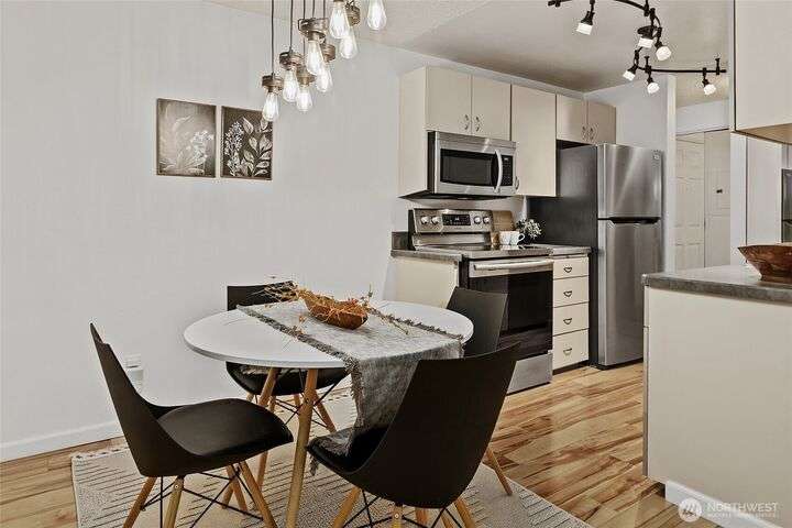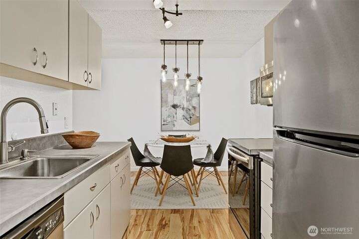 $10,000 towards HOA or Closing Costs/PrePaids at Closing! Newer List Price! Buses, Light Rail & I-5 blocks away. No-rental-cap!! Updated TOP Floor Unit, 2-bedroom, 1 Bath condo in well maintained Northgate Villa offers 970 sq. ft. open concept w/ stunning views. Featuring SS appliances, ample storage, dining area, updates like wood laminate flooring, new carpet, fresh paint & stylish light fixtures. The spacious primary bedroom accommodates a king-size bed & boasts a huge walk-in closet, while the living area is open to a private balcony. HOA dues include Cable & Internet. Amenities include pool, sauna, bike storage, gated-parking & secure access. Located near Kraken Iceplex, Thornton Creek Reserve, shopping, dining, 2 small pets per unit.