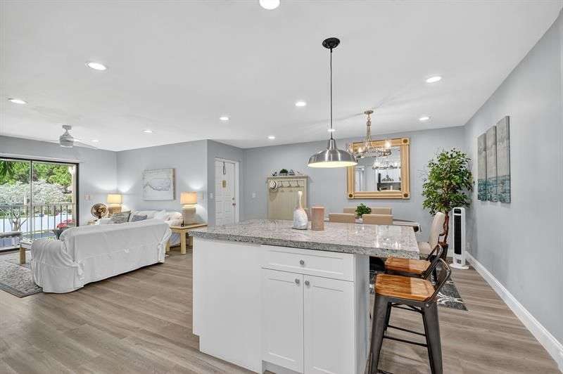 Get the Beach Vibe in this newly remodeled, and seasonally used 3BR, 2BA home in the 55+ community of Pine Ridge North Village IV. Updates include impact windows throughout and roll down shutters on the screened balcony, 2 gorgeous bathrooms, AC 2024, and roof 2024. Luxury vinyl floors in a beautiful, wood-grain complement the beach decor. The kitchen has been opened and remodeled with granite counters, white cabinets, and an island with a wine cooler, and more storage. The flow from the kitchen, dining room, and family room create an easy space for entertaining. The 3rd bedroom could be an office/den with double doors to the family room. The corner, primary bedroom has beautiful, natural light and a walk-in closet. More storage in the laundry room. OK TO RENT