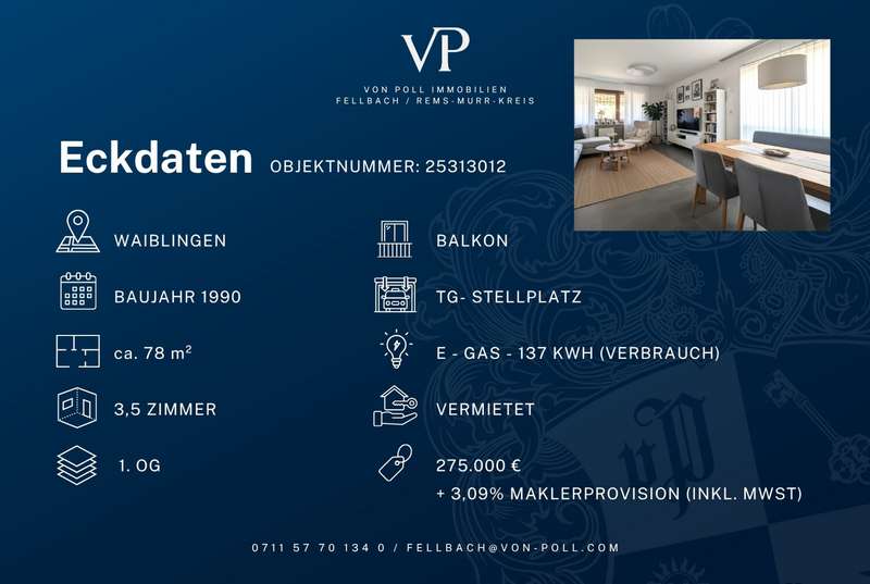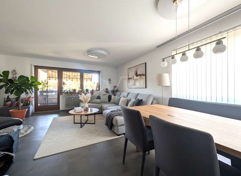 This 3.5-room apartment offers approx. 78 m² of living space and is located in a well-kept apartment building with a total of 12 residential units. It was completed in 1990. All rooms can be reached via the centrally located hallway. The spacious living room serves as the focal point of the apartment and also offers enough space for a larger dining table to the directly adjoining kitchen. There is direct access to the south-west facing balcony from the living room. A practical storage niche offers additional storage space. Pleasant hours of sunshine can be enjoyed very well here. The space is complemented by two well-designed bedrooms, which can be used flexibly as bedrooms, children's rooms or studies. The bathroom is equipped with a bathtub, a washbasin and a washing machine connection. A separate WC enhances the living comfort. An allocated cellar compartment provides additional storage space. Particularly practical: the apartment comes with an allocated underground parking space, which allows for convenient parking protected from the weather. The apartment is rented out reliably. The apartment building is located in a quiet, organically grown environment and is characterized by a pleasant house community and a well-kept appearance. This property impresses with its functional room layout, good condition and attractive location. You are welcome to arrange a viewing appointment to gain your own impression of the advantages of this offer. We look forward to hearing from you!