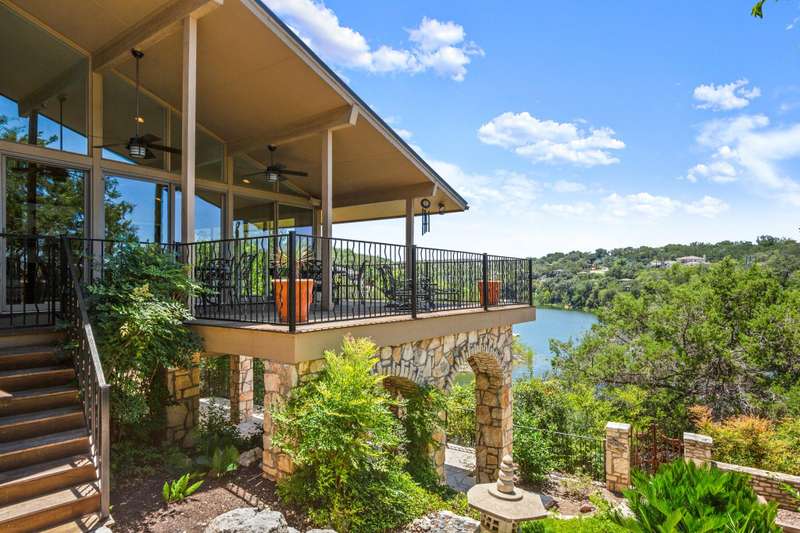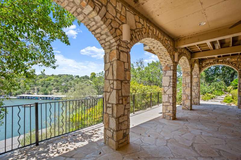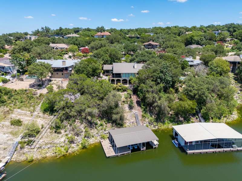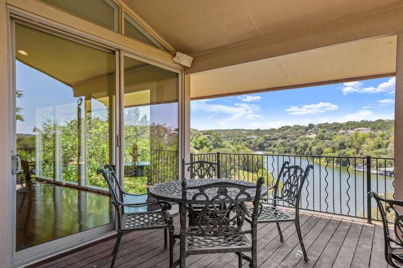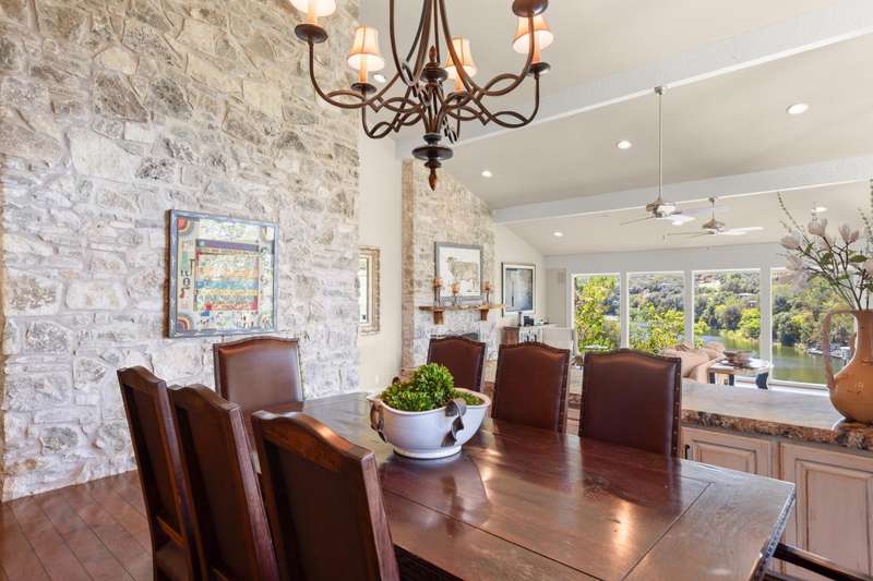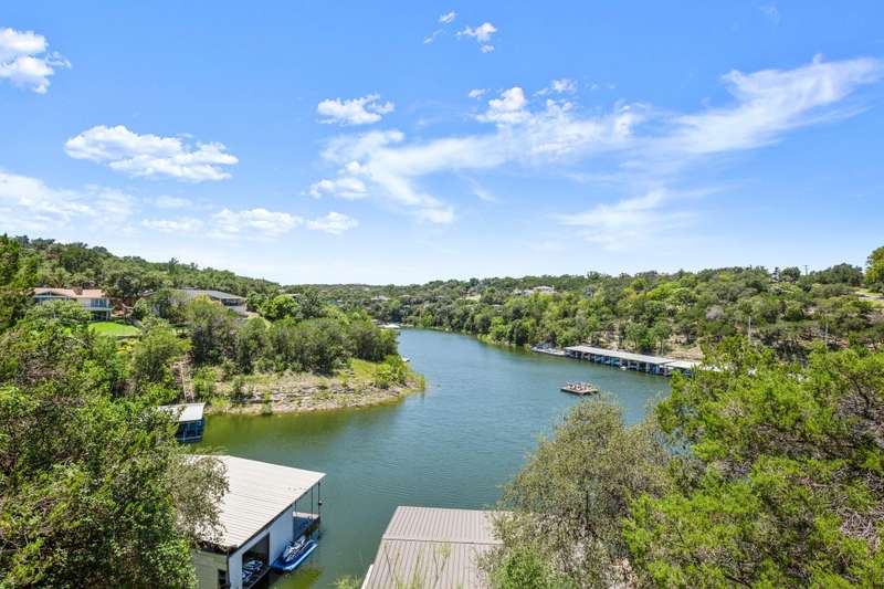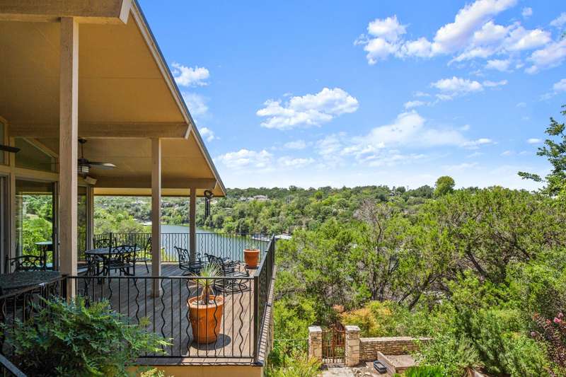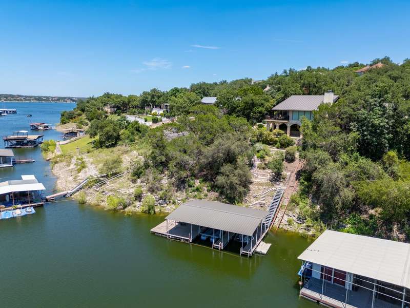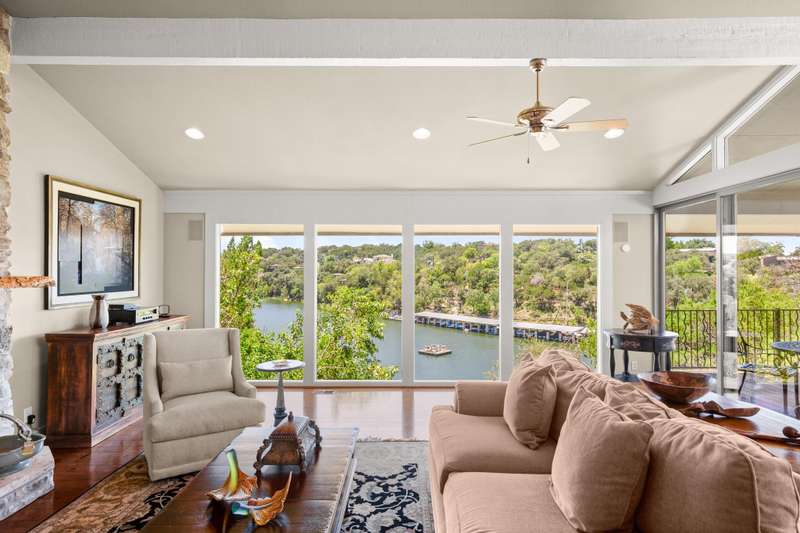 The Lake is up and the price is down! Opportunity is knocking, this mid-century house is the perfect lakefront getaway. Built for casual entertaining, all eyes are focused on the incredible setting overlooking Lake Travis. Built in 1975 with several refreshes, this home provides an oasis of tranquility and privacy. The floor-to-ceiling windows and doors open the living room to the outside patio where hosting, grilling and endless views are offered. Three ensuite bedrooms are on the main level including the primary along with an additional primary ensuite downstairs. Two living areas, dining, an office, powder bath and walk-in pantry round out the flow.