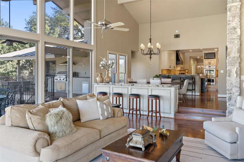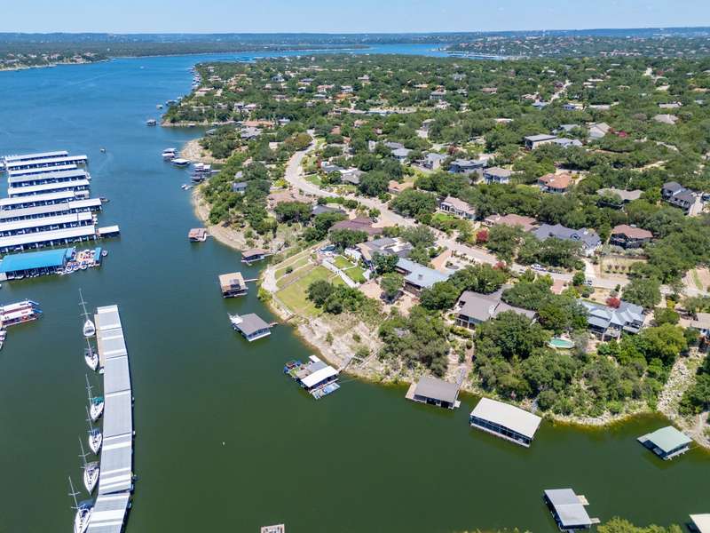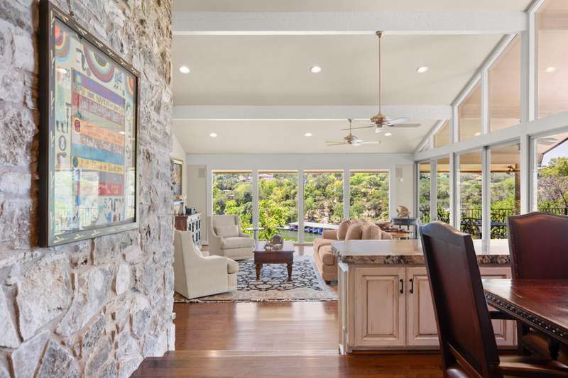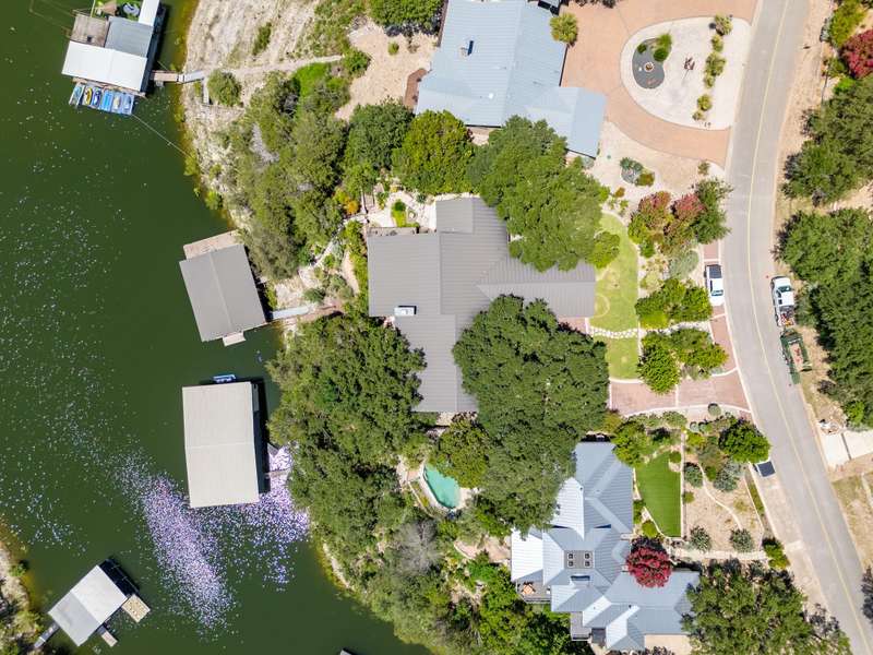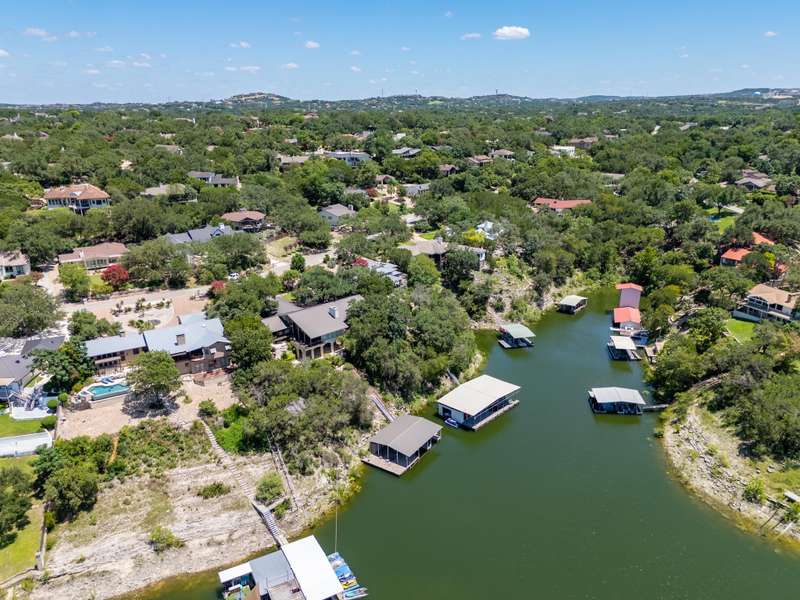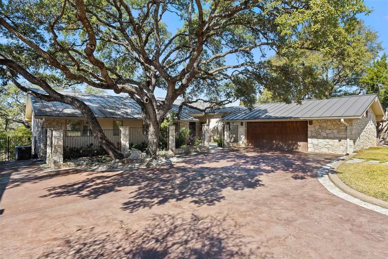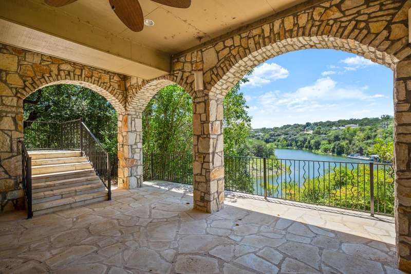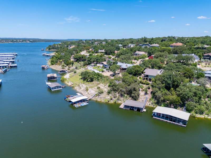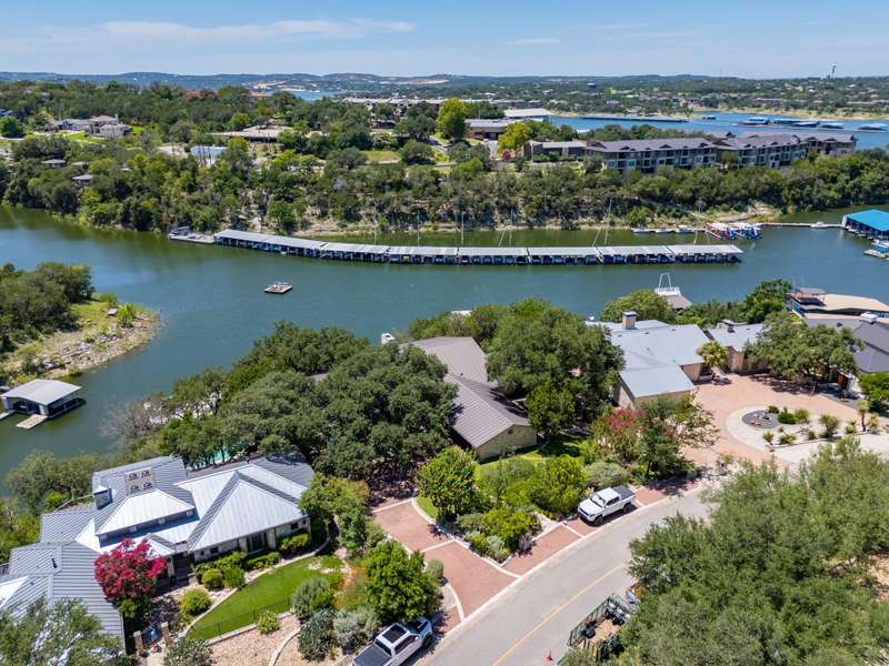 The Lake is up and the price is down! Opportunity is knocking, this mid-century house is the perfect lakefront getaway. Built for casual entertaining, all eyes are focused on the incredible setting overlooking Lake Travis. Built in 1975 with several refreshes, this home provides an oasis of tranquility and privacy. The floor-to-ceiling windows and doors open the living room to the outside patio where hosting, grilling and endless views are offered. Three ensuite bedrooms are on the main level including the primary along with an additional primary ensuite downstairs. Two living areas, dining, an office, powder bath and walk-in pantry round out the flow.