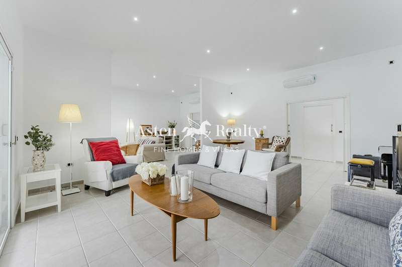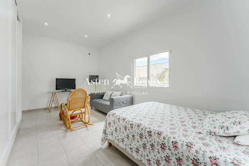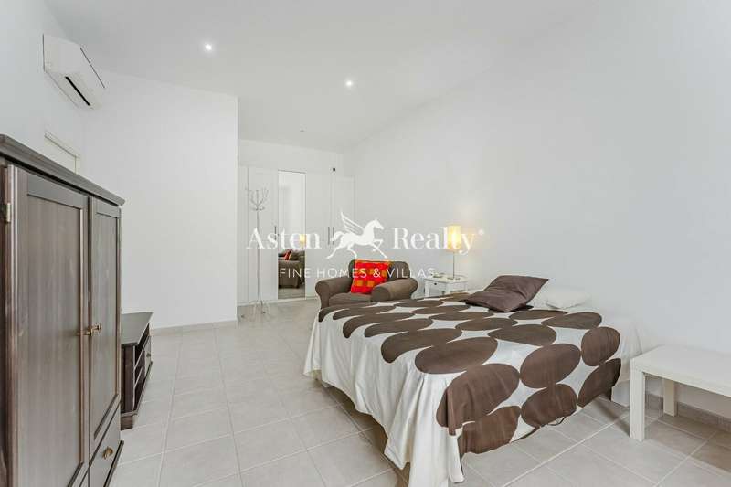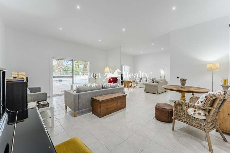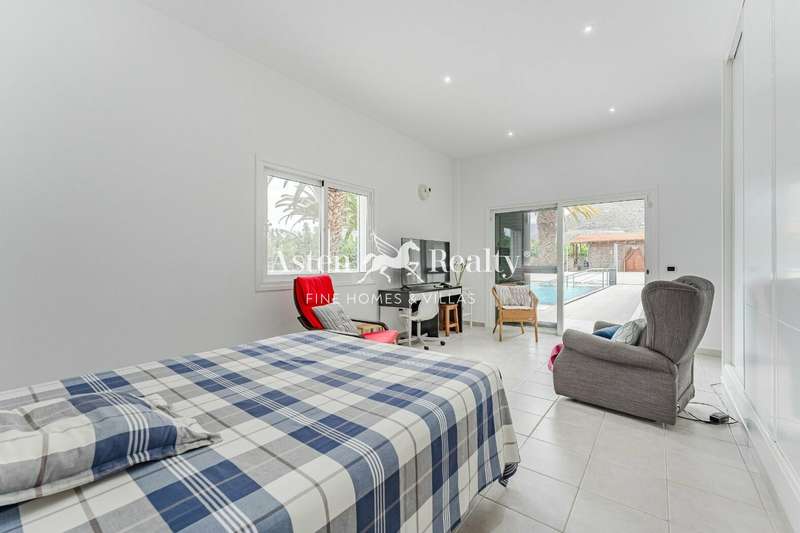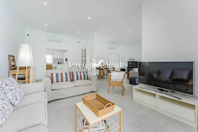 The interior of the house is open and bright, with high ceilings and air conditioning in all rooms. The original access from the garden, with vehicle entry, leads to various doors that connect directly to the pool area.