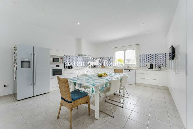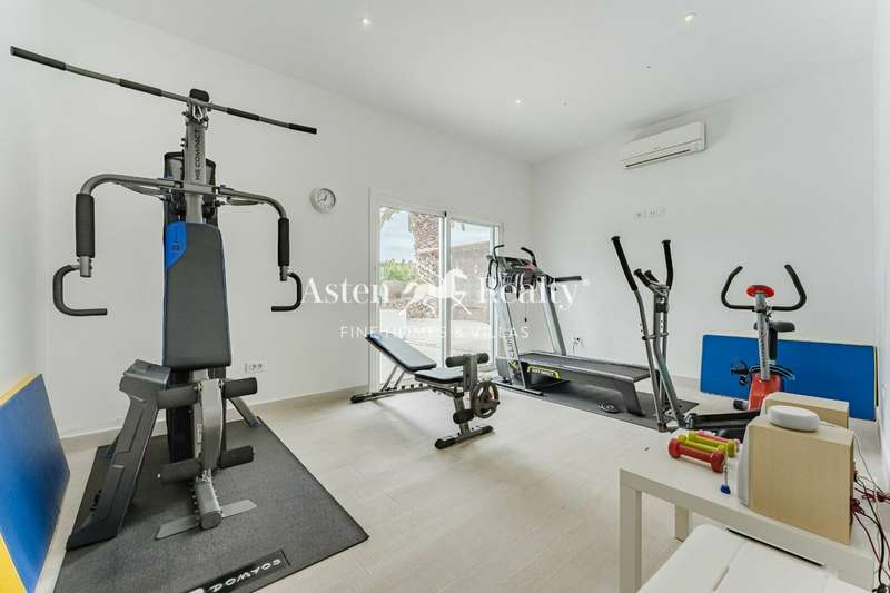 The property includes a private, fully equipped gym. The open-concept living-dining room integrates seamlessly with the pool and leads to a separate, fully equipped kitchen with a large table for ten diners. A second exit connects to the guest toilet and a spacious bedroom.