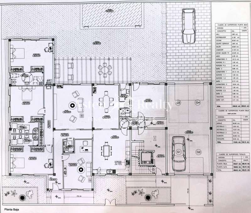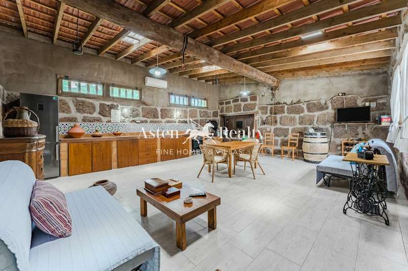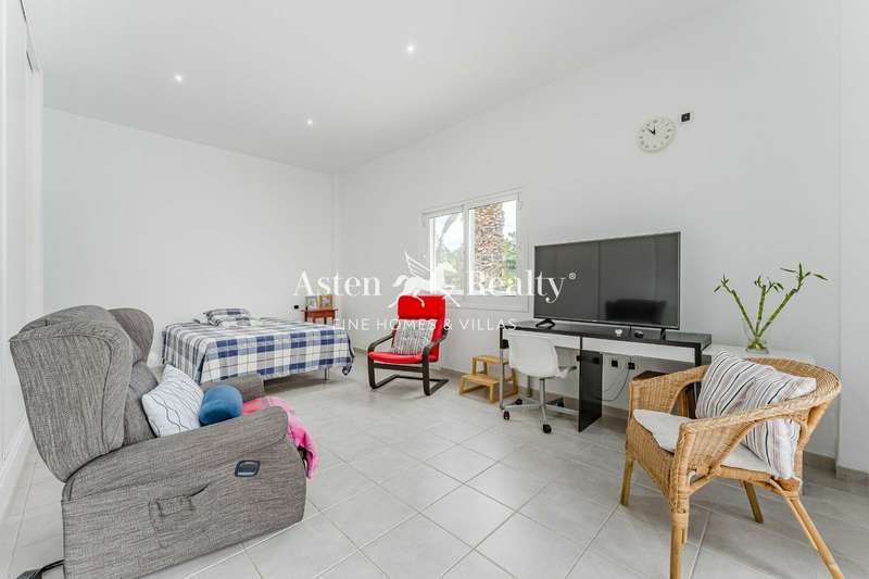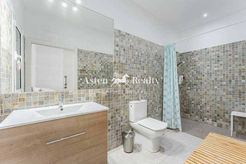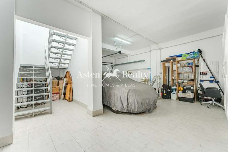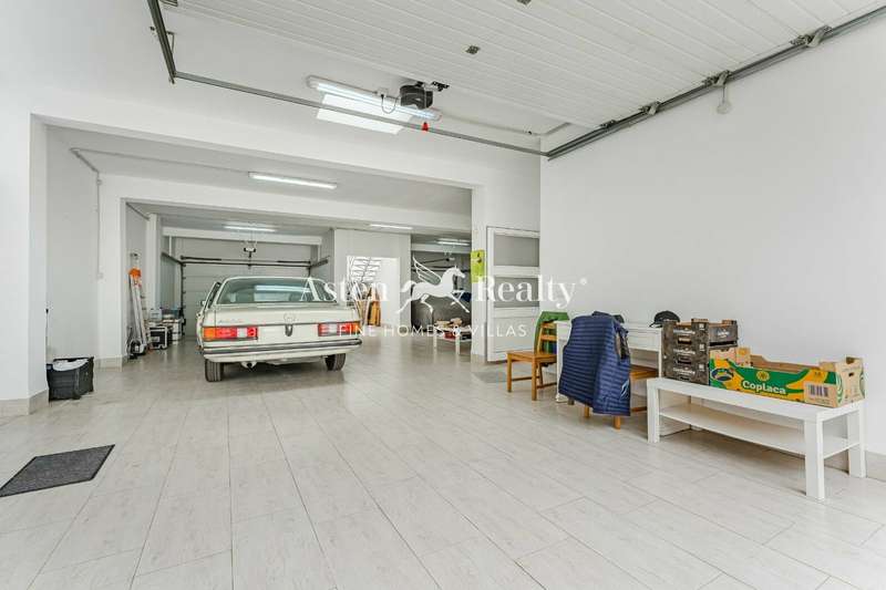 The garage accommodates five vehicles, with three automatic doors allowing entry and exit in both directions. This area also houses an office and a spacious auxiliary patio where the laundry room is located, equipped with numerous built-in wardrobes. Additionally, there is an approximately 80 m2 storage room currently unused, with potential to be converted into a second garage or an independent apartment.