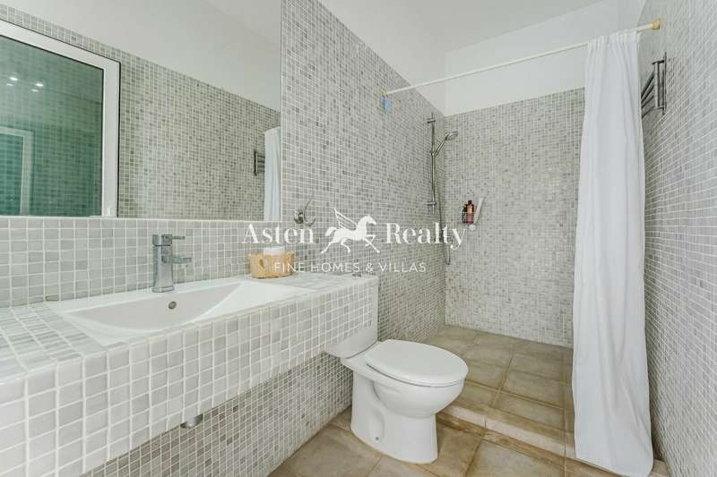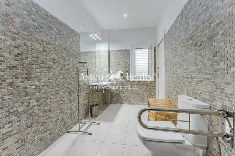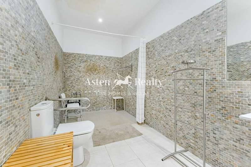 The sleeping area is strategically separated, with built-in wardrobes along the hallway. It features three large bedrooms, each with an en-suite wet room bathroom, adapted for wheelchair users. Some bedrooms have direct access to the terraces surrounding the house.