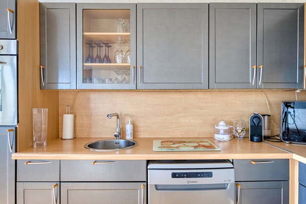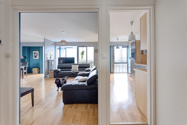 The generous volumes of the dual-aspect living room, the blue tones of the walls, and the omnipresent light create a peaceful and inspiring atmosphere. The separate, understated and functional kitchen extends this feeling of balance and clarity.