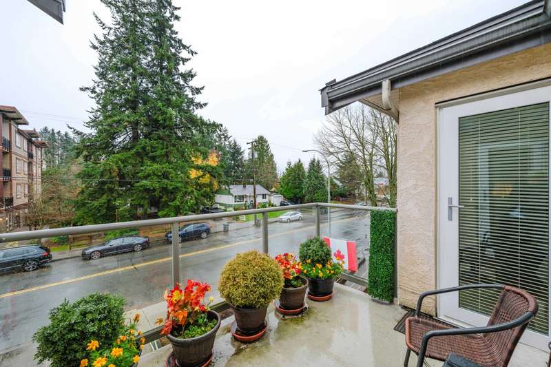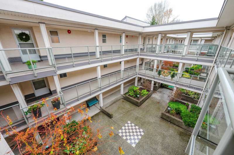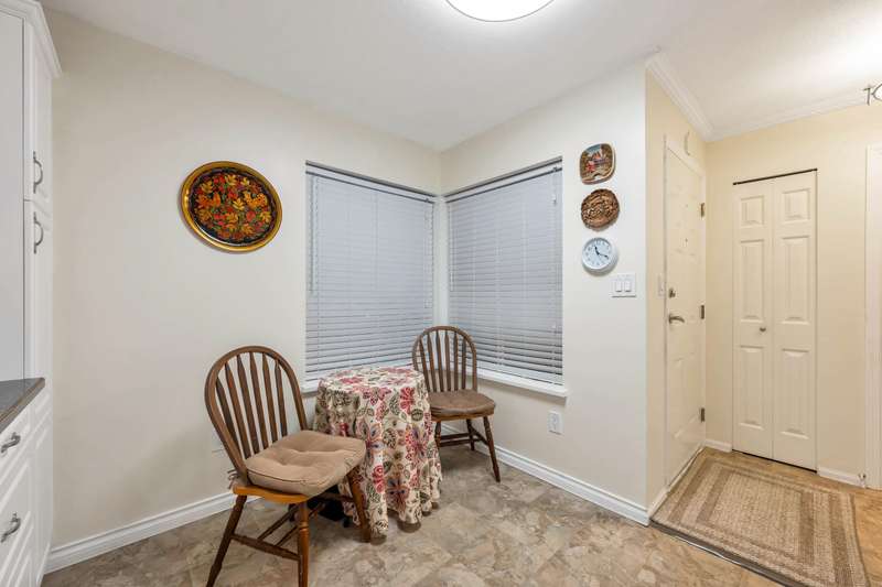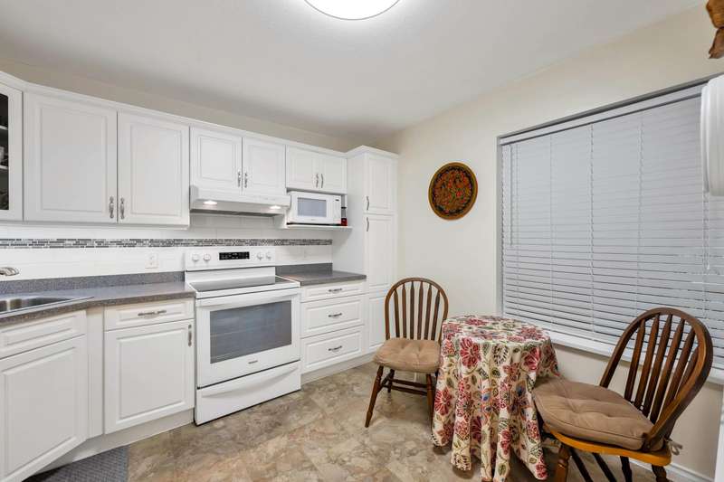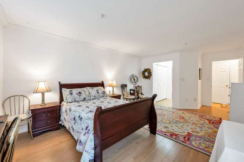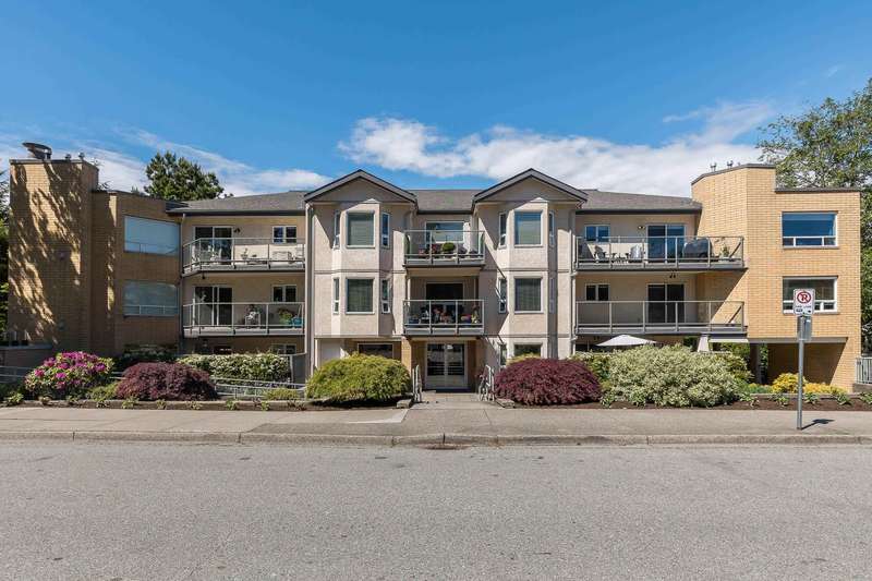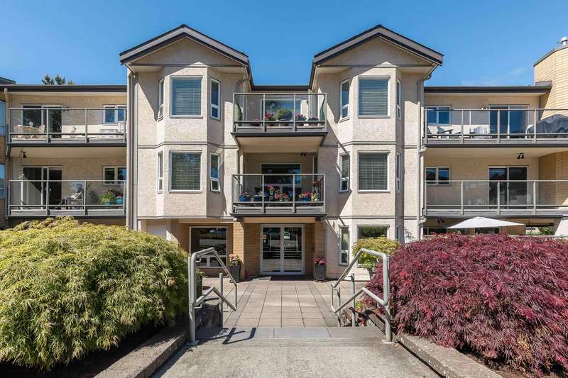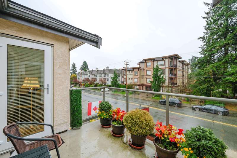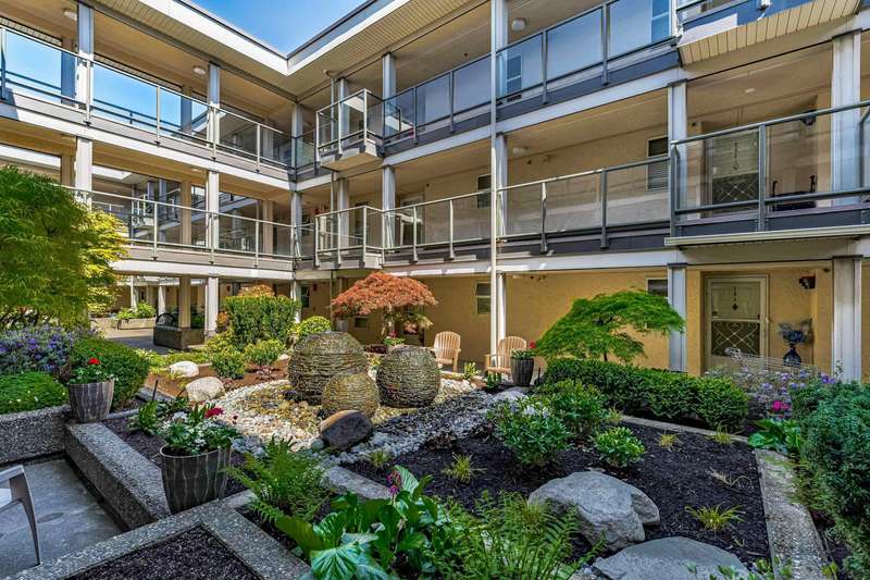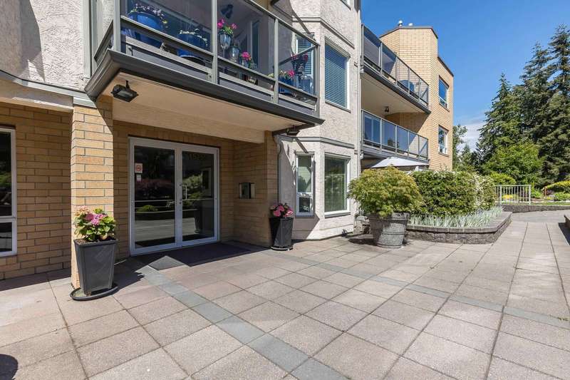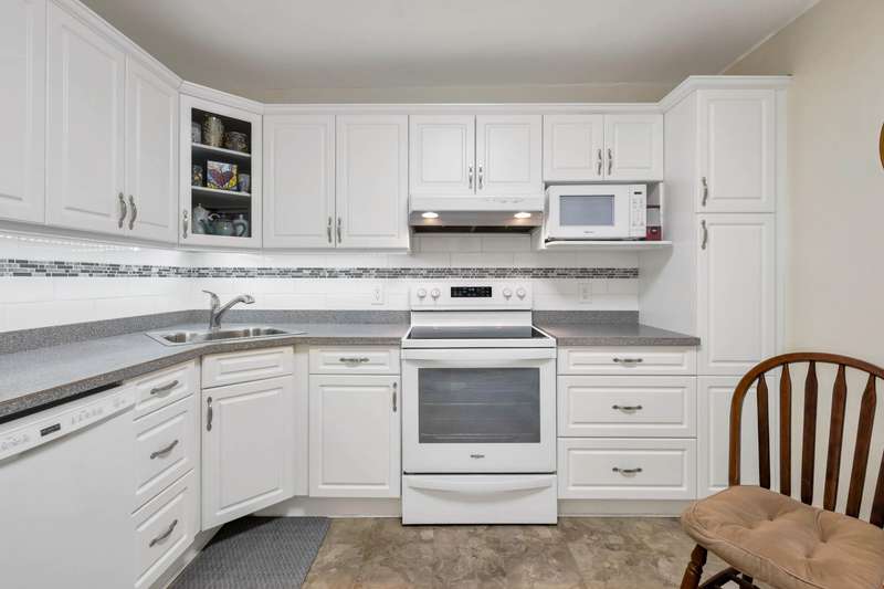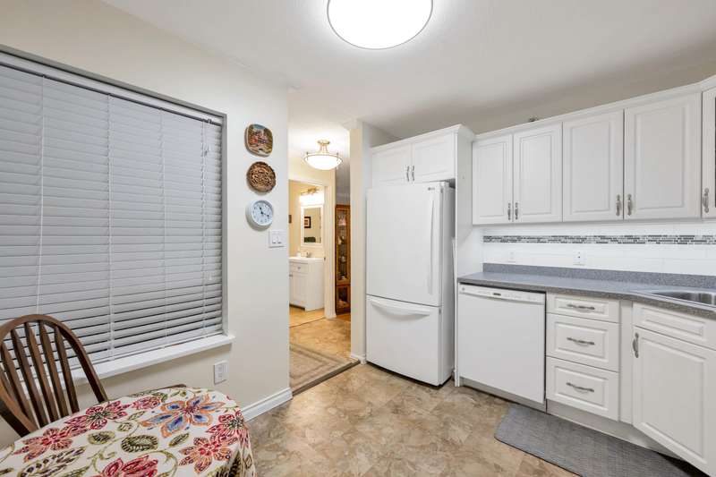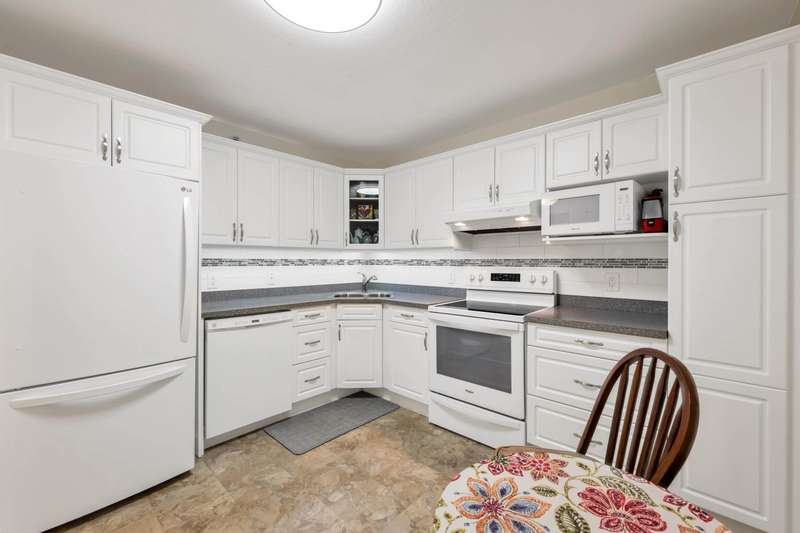 THE COURTYARDS. Lovely and bright two bedroom top floor condo with a south facing balcony to enjoy the sun. Spacious dining and living room with a south facing bayed window. Bright white kitchen with updated flooring, fridge and stove (2021), washer and dryer (2021). Huge primary bedroom has a bayed window, double closets and ensuite. The second bedroom has French doors off the living room and is being used as an office. Bathrooms have updated vanities, h/e toilets and flooring. Building was rainscreened several years ago and the roof, windows and doors were replaced too. Wonderful central location only steps to Semiahmoo Mall, public transit, the library, restaurants and Bakerview Park. Non smoking building and one pet is welcome. This home is ready for you to move right in!