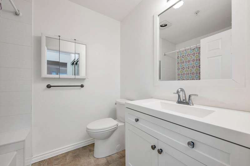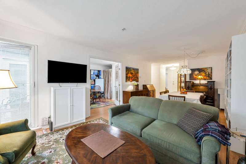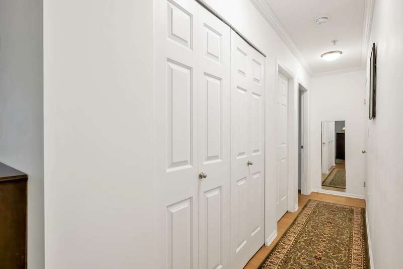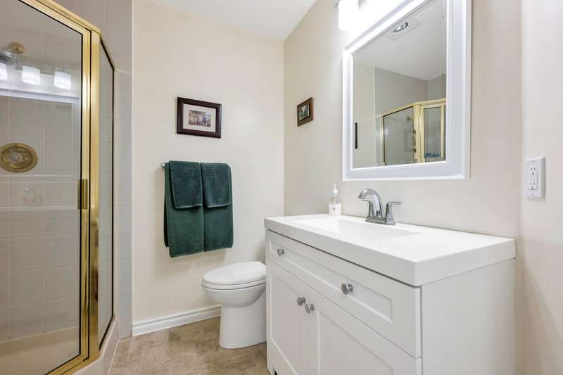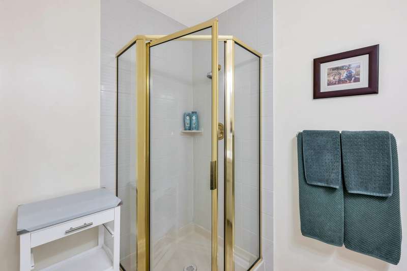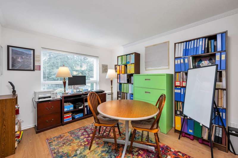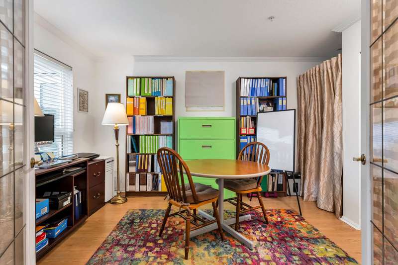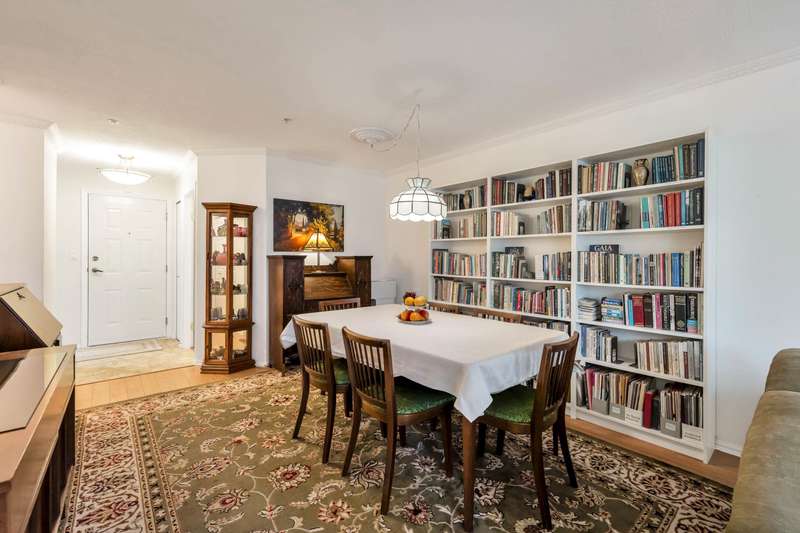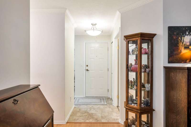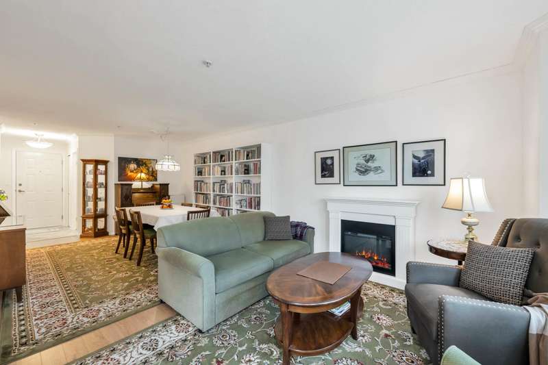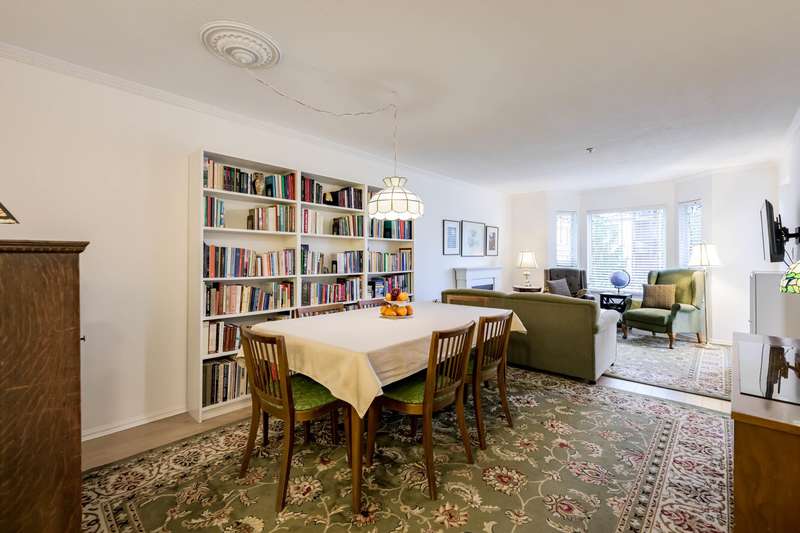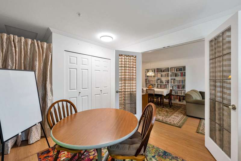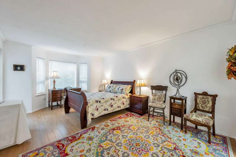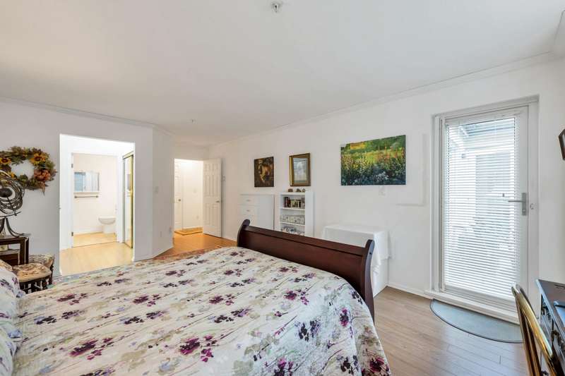 THE COURTYARDS. Lovely and bright two bedroom top floor condo with a south facing balcony to enjoy the sun. Spacious dining and living room with a south facing bayed window. Bright white kitchen with updated flooring, fridge and stove (2021), washer and dryer (2021). Huge primary bedroom has a bayed window, double closets and ensuite. The second bedroom has French doors off the living room and is being used as an office. Bathrooms have updated vanities, h/e toilets and flooring. Building was rainscreened several years ago and the roof, windows and doors were replaced too. Wonderful central location only steps to Semiahmoo Mall, public transit, the library, restaurants and Bakerview Park. Non smoking building and one pet is welcome. This home is ready for you to move right in!