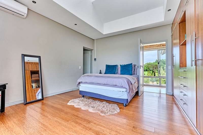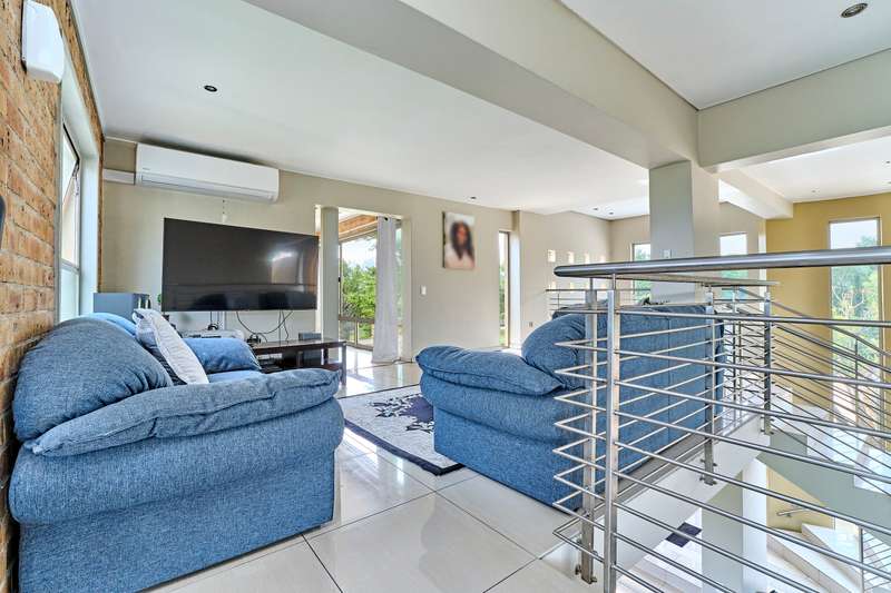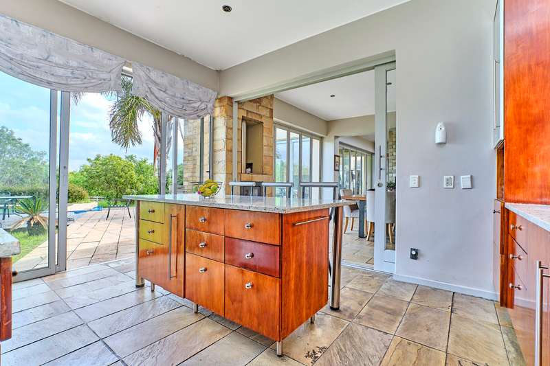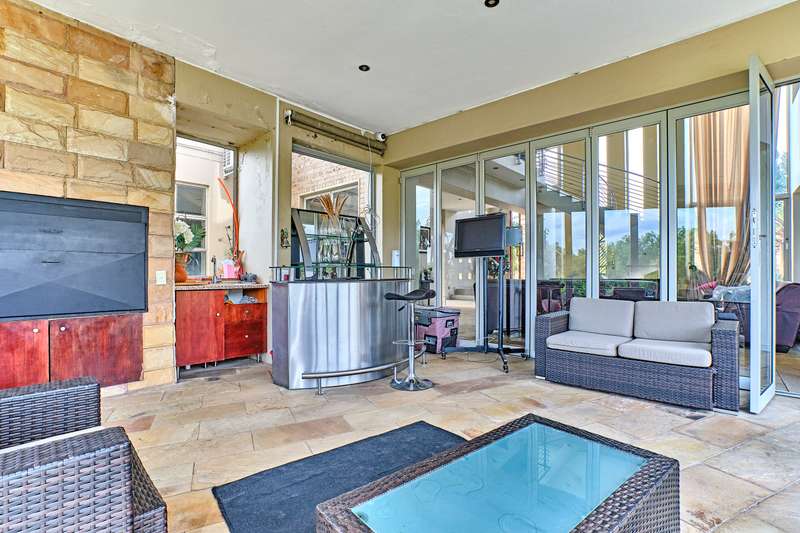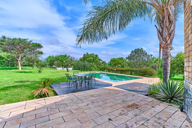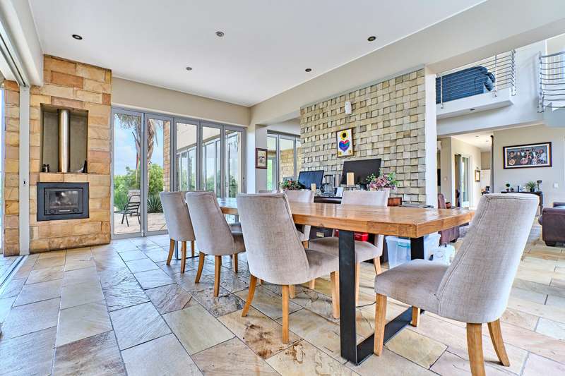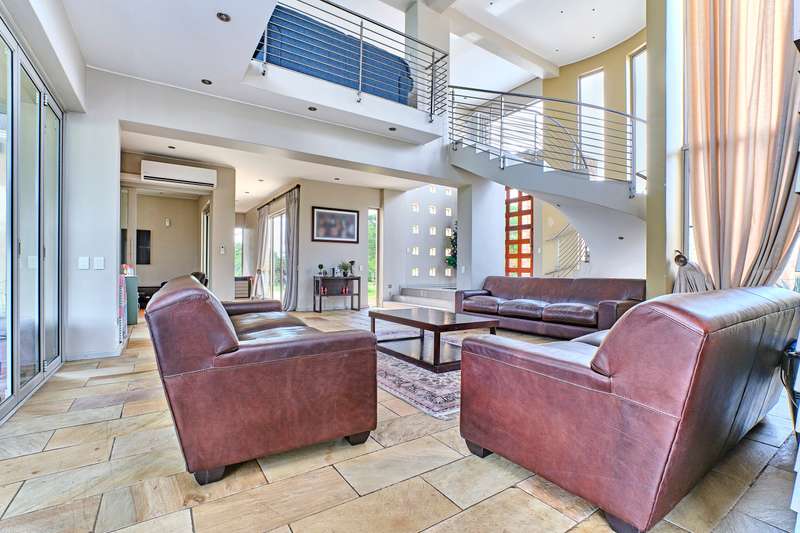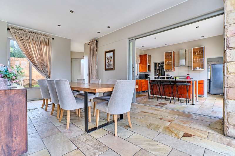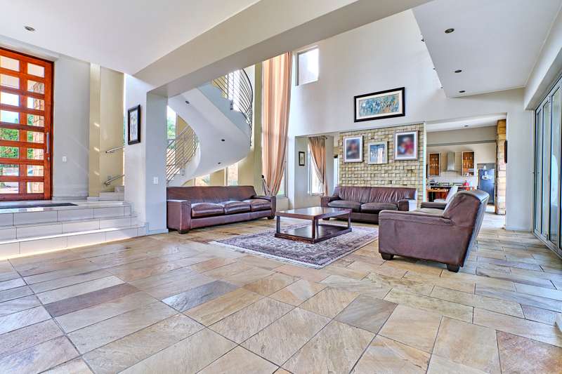 R9 300 000 This charming country house in the elite Saddlebrook Estate offers splendid views of the greater Sandton area. Approach this lovely family home via the Fever tree lined driveway, and immediately you experience a sense of freedom and space that the 1.25 hectare stand offers. Enter the home through a double volume front door into a more than 100m2 open plan lounge area. Enclosed by glass sliding doors off the main lounge is a private TV room. Set off to the right of the living area is a the guest room with bathroom. The guest room has two glass sliding doors/walls – one leading to the front garden, the other to the back garden. To the opposite side of the living area is the dining room which has a cosy fireplace, followed by the kitchen with lovely work space centre island, Smeg gas stove, separate scullery and walk in pantry. The kitchen also has a glass sliding door opening to the deck and heated, sizeable swimming pool. An enclosed patio, with glass stacking doors houses a bar and a built-in braai. Perfect for entertaining. Just past the pool is a firepit, always adding to the ambiance. Up the grand circular staircase which opens up to a pyjama lounge and study offset to one side. To the one side are two bedrooms, both en-suite, and on the opposite side is the master suite with little balcony, lovely views, walk in closet and full bathroom. The house has skylights in some of the rooms, and plentiful glass, allowing for an abundance of natural light throughout. This is a wonderful family home, allowing for privacy and quiet, but also perfect for entertaining. A borehole supplies water to the garden which has many beautiful large trees. Prepaid electricity. Three garages, domestic quarters complete the home. For horse enthusiasts, six horses are allowed per stand. Saddlebrook Estate offers country living within easy proximity to the conveniences of city living. Disclaimer: Whilst every care has been taken in the preparation of this listing, we cannot be held responsible for any errors or omissions that may occur.