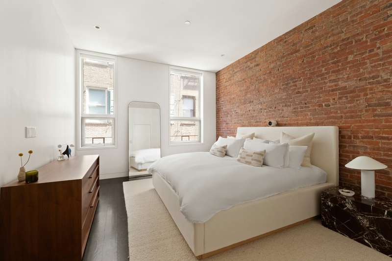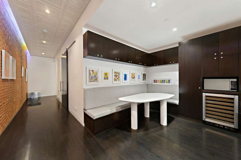 The Italianate cast-iron facade sets the tone, while inside, exposed brick, a striking tin ceiling, and newly installed wide-plank solid oak floors create a timeless yet contemporary living environment. Bright white walls and recessed lighting further enhance the loft's dynamic appeal.