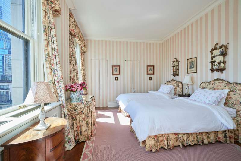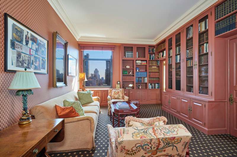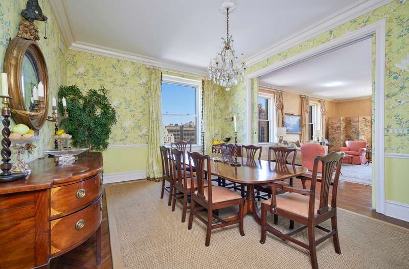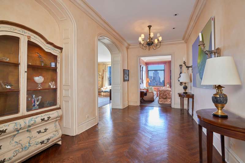 Grand, sun-flooded 3 bedroom residence with soaring 10+ foot ceilings and panoramic skyline views of Park Avenue and beyond -- reaching all the way to the East River. This elegant home is abound with classic pre-war details featuring: crown, dental and chair rail moldings, beautiful herringbone floors, oversized windows and copious closet space. One enters from the semi-private elevator landing into a stately formal entry gallery where a paneled archway leads to the 27-foot, expansive corner living room, with multiple seating areas and a marble-mantled gas fireplace. The traditional formal dining room is accessed from the living room through pocket doors, making this sublime home perfect for large or intimate entertaining. Off the dining room is a spacious windowed kitchen with glass-front cabinets and granite countertops replete with a sizeable walk-in pantry. On the far side of the gallery is the well-appointed library lined with custom bookcases, built-ins and a charming dry bar. The shared en-suite bath connects to the spacious second bedroom with light-filled Eastern views. A long, private hallway lined with mirrored floor-to-ceiling wardrobes accesses the enormous corner primary bedroom with walk-in closet and a luxurious en-suite bath. There is central air in the public rooms and a basement storage unit is included. Can be combined with neighboring apartment 16AE to create a full floor residence.