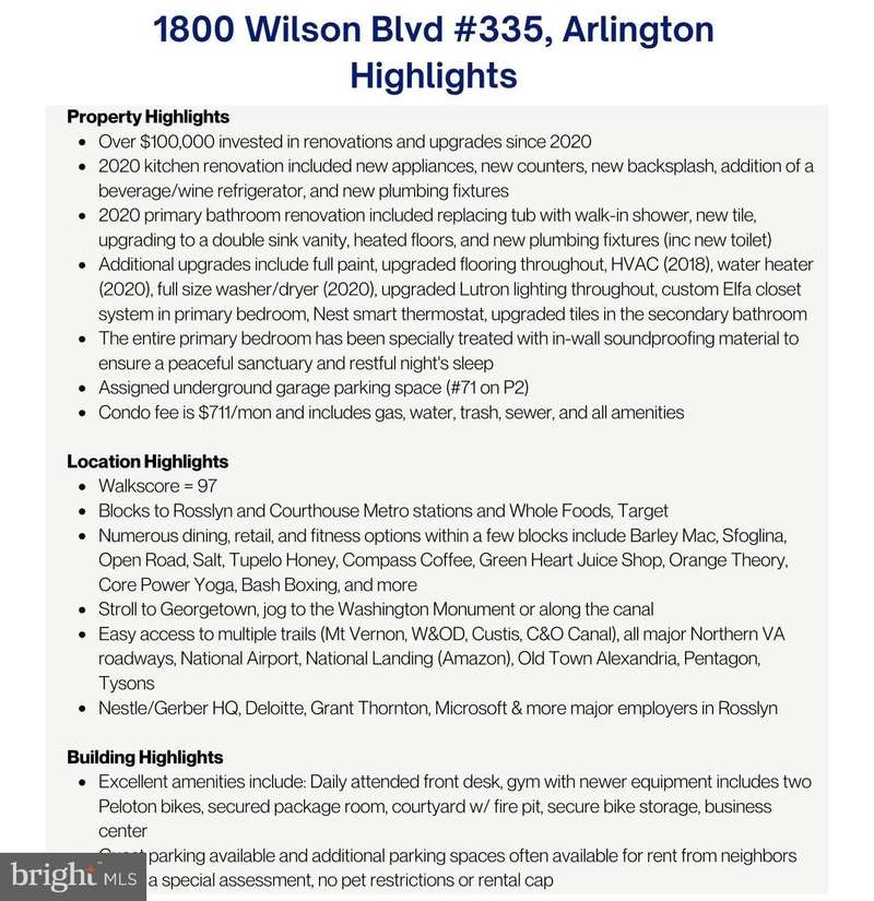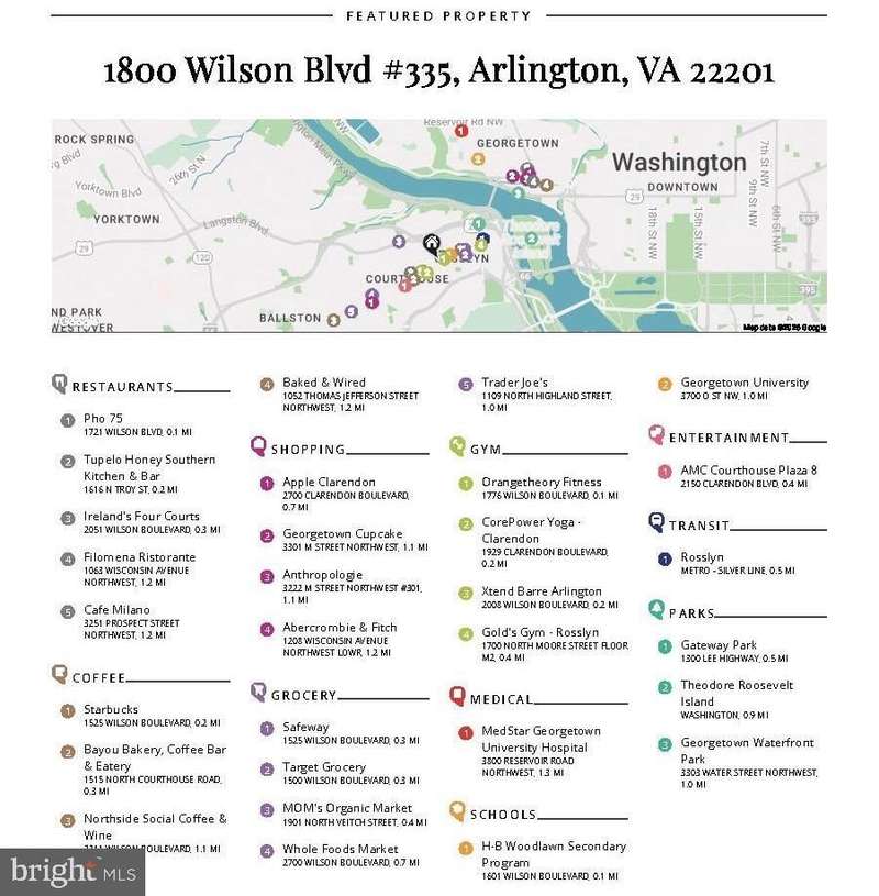 WHAT MAKES THIS LOCATION STAND OUT? Walkscore = 97! Blocks to Rosslyn and Courthouse Metro stations. Numerous dining, retail, and fitness options within a few blocks include Barley Mac, Sfoglina, Open Road, Salt, Tupelo Honey, Compass Coffee, Green Heart Juice Shop, Orange Theory, Core Power Yoga, Bash Boxing, and more. Stroll to Georgetown, jog to the Washington Monument or along the canal, and walk to Whole Foods or Target! Easy access to multiple trails, all major Northern VA roadways, National Airport, National Landing (Amazon), Pentagon, Tysons, and more! Nestle/Gerber HQ, Deloitte, Grant Thornton, Microsoft, & more major employers in Rosslyn.