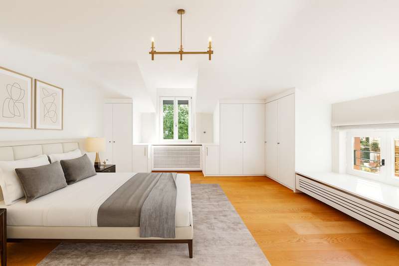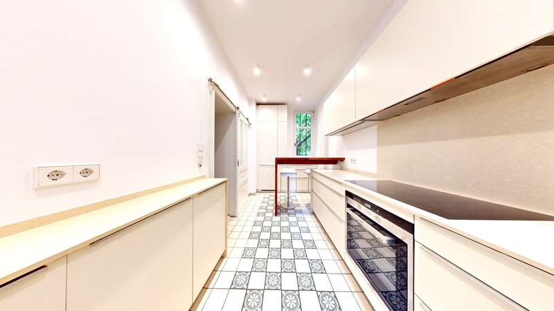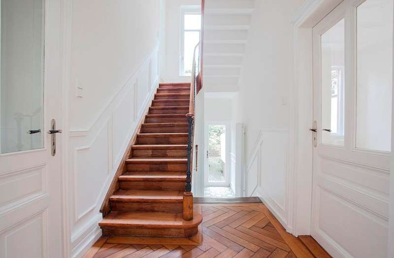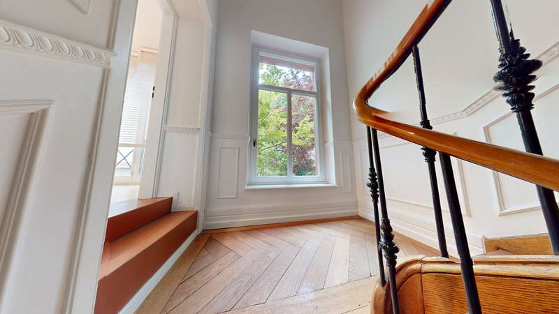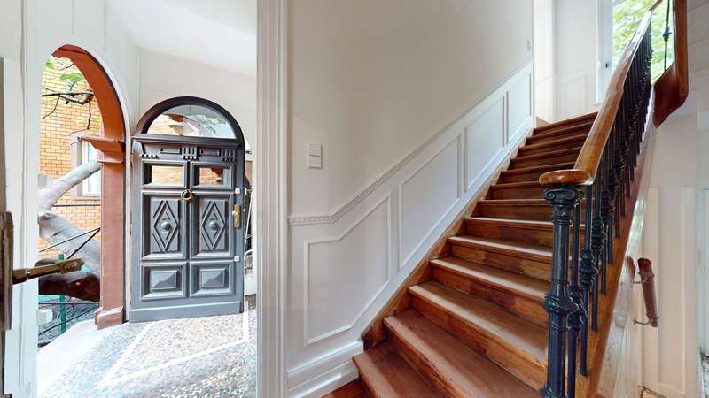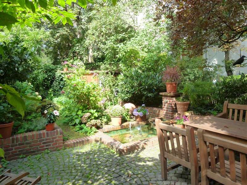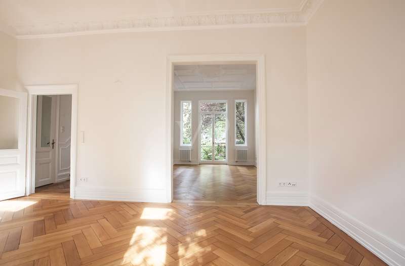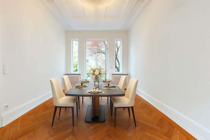 The late classicist town house built in 1880 in the Wilhelminian style is an absolute rarity in Frankfurt's Westend. The historic building ensemble consists of several listed clinker brick townhouses and impresses with its stylish historic appearance. The upscale neighborhood in Westend-Nord provides a quiet residential area and at the same time a perfect micro-location with excellent shopping and leisure facilities and in the immediate vicinity of Grüneburgpark and Palmengarten. The stately property has been thoroughly and extensively renovated and lovingly revitalized in keeping with the style of the listed building, so that all stylistic elements are retained: Approx. 3.50 m high ceilings with restored lavish original stucco ornaments, fine wooden window frames with large glass surfaces and antique handles, doors true to the original, noble historic wooden staircase with elegant banisters and the solid high-quality herringbone parquet flooring create a cultivated living flair. The future owner does not have to undertake any time-consuming and costly renovations and could move straight in! The entrance hall with hallway is entered through an original front door and historic porch: two representative light-flooded salons with period features and stucco ceilings lead onto the charming terrace, which has a stone staircase leading to the garden. The romantically ingrown and lovingly landscaped garden with fountain is a green, quiet and dreamy oasis in the middle of the Westend. The comfortable branded kitchen in elegant light tones offers modern appliances for comfortable cooking. There are two light-flooded spacious bedrooms on the second floor and a further two friendly rooms on the top floor, as well as two luxurious daylight bathrooms with walk-in showers and modern design objects. The elegant historic town villa for discerning living aesthetes combines late classicist architecture with contemporary, comfortable living. The property in Anglo-Saxon townhouse style is a cultural monument in Frankfurt that is second to none! Townhouse flair of London, New England or Amsterdam with nostalgic elegance - in the middle of the Westend!