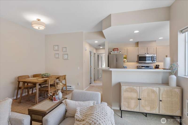 Updated 2 bed/1 bath townhouse. Light & bright S facing unit w/great natural light. Kitchen boasts quartz counters, refreshed cabinets/hardware, new appliances & sensor lighting. Open to dining & living rm w/vaulted ceilings, cozy wood burning fireplace & built in shelves. Xtra pantry + new W/D across from kitchen. Bathroom features new flooring, new vanity, new fixtures & reglazed tub. Generous primary w/walk in closet. New LVP flooring, new thermostat, new H2O heater, updated pex pipe + updated light fixtures & window treatments. The garage...huge bonus! 48 amp EV charging w/load balancer on 100 amp panel. Finished out & painted, w/shelving, workbench & loft storage. A standout unit! NO RENTAL CAP! Close to parks/shopping/commuter routes.