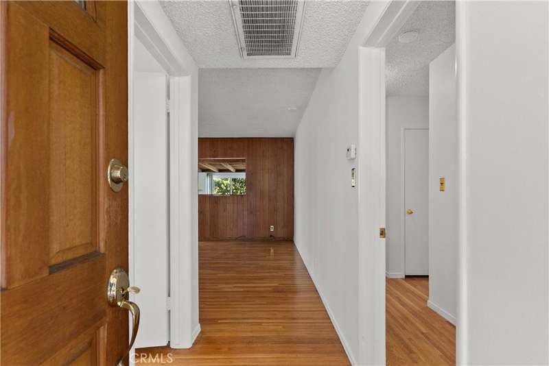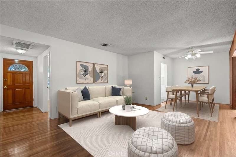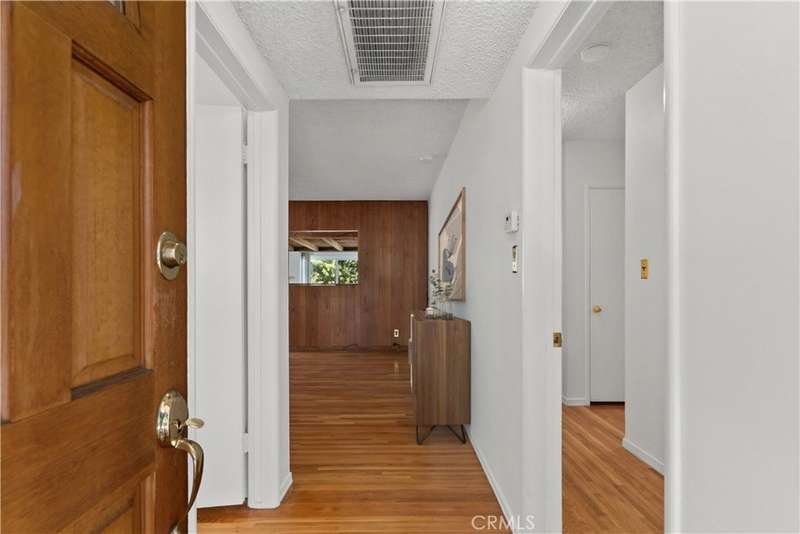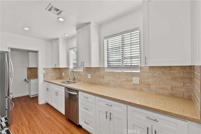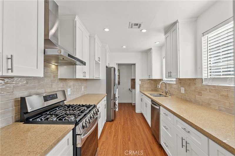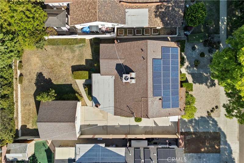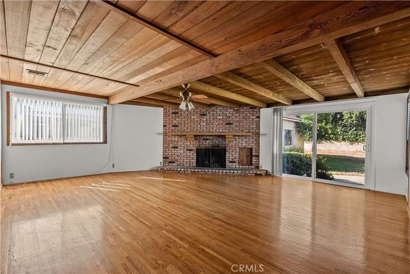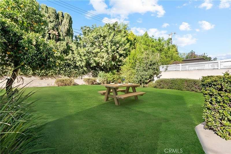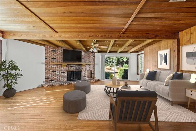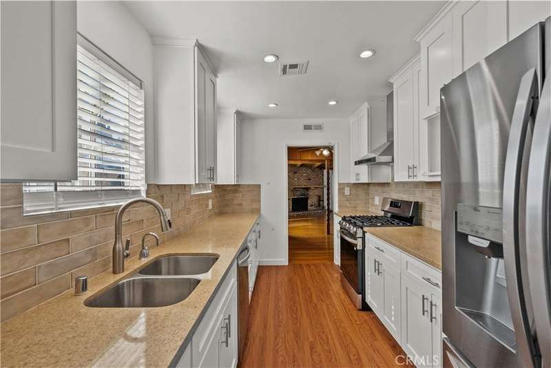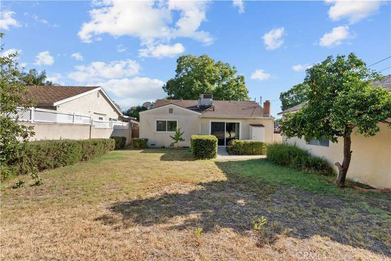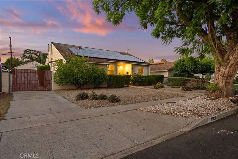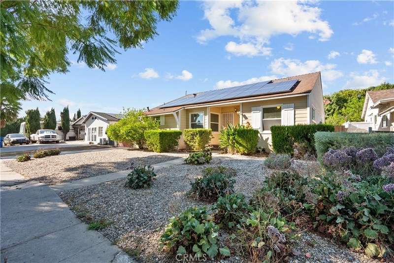 Tucked away on a quiet, tree-lined street in the sought-after Granada Hills neighborhood, this delightful mid-century home offers the perfect combination of vintage character and modern upgrades. Surrounded by a friendly, well-kept community, this home is ideal for comfortable family living. A welcoming front porch leads into a warm and inviting interior featuring hardwood floors, abundant natural light, and timeless architectural details throughout. With three bedrooms and two bathrooms, this home provides generous space for both relaxing and entertaining. The heart of the home is the remodeled cook’s kitchen, showcasing recessed lighting, crisp white shaker cabinets, quartz countertops, and a classic subway tile backsplash. Quality appliances include a gas range with vent hood, dishwasher, and refrigerator. Just off the kitchen is a functional laundry room with storage and access to the side yard. The cozy living room connects seamlessly to a dedicated dining area, accented by hardwood flooring and a ceiling fan light fixture—perfect for daily meals or festive gatherings. A spacious family room features wood-beamed ceilings, a brick fireplace, and sliding doors that lead to a private backyard, blending indoor comfort with outdoor living. The primary bedroom offers hardwood floors, dual closets, and an en-suite bathroom with a tiled stall shower and separate vanity. Two additional bedrooms are bright and well-sized, each with ceiling fans, hardwood floors, and ample closet space. A full hallway bathroom with a tiled shower-over-tub and a vanity serves these rooms. Step outside to the private backyard with a sprawling lawn and mature greenery—an ideal space for entertaining, play, or peaceful retreat. The extended concrete driveway and detached two-car garage offer abundant parking and storage. Thoughtful upgrades include central air and heat, dual-pane windows, mostly copper plumbing, a 100-amp electrical panel, and an owned energy-efficient solar system for lasting savings. The large backyard with detached garage provides excellent potential for a freestanding Accessory Dwelling Unit (ADU).Conveniently located near schools, shopping, dining, and freeway access, this move-in ready gem combines classic style with today’s comforts—ready for you to call home.