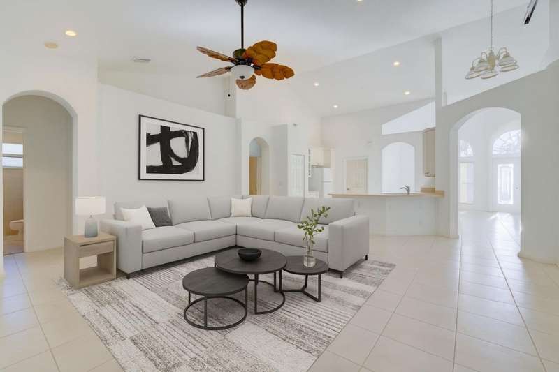 This stunning home was built by Royal Professional Builders with poured concrete and insulated walls for lasting strength and efficiency. The popular Liberty model offers a spacious floorplan with 4 bedrooms plus a den that easily converts to a 5th bedroom, 3 full baths, and a 2-car garage.One of the baths doubles as a cabana bath with direct access to the screened-in pool and patio--perfect for entertaining. The kitchen has been recently upgraded with new quartz counters, stainless steel sink, modern faucet, and a custom tile backsplash.Inside, soaring ceilings and an open-concept layout create a light, airy feel that makes the home live even larger. Outside, enjoy the spacious fenced yard, covered and screened patio or take a dip in the custom-built pool with heated spa.