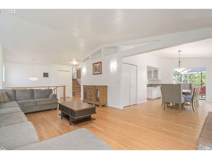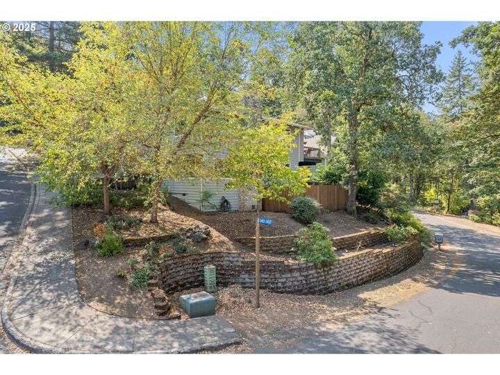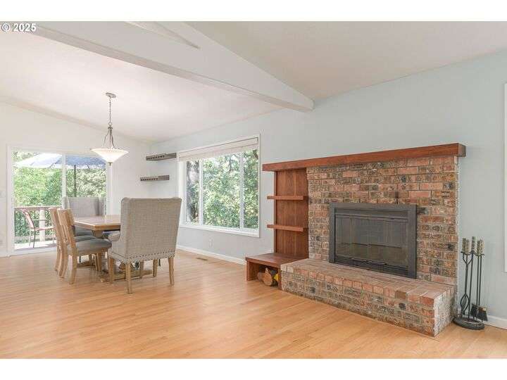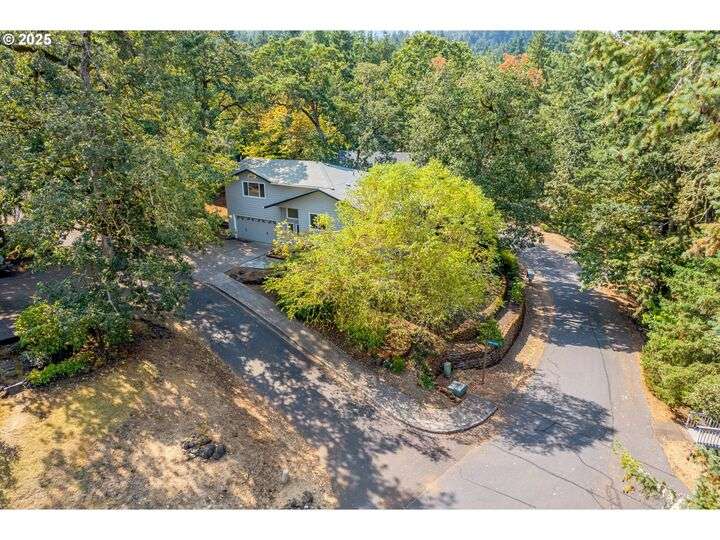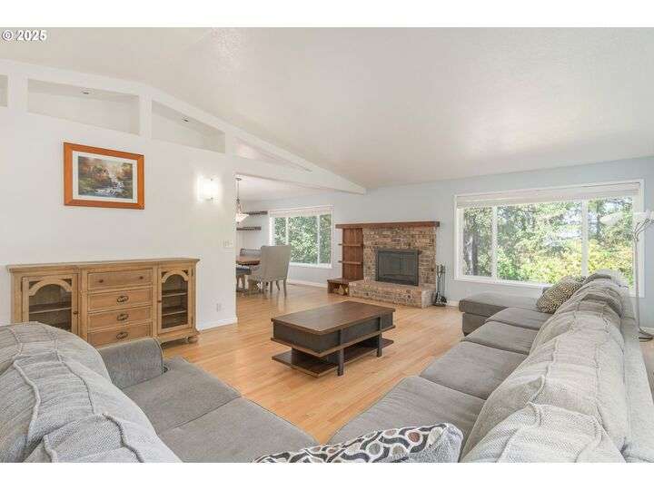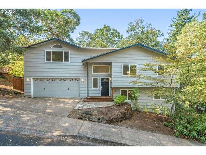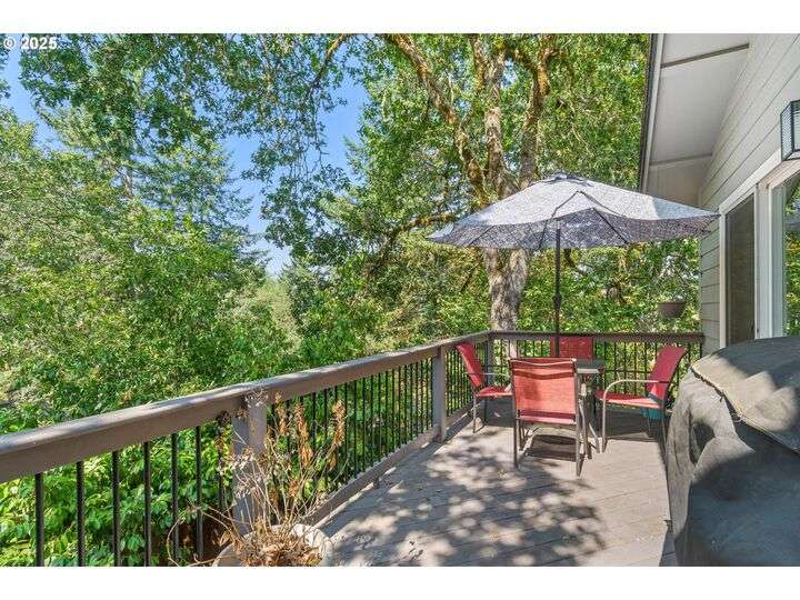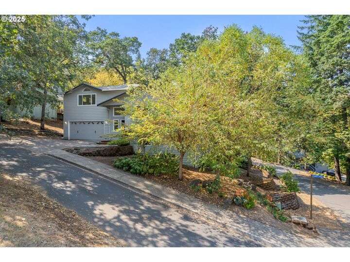 PRICE REDUCED! This spacious Northwest contemporary offers tremendous separation of space throughout its well-designed 2350 sq ft and wow is it peaceful! Rooms are large with high ceilings and big windows that frame Eugene and the surrounding hills -- all while preserving quiet and privacy throughout. On the main level, a huge living room with vaulted ceiling and cozy brick fireplace, spacious dining room, kitchen with granite and stainless steel appliances, and slider to a private deck in the treetops. Up a few steps is a large family room with built ins that is absolutely bathed in natural light. Down a few steps is the primary bedroom suite with walk in closet, bathroom with double sinks and private patio, plus 2 more bedrooms. The main level office could easily become a 4th bedroom. The lovely yard has low-maintenance landscaping and is fully fenced. Level driveway and 2-car garage. Newer roof, fencing, new laminate flooring on 2 levels (plus beautiful hardwood on the main). Incredibly solid and welcoming home. OPEN HOUSE SUNDAY 10/11 FROM 12-2.