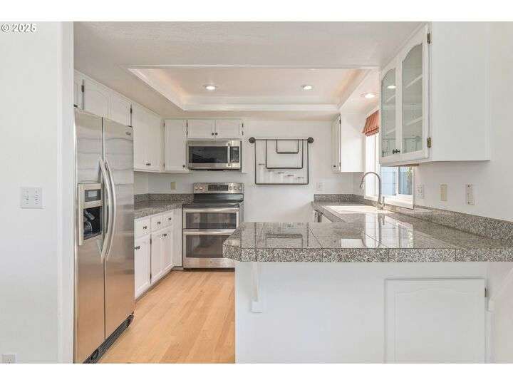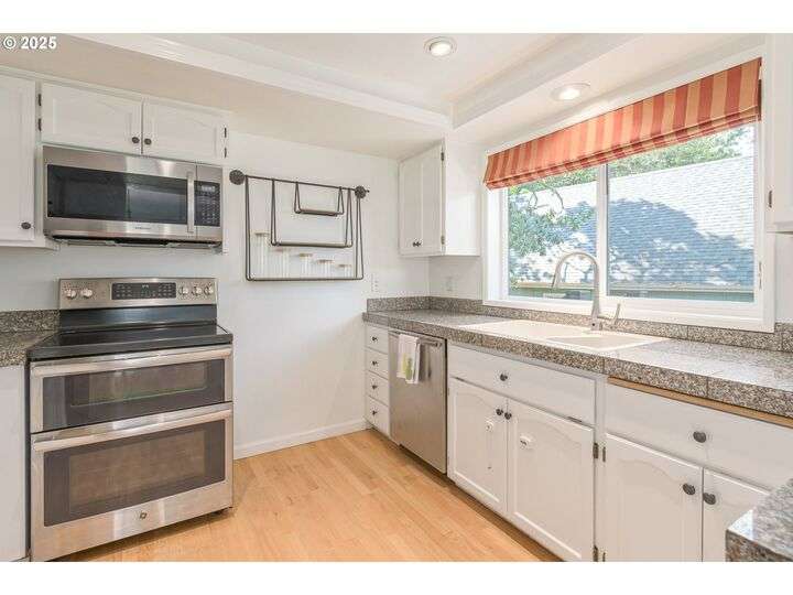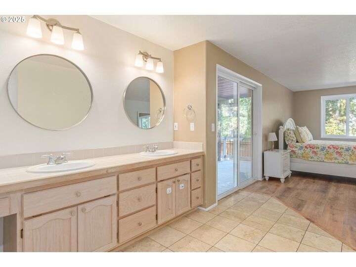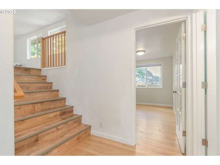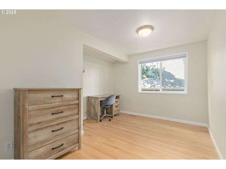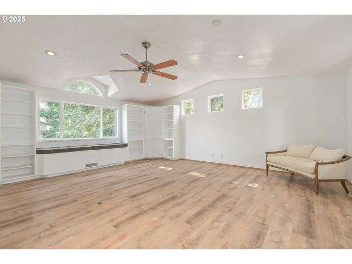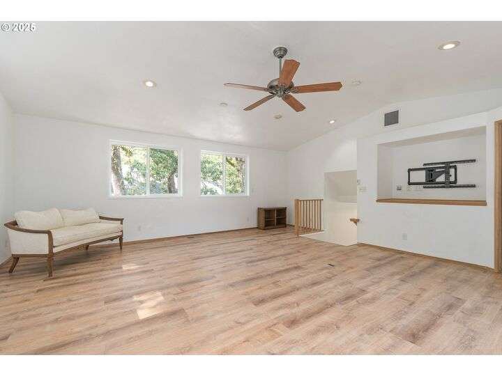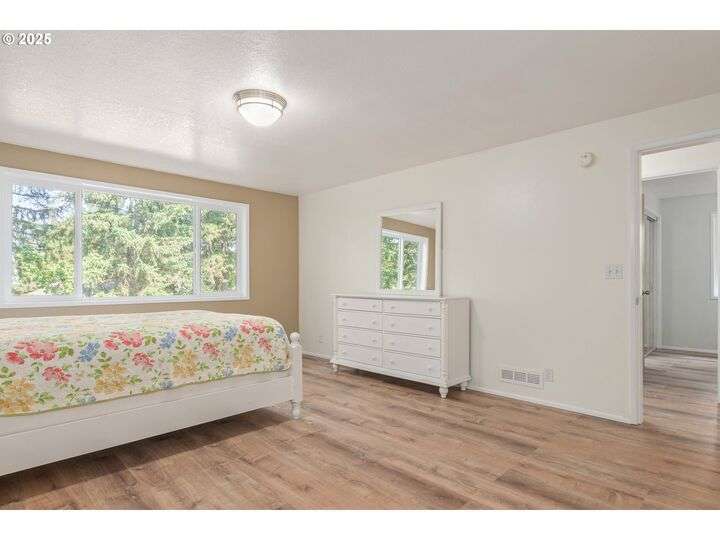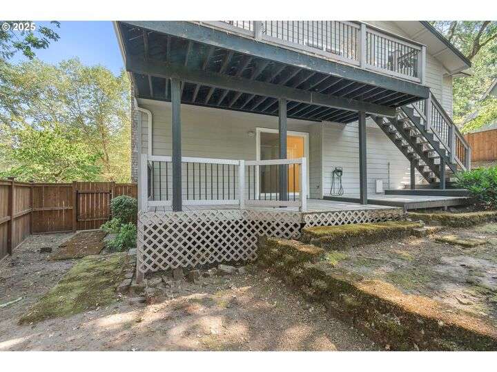 PRICE REDUCED! This spacious Northwest contemporary offers tremendous separation of space throughout its well-designed 2350 sq ft and wow is it peaceful! Rooms are large with high ceilings and big windows that frame Eugene and the surrounding hills -- all while preserving quiet and privacy throughout. On the main level, a huge living room with vaulted ceiling and cozy brick fireplace, spacious dining room, kitchen with granite and stainless steel appliances, and slider to a private deck in the treetops. Up a few steps is a large family room with built ins that is absolutely bathed in natural light. Down a few steps is the primary bedroom suite with walk in closet, bathroom with double sinks and private patio, plus 2 more bedrooms. The main level office could easily become a 4th bedroom. The lovely yard has low-maintenance landscaping and is fully fenced. Level driveway and 2-car garage. Newer roof, fencing, new laminate flooring on 2 levels (plus beautiful hardwood on the main). Incredibly solid and welcoming home. OPEN HOUSE SUNDAY 10/11 FROM 12-2.