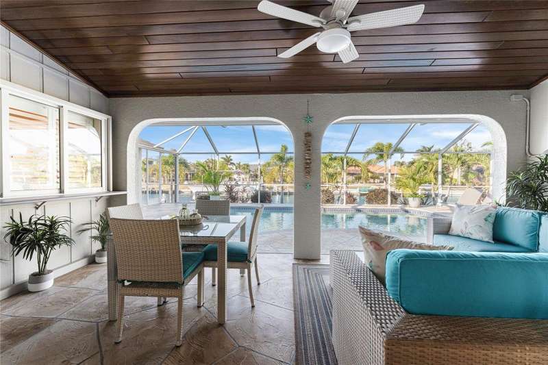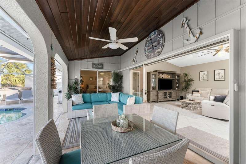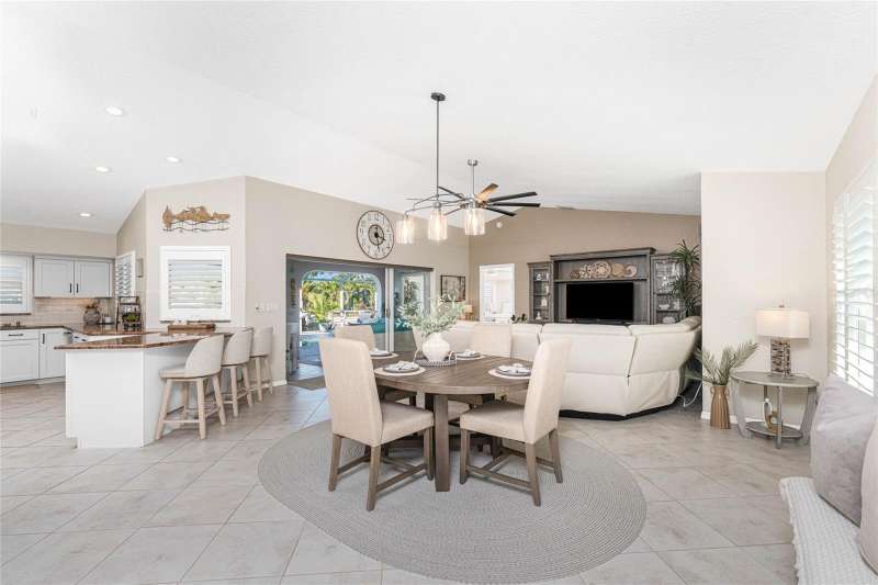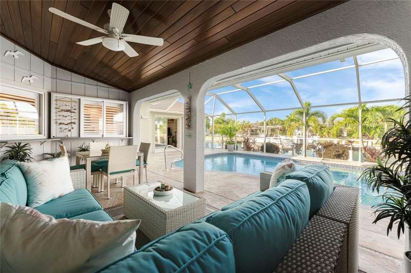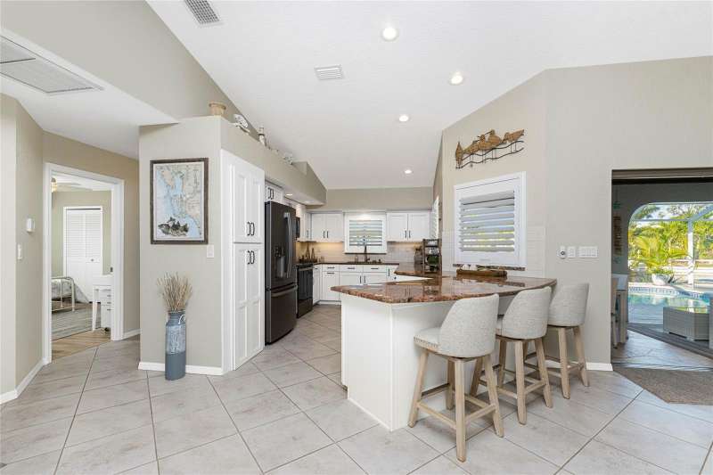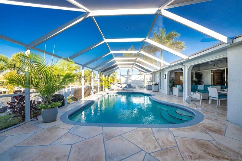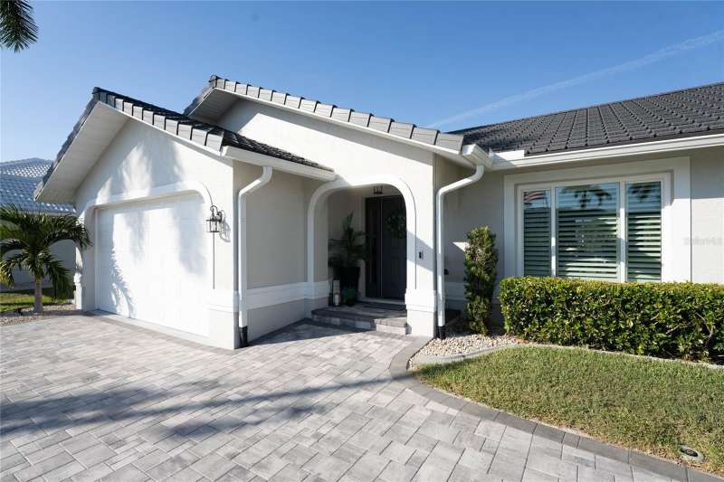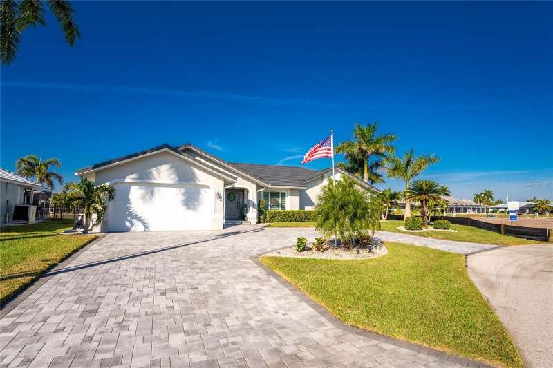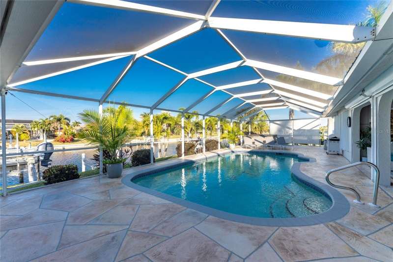 A handsome circular, paver driveway welcomes you to your very own sanctuary in paradise. You will love how smartly this 3 bedroom, 2 bath home has been updated. The completely open floor plan in the living areas really lends itself to entertaining, and the split bedroom floor plan gives the primary bedroom privacy from your guests that stay overnight. The guest wing boast 2 roomy bedrooms, each with double closets, ceiling fans and plantation shutters. One of them has power blinds on a slider that gives access to the pool. The great room tile flooring is laid on the diagonal to make it truly unique and the vaulted ceiling makes it light and airy. The 12 foot slider disappears into the wall for a seamless entertaining space that spills from the great room to the outdoor lanai with it’s tongue and groove wood ceiling, 6 person hot tub in the screened pool area. The nicely updated kitchen has lustrous, granite counters, smart looking, soft close cabinets, and a big deep sink. The new (2025) range, microwave and fridge, pass through window to the lanai and convenient breakfast bar complete the user friendly kitchen. The generously sized laundry room has the 2023 washer & dryer, a sink and convenient, built in ironing board. The front windows are impact rated, the side windows have accordion shutters and the lanai has motorized, kevlar shields for full hurricane protection. The 60 foot concrete dock, 111 foot (city maintained) seawall and 10,000 lb boat lift just 12 minutes to the Fisherman’s Village inlet is the ultimate attraction for the boater and fisherman. A boat in the backyard is the reason most of us move to Punta Gorda Isles. An optional civic association (PGICA) has a sub-club for nearly every interest (including 4 boat clubs!) and is an amazing way to meet like minded, new friends. Our charming town has a historic district of well maintained, vintage homes with brick streets, multiple waterfront parks, 2 free boat ramps, a 24 court world class pickleball complex called PicklePlex, a dog park, wildlife center, botanical garden, a history park with an artisan village and Sunday farmer’s market next to the new library. A downtown with shops, many great restaurants a Saturday farmer’s market. Fisherman’s Village draws visitors from miles around and has even more shops and restaurants. Sunseeker Resort is just over the bridge so you cannot be bored here unless you want to be! We even have our own airport where Allegiant jets take off for over 40 destinations! If you have been looking for your paradise, and you found Punta Gorda, you are lucky indeed!