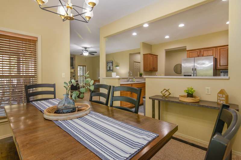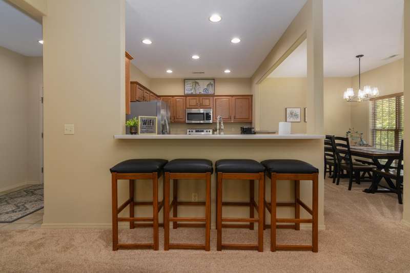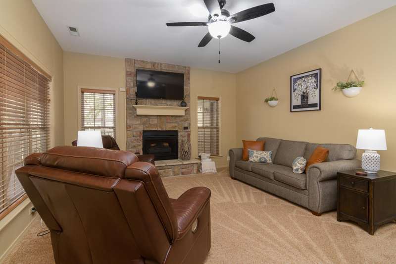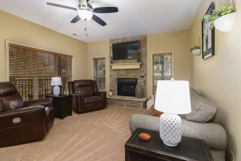 This spacious condo has a GREAT FLOORPLAN and a GARAGE View the GOLF COURSE from the LARGE SCREENED IN PATIO! Very Peaceful Atmosphere. You may rent this condo nightly or live here. The distinctive floorplan of the condo makes for comfortable living. Enjoy the new electric fireplace. No worries about the HVAC which was recently replaced in 2024 and has a 10 year warranty. The hot water heater was replaced in 2023. The ceilings have been recently painted. The living room and dining furniture were purchased in 2021 as well as the stainless steel kitchen appliances. The sofa bed in the living room adds some extra sleeping space and all the mattresses were purchased new in 2021. The master closet which is currently locked is very spacious. You will have two extra parking spaces in front of the garage because of this condos unique location. There is also another undesignated parking space in front. This is a great condo in a wonderful community with lots of great amenities as well as a very nice restaurant. It is MINUTES FROM SILVER DOLLAR CITY, GREAT HIKING TRAILS,THE LAKES AND THE BRANSON STRIP! LOTS OUTLET STORS NEARBY AS WELL.! So much to ENJOY!