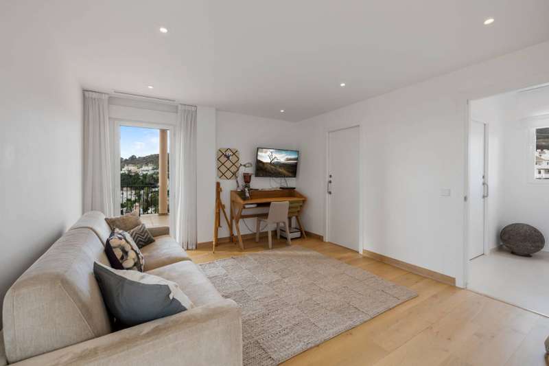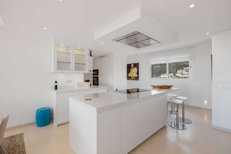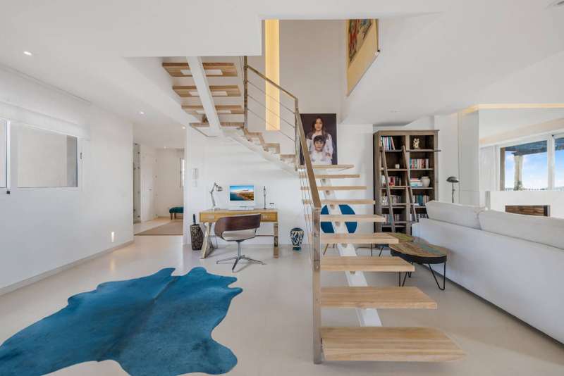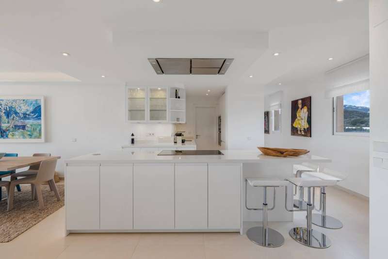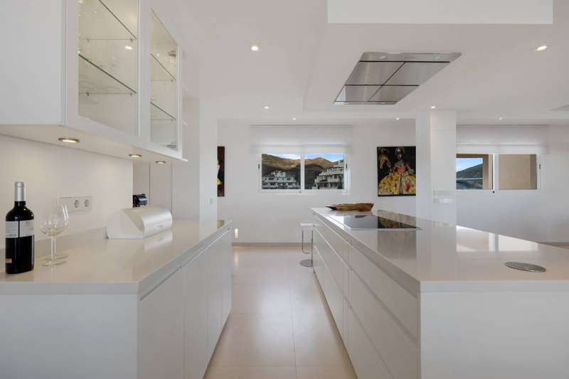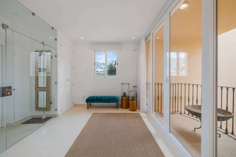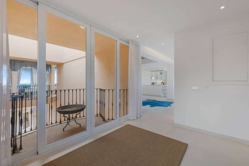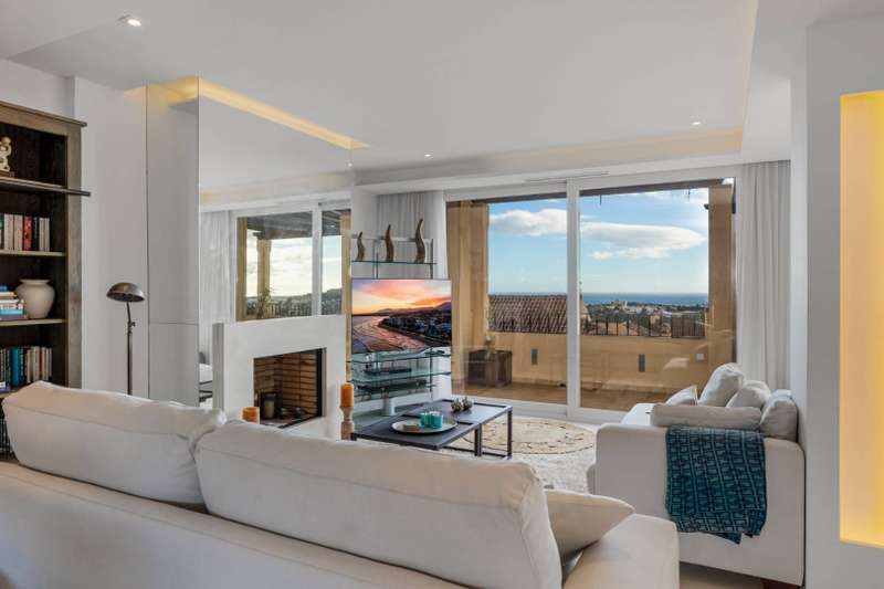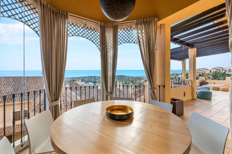 This magnificent duplex penthouse, with 4 bedrooms, offers jaw-dropping panoramic views over Nueva Andalucía and the glistening sea beyond. Originally two separate units, this property has been masterfully transformed into a single, seamless space within its residential complex. The elevator opens directly into the penthouse, where the open-plan area illuminated by generous natural light shows off the design and spaciousness. The lower level presents a vast living and dining space, flawlessly merging with an open-concept kitchen, a strategically tucked away laundry room, alongside 2 bedrooms and 2 bathrooms. Each room flows into an extensive terrace, offering stunning panoramic scenes and optimal southwest exposure for sun-drenched afternoons. Two sizeable master suites are located upstairs, each boasting its own ensuite bathroom and personal access to an extensive private terrace that provides unmatched views. Situated in a secure gated community, the penthouse affords access to an im