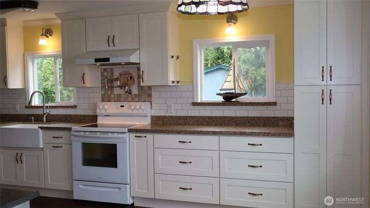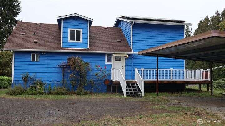 View, view, view! This fully undated 3-bedroom 2 bath home has a view from nearly every room. Enjoy the newly remodeled extended kitchen that leads off the foyer complete with granite countertops, pot filler over the stove and lots of natural light. Separating the kitchen and dining is a beautiful antique wood burning cast iron cook stove perfect to keep you warm and cook with some vintage charm. Enjoy your gourmet meal in the large dining room that seats ten comfortable while taking in the view of the sound. But wait, there's more! Bonus room and den/office space in the daylight basement, solar panels to keep that electric bill drastically low, wrap around deck for enjoyment and relaxing covered carport, detached garage, and more.