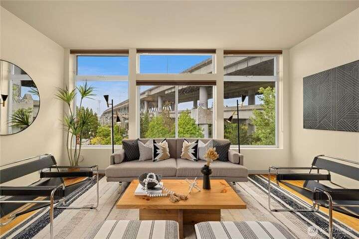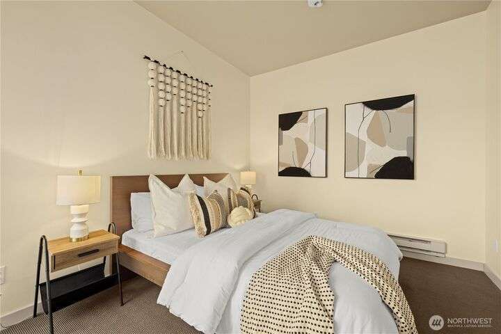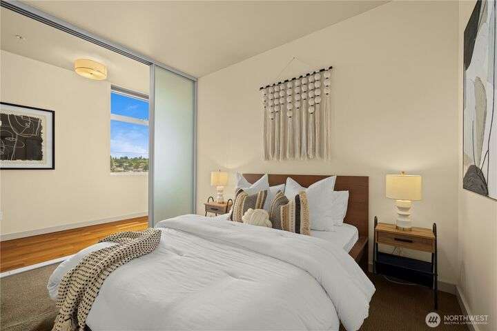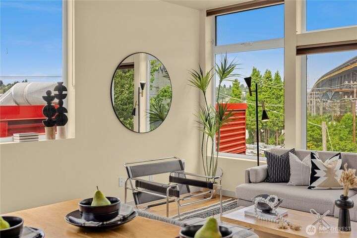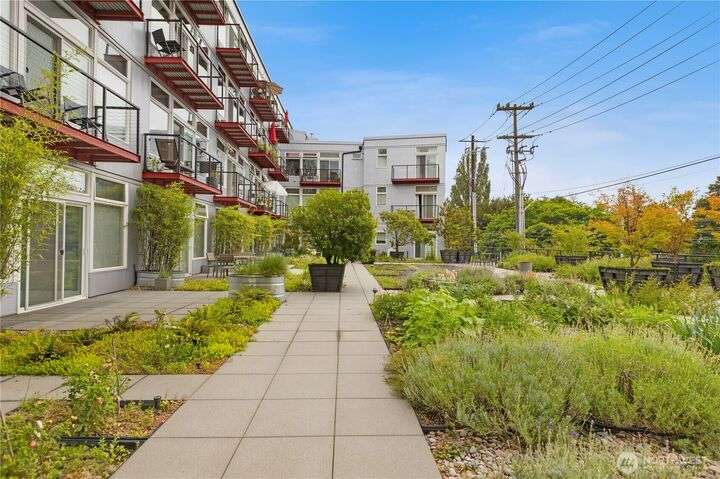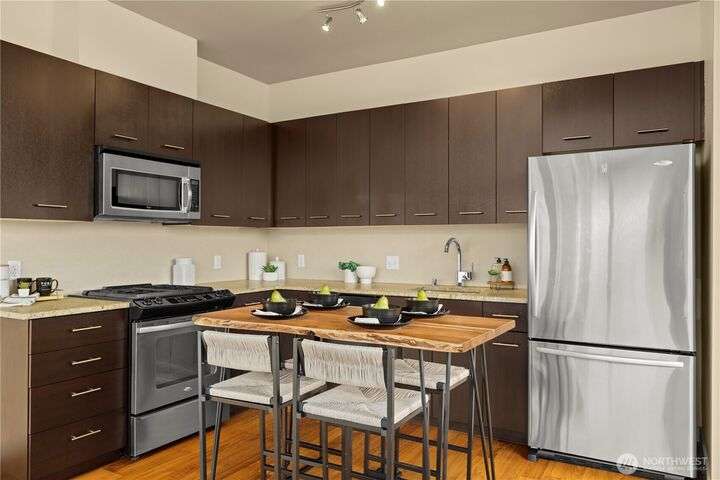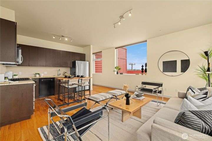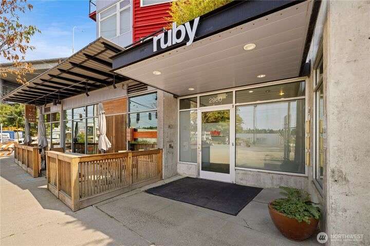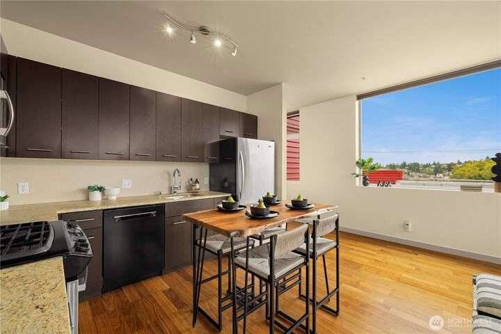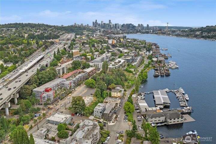 Enjoy the best of Eastlake living in this bright and modern one bedroom condo just one block from Lake Union. This top-floor corner unit features an open layout with soaring ceilings, rich hardwood floors and tons of natural light. The stylish kitchen includes stainless steel appliances, granite countertops and sleek dark cabinetry, perfect for hosting or a quiet night in. The bedroom offers a walk-in closet while the full bathroom includes an in-unit washer and dryer for added convenience. Ruby is a well-maintained, pet-friendly community that features a lush vegetable garden, a serene courtyard with breathtaking lake views and unbeatable access to neighborhood favorites, only moments to vibrant restaurants, cafés and shops.