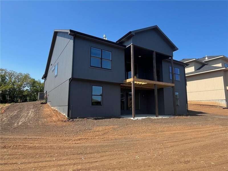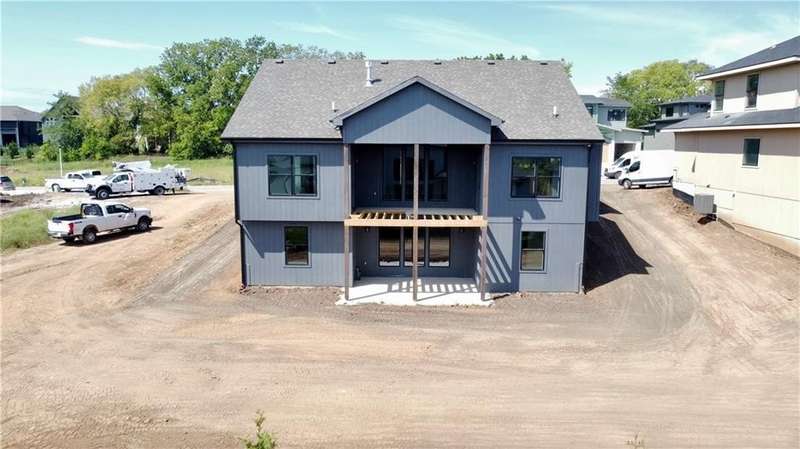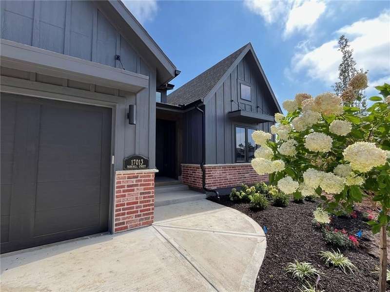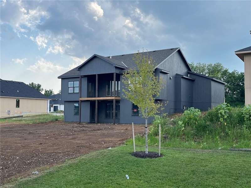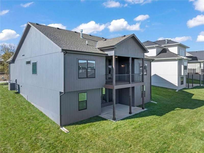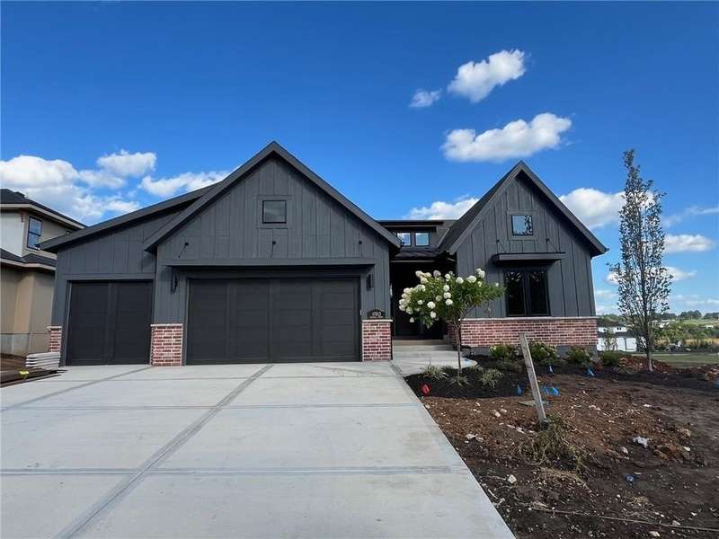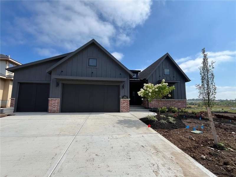 MOVE IN READY! The modern Riviera REVERSE by SAB Homes located on lot 184 in a cul-de-sac with a full finished walkout basement. You will love this new modern twist to a classic reverse floorplan at just over 3000 square-foot. with spectacular curb appeal featuring high peaks, vertical accent siding, metal accent roof, blackened bronzed windows, and super dark charcoal paint with red brick trim. Stunning! This home also features an ideal plan floor plan with a main floor primary suite and an office/ second bedroom with access to the covered 16' x 12' deck from the dining room and bedroom. Enjoy the finished walkout lower level with two more bedrooms, large family room with LVT flooring, parallel wet bar and a door to the backyard, plus plenty of room for storage. Perfect outdoor space under a 16' x 12' covered patio with full sod front and back, sprinkler system and front landscaping package included. This home is loaded with upgrades; gas cooktop, quartz countertops, decorative bath mirrors, Maxx Lounge freestanding tub, bump out in the dining area for hutch or china cabinet, boot bench at garage entry, large windows, floor to ceiling tile fireplace with accent ceiling trim in great room, vertical shiplap accent wall in the office with 3 ceiling beams, wainscoting at entry and stairwell and light wood flooring. Century Farms has a spectacular club house with a farmhouse twist ideal for neighborhood gatherings or private parties with reading loft and a fitness center. There are plenty of neighborhood activities with a fire-pit, two pickle-ball courts and a basketball hoop, kids play area, wildflower walkways and a community garden. Century Farms is conveniently located near the brand new Bluhawk shopping center, Heritage Park, the Johnson County Trail system and the Overland Park Arboretum. Come join the fun in Century Farms, a unique one of a kind upscale new home community in Overland Park. BLUE VALLEY SCHOOLS