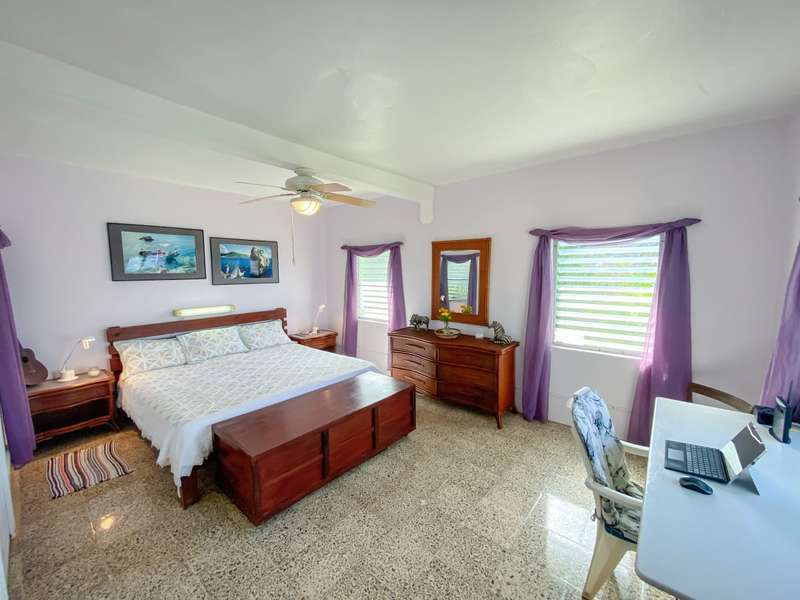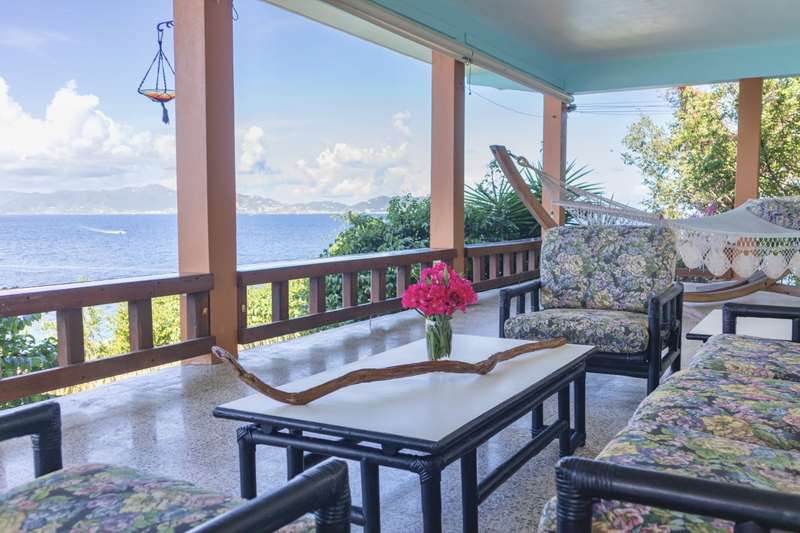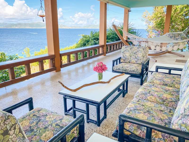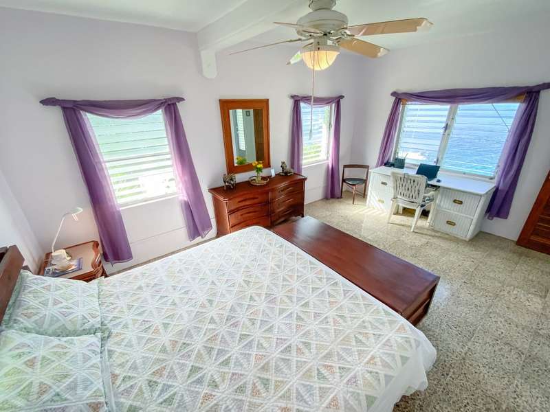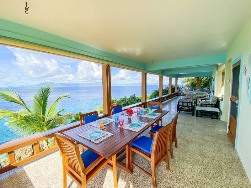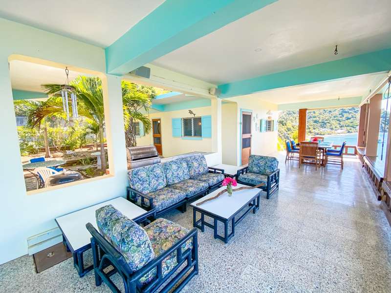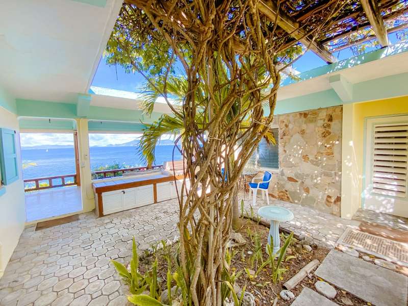The house at Quart-A-Nancy Point, with approximately 160m (500ft) of shoreline on Manchioneel Bay, is reachable only by boat to a private dock. It is a self-sustaining, eco-friendly property, utilizing solar energy to provide 110 Volt electricity to run all usual household devices. Backup batteries continue to provide power at night, and there is also a backup generator. The house comprises three bedrooms and two bathrooms. A covered porch as an outdoor living area runs the entire length of the West facing side of the house with glorious uninhibited views out over the Ocean. Al Fresco dining is the order of the day, supplemented by a large kitchen and courtyard BBQ area.