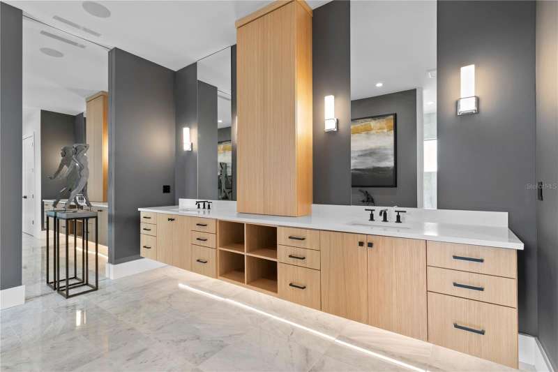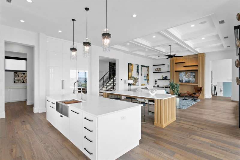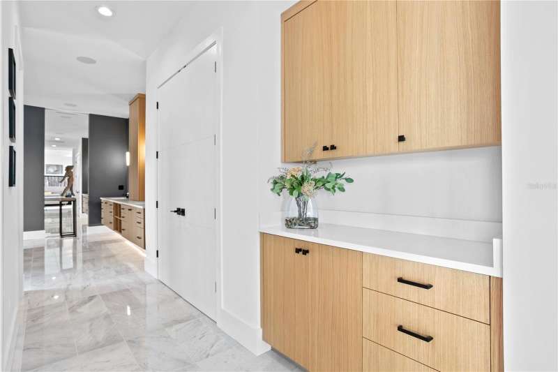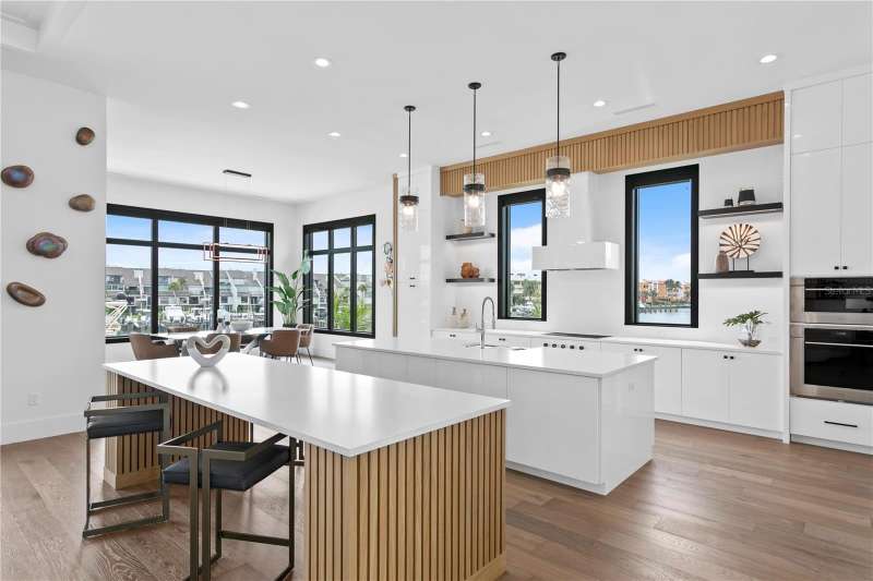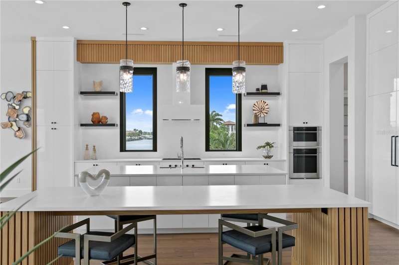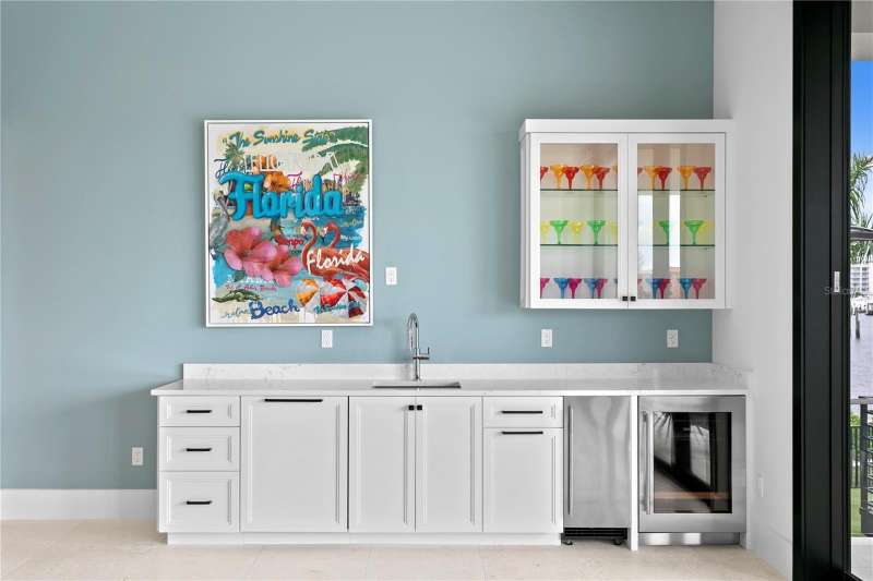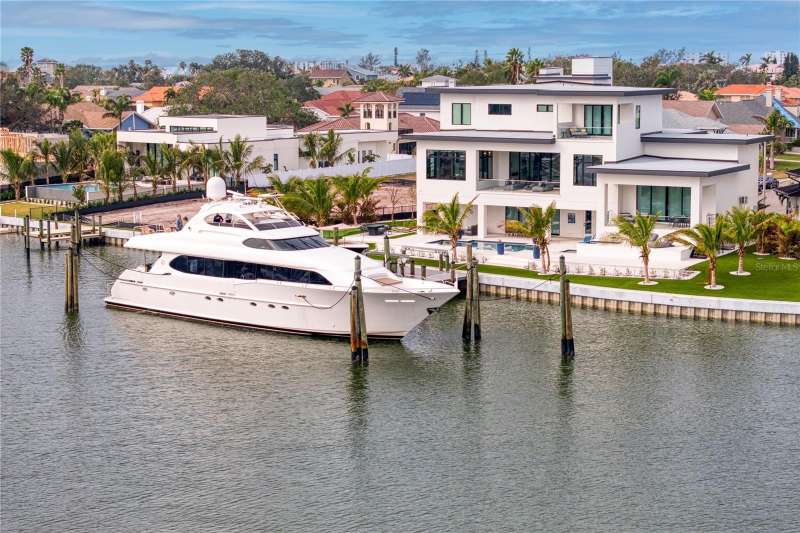 This exquisite home features an all-too-rare amenity found along Central Florida’s West Coast. A deepwater private dock able to accommodate 100-plus-foot yachts that is located just steps away from Tampa Bay Area Premier Builder, JR Structure’s newly constructed, custom-designed residence. Enjoy the convenience of transitioning from boat deck to patio deck simply by crossing the backyard of this barrier island home. With this ease of access, experience year-round excursions and endless opportunities for open water fishing trips to extended waterfront explorations along the Gulf of Mexico. It is all possible thanks to the fully equipped dock sporting three slips,150amp power supply, a 40,000-pound boat lift and jet ski lift. Built along the banks of Tierra Verde’s Grand Canal, this five-bedroom, five-bathroom and two half-bath residence is truly turnkey ready. Contemporary decor, bold and beautiful wall treatments, lighting fixtures and a Fully Furnished stylish decor professionally designed by DoMA, accentuates this elegant, rare gem. This light-filled, 5,625-square-foot home optimizes abundant waterfront views with features that include framed glass doors, over-sized windows, wall-to-wall sliding glass doors, and an open floor plan with 12-foot ceilings in the main living area. A soothing cool color palette provides a pleasing contrast to the parcel’s surrounding vibrant foliage, bright blue sky, and sparkling waterfront. Located in a cul-de-sac within this highly sought-after community, this residence is convenient to St. Petersburg’s vibrant downtown and award-winning beaches like Fort De Soto Park and Egmont Key. Its idyllic location is understandably longed for as well as uncommonly available. Unparalleled and unobstructed views can be enjoyed from bedrooms to balconies, the main living areas to the lanais and from the poolside patio, creating the perfect indoor/outdoor lifestyle at this luxury island escape. Wooden staircases and a wood-paneled interior elevator provide easy access to all areas and every level. The backyard is bordered by a new 194-foot seawall. It rivals a luxury vacation resort with its inviting open-air deck overlooking a heated saltwater pool and spa and adjoining outdoor kitchen, al fresco and covered dining areas and private putting green, plus a fire table. The sleek interior kitchen is accented by Cambria® solid quartz surfaces, custom cabinetry and top-of-the-line Wolf and SubZero appliances and features free-standing islands for both meal prep and seated dining. Step into the home’s entryway directly from the paved driveway or through the connecting four-car garage and workspace encompassing 2,480 square feet. A formal dining room framed by windows on three sides, home office space, indoor/outdoor leisure room with wet bar, large laundry room with counters and cabinets and primary bedroom complete with a roomy walk-in closet, separate laundry facilities, spacious bathroom with dual vanities and double walk-in showers round out the many amenities and attributes this one-of-a-kind home delivers. Seller open to partial luxury trade of home, boat or airplane. (No Flooding with either Helene or Milton)