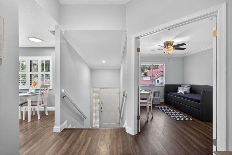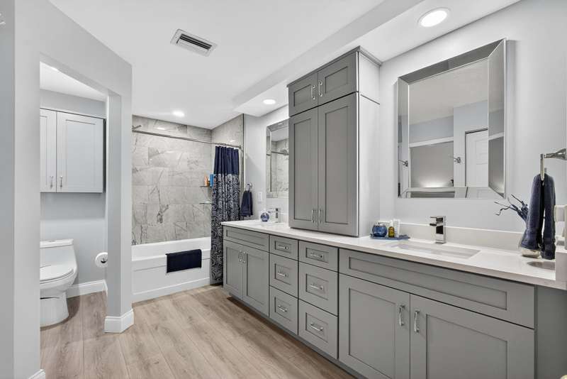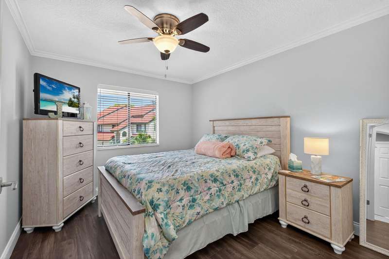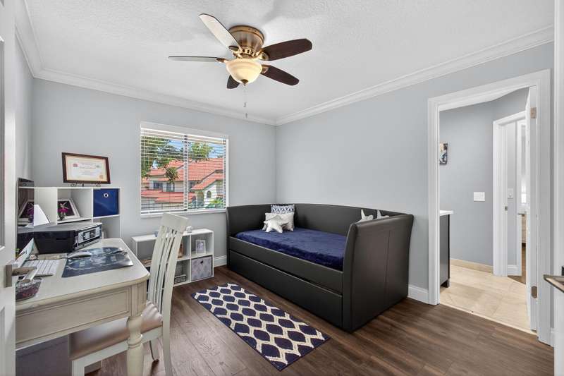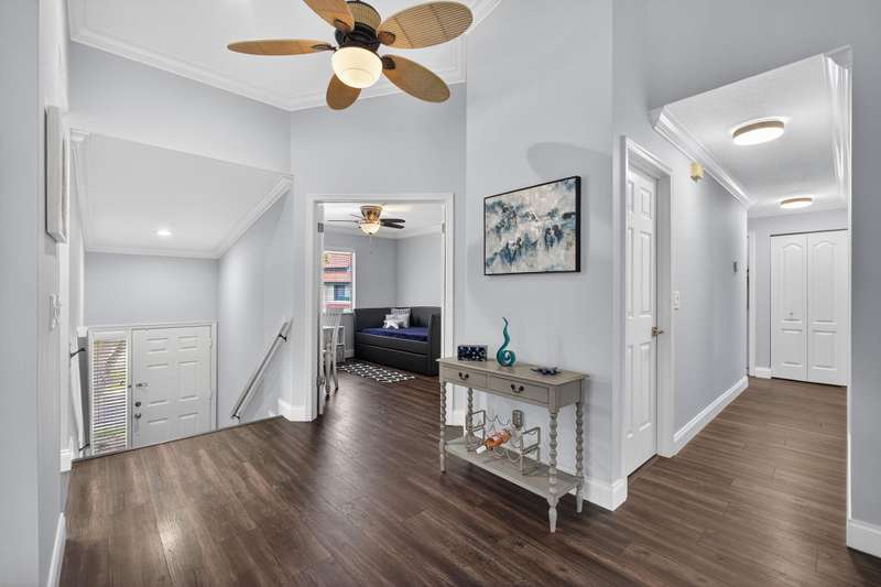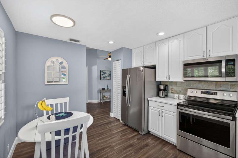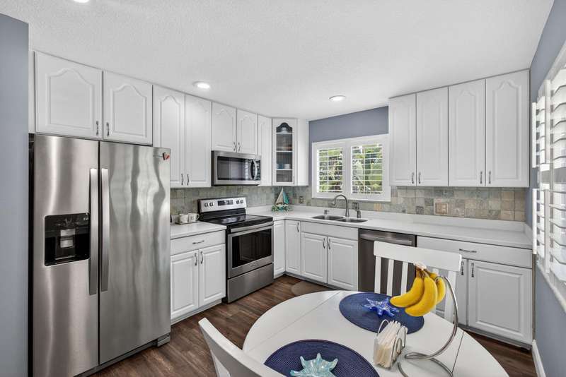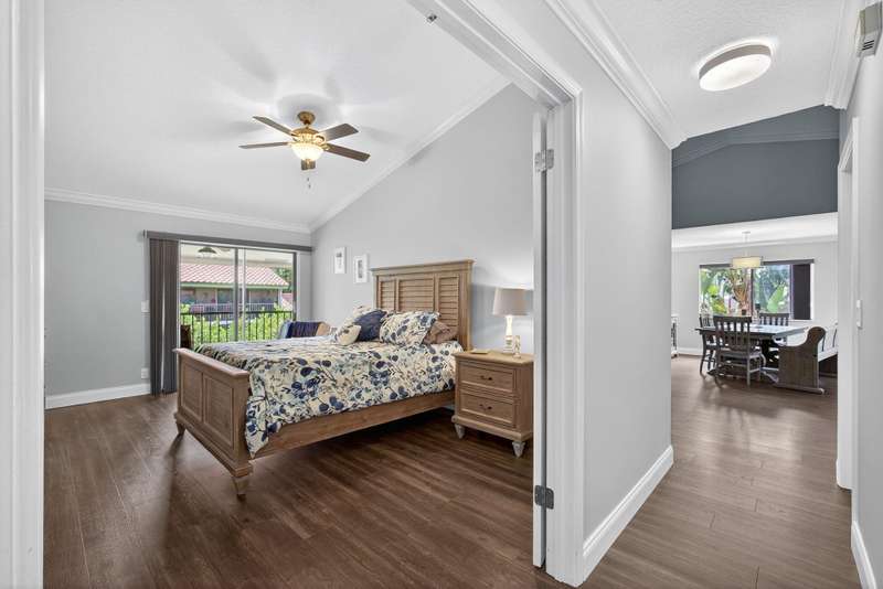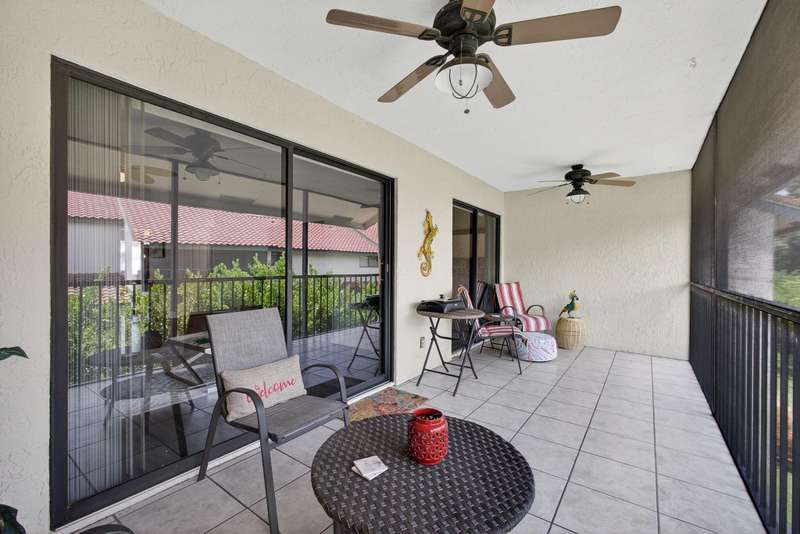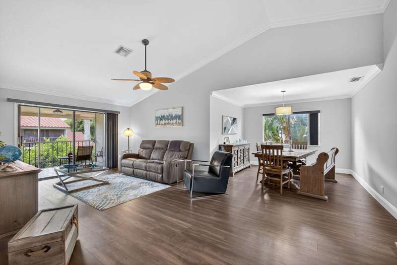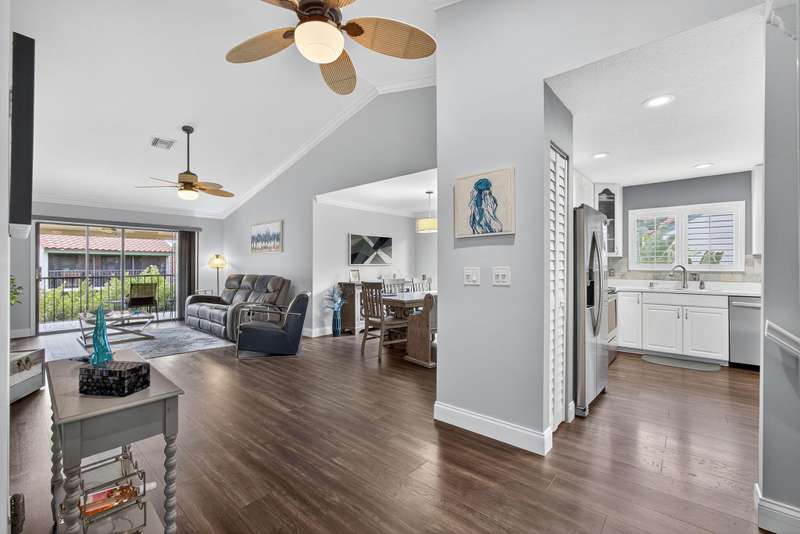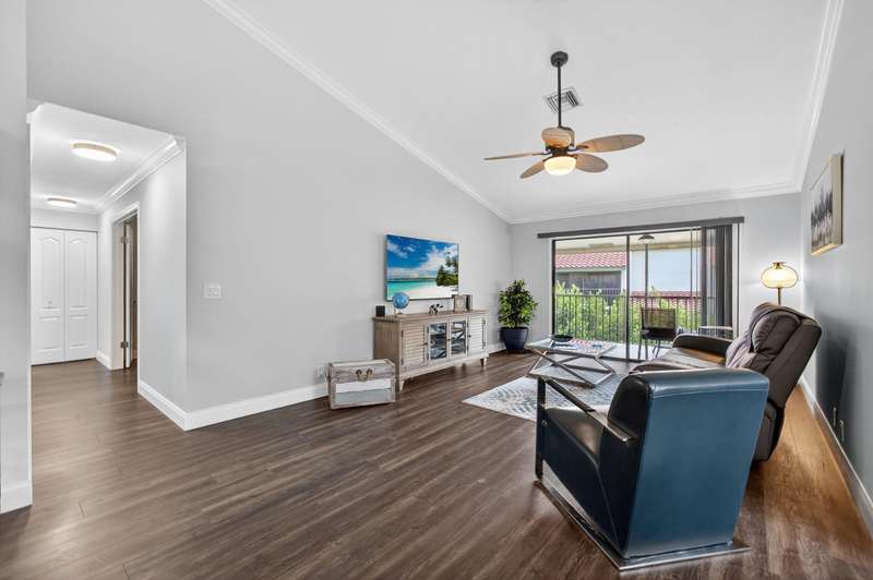 GORGEOUS and meticulously maintained three-bedroom CBS first-floor condo located in the highly sought after Lexington Green of PGA National! This Mediterranean style condo has been beautifully renovated and boasts large open living spaces with soaring volume ceilings, an upgraded kitchen, plus a screened-in lanai with stunning views of the lush tropical landscaping! Enter this home and be swept off your feet by its open feel with abundant natural light, dramatic ceilings, newer flooring, and crown molding throughout the living areas. The popcorn ceilings have been removed, lighting has been updated, and new ceiling fans have been installed. At the heart of the home is the contemporary kitchen featuring new whirlpool stainless steel appliances, wood cabinetry, light Corian countertop