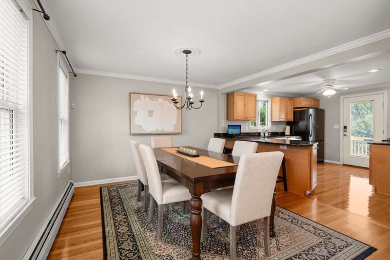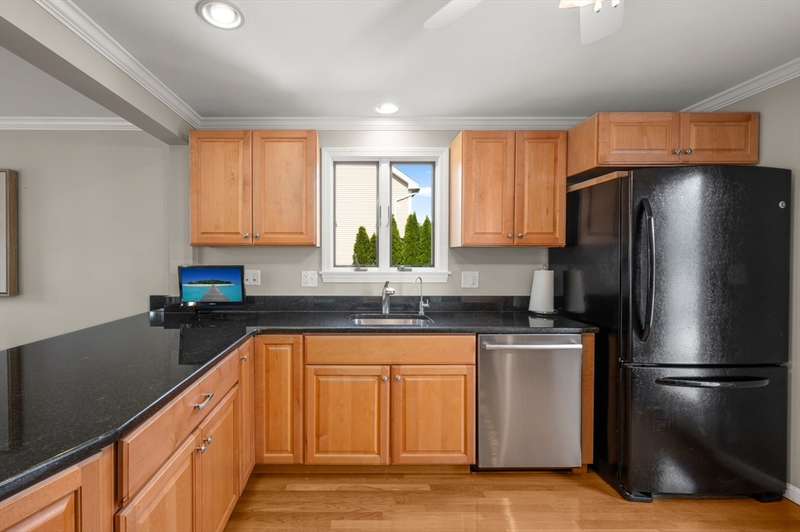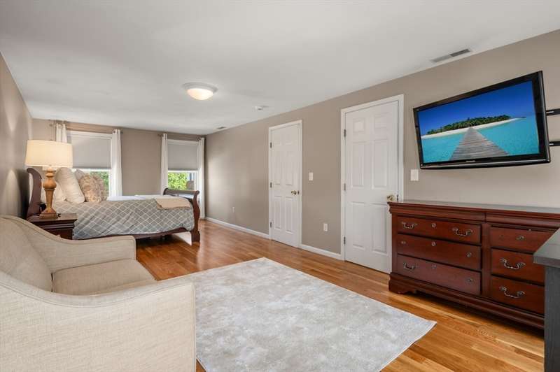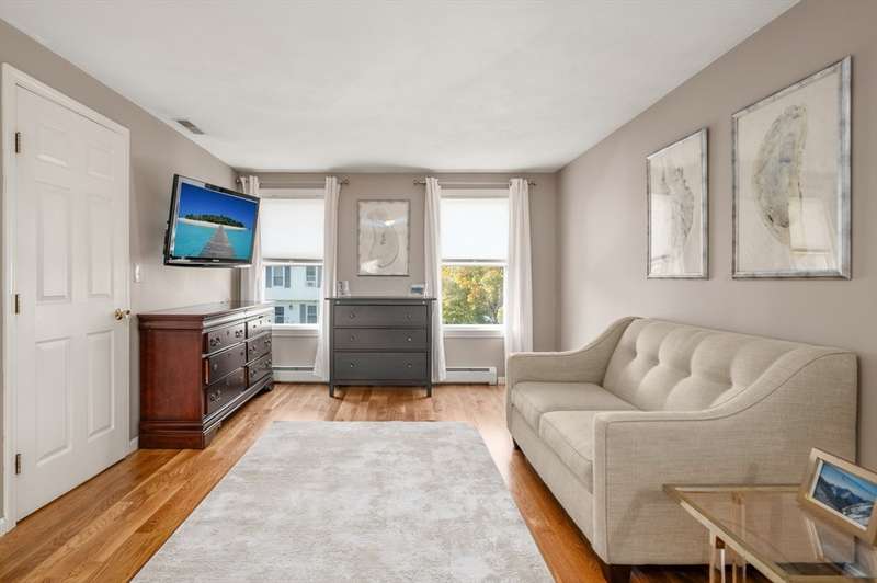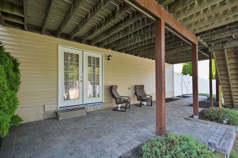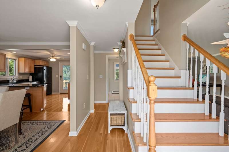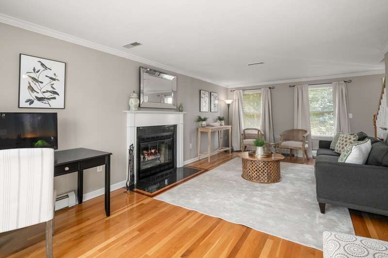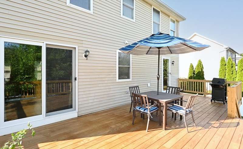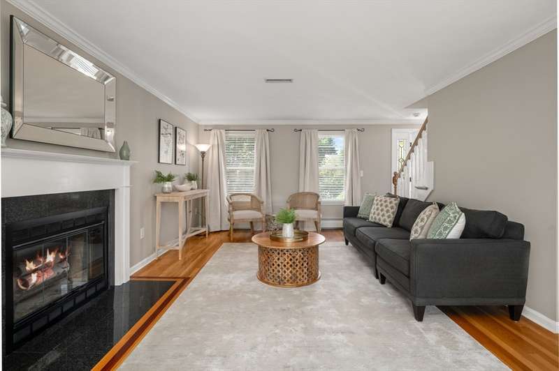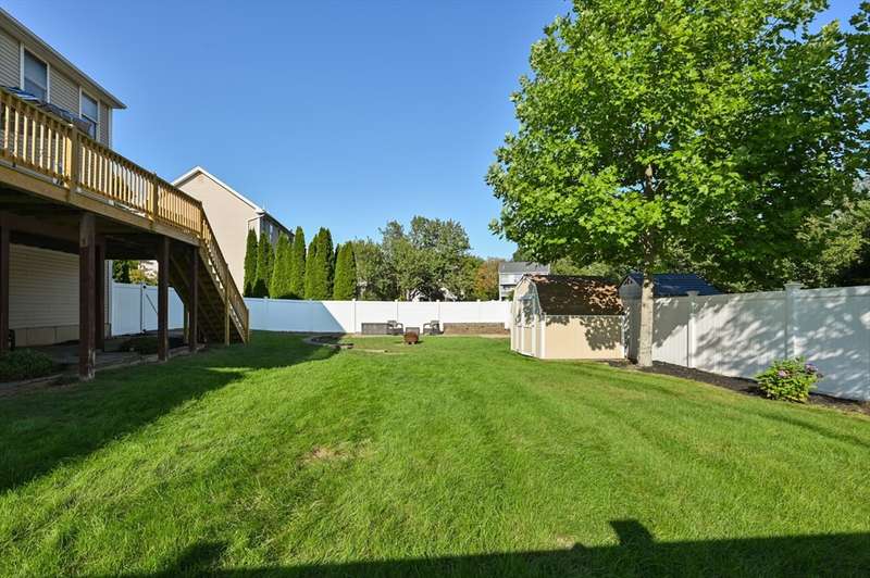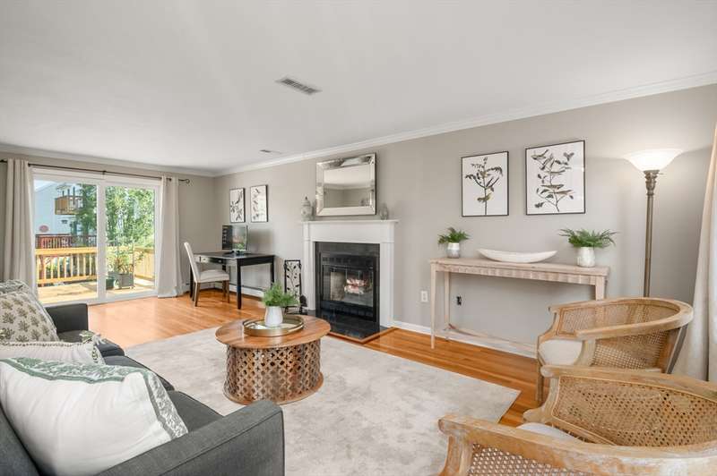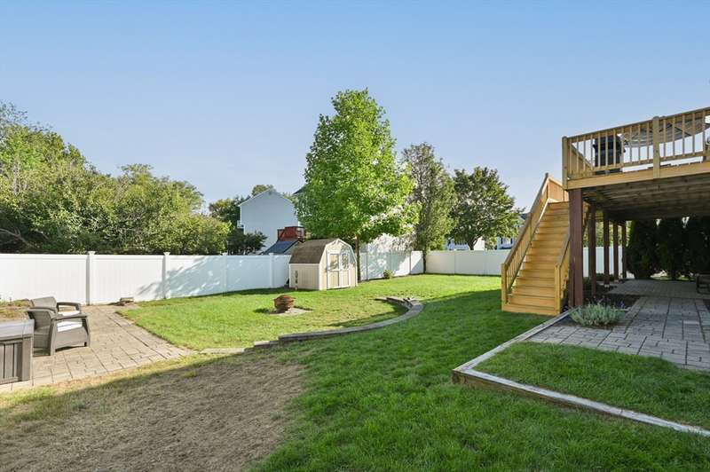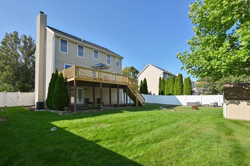 Simply stated & sophisticated colonial in one of East Methuen's most sought after locations! This stunning 3-bedroom, 2000 sf home offers instant appeal with a thoughtful open floor plan and designer interior vibe. The well designed kitchen features warm maple cabinetry and contrasting stone countertops flowing seamlessly to the dining area. Gleaming hardwood floors (new on stairway and second floor), lead to an expansive fireplaced living room with sliders to the NEW 14x34 deck. The bright finished lower level bonus room with French doors to paver patio is perfect for entertaining, home office or just cozy quiet space. Upstairs, the oversized primary suite includes walk-in closet and sitting area, plus two additional bedrooms and spacious bath. Outdoors is a covered sitting area beneath deck overlooking the fenced green space and NEW HVAC installed 8/25. Commuter-friendly location with major highway access - looking for space and value? This move-in ready gem checks all the boxes!