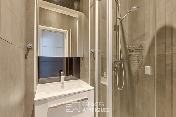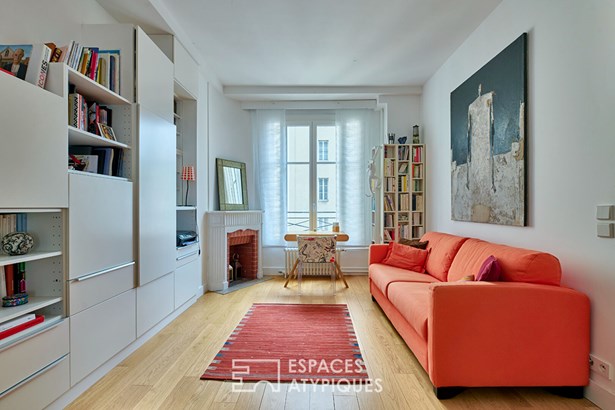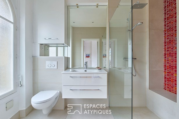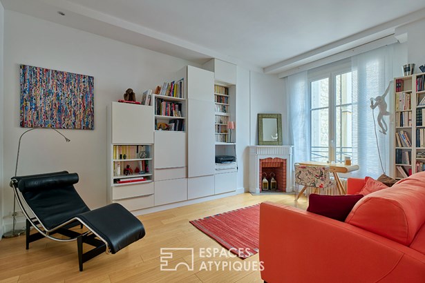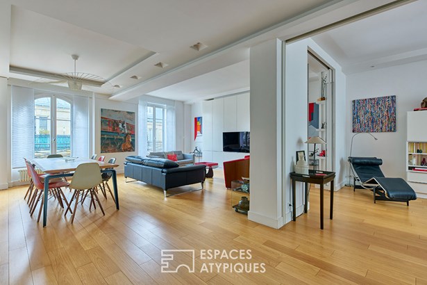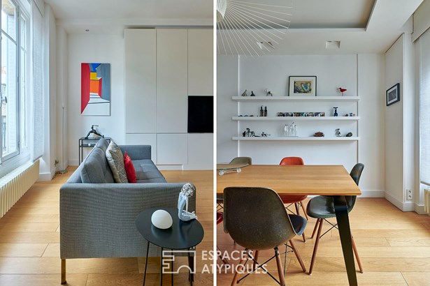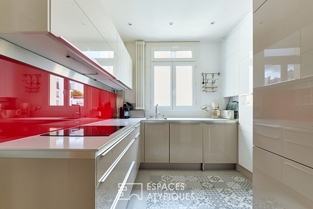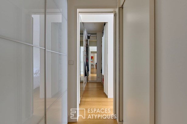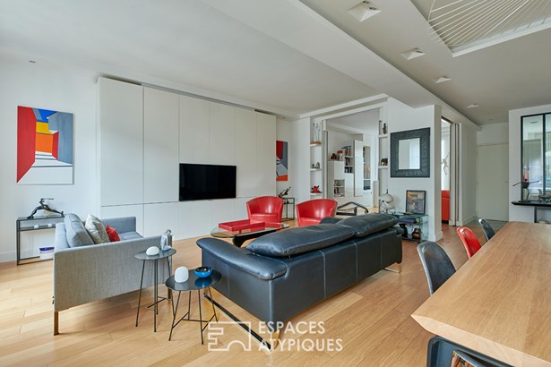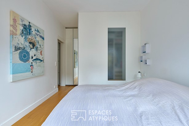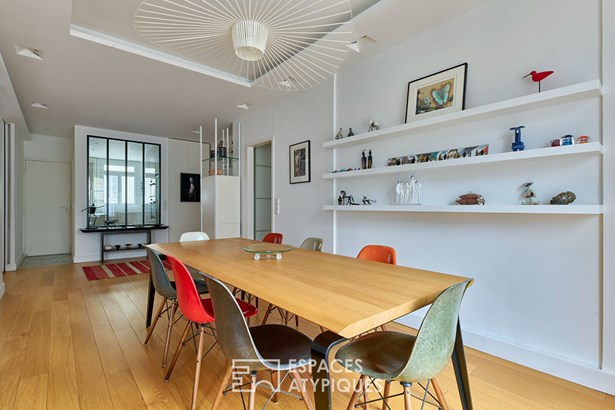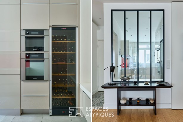 The separate, fitted and equipped kitchen subtly interacts with the living room thanks to a workshop glass roof, creating a fluid perspective while preserving the through character of the property.