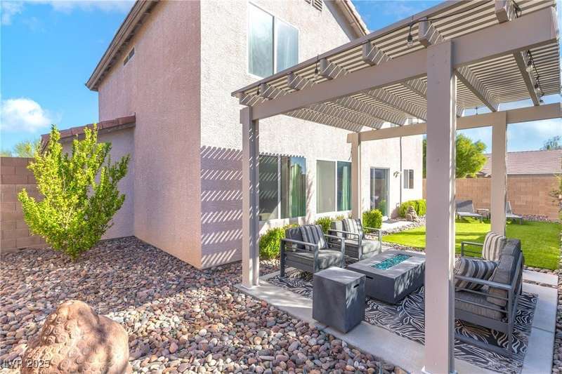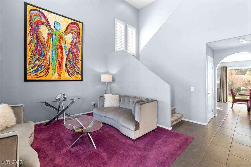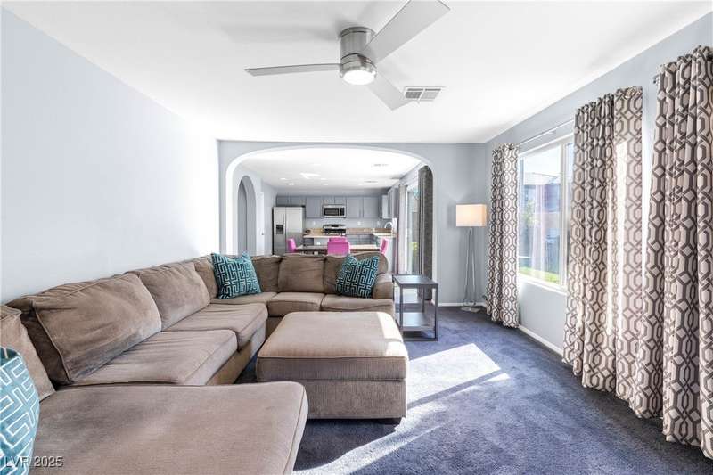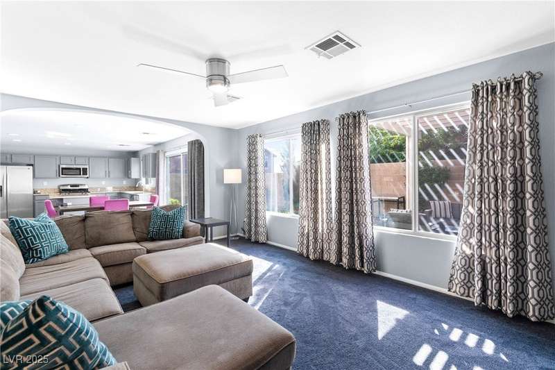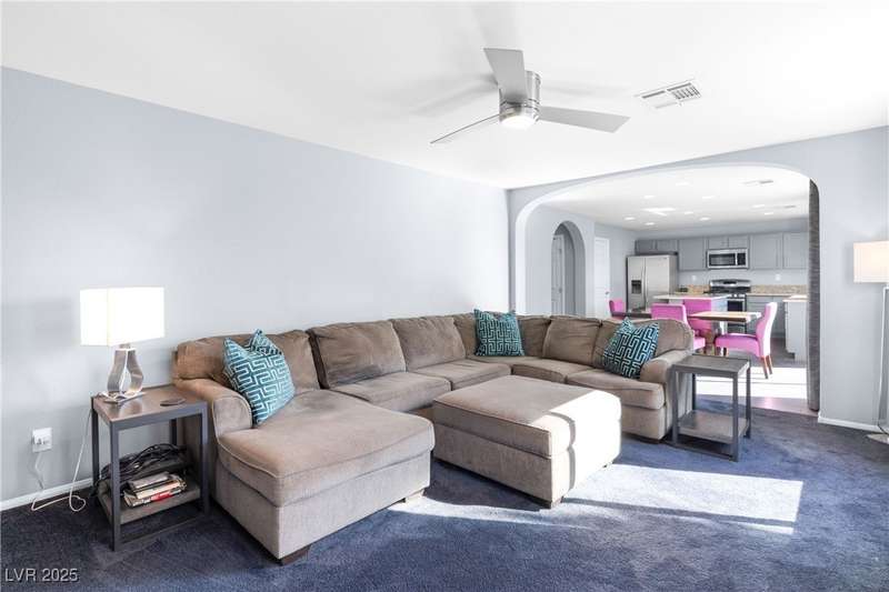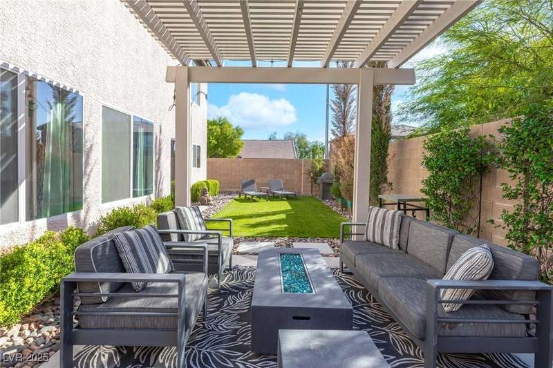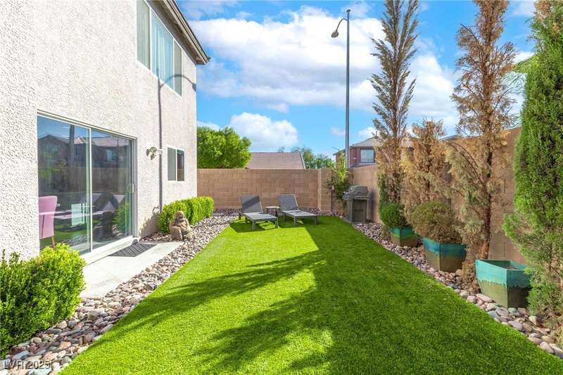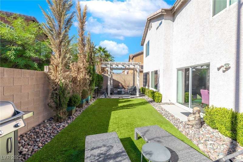 Located on a corner oversized lot, this 4-bedroom, 3-bathroom home has been extremely well maintained with nice touches throughout. The grand entryway with vaulted ceilings creates an impressive first impression, opening to a formal sitting area. The combined kitchen and living room space features granite countertops, designer light fixtures, and a nicely wallpapered accent wall that adds character. Curved archways and neutral paint tones provide a soft, inviting feel throughout the main living areas. The large primary bedroom includes a walk-in closet. Modern ceiling fans in primary and office.The powder bath offers a floating vanity for a contemporary touch. The laundry room is fully built out with upper cabinets for extra storage. Outside, the fully finished backyard includes a covered seating area, built-in barbeque, and a river rock perimeter. Additional highlights include an upgraded front door and matching iron gate to the side yard, plus designer window coverings throughout.