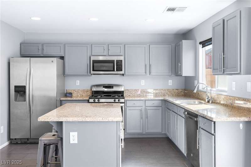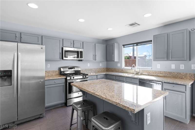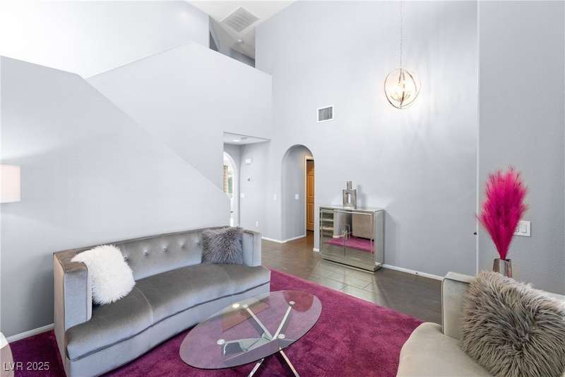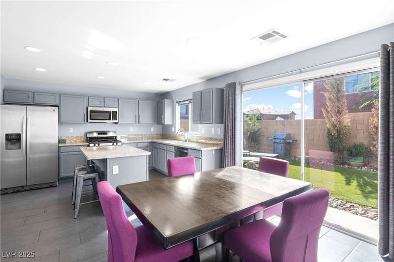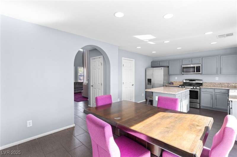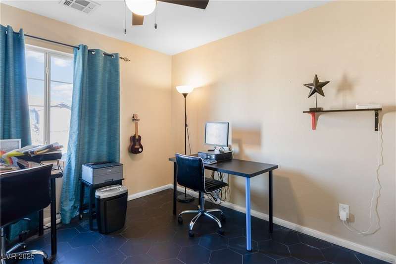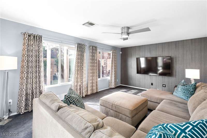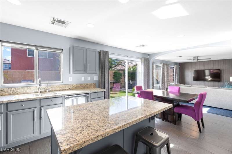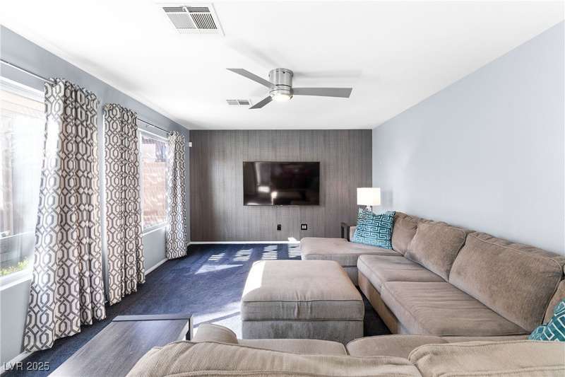 Located on a corner oversized lot, this 4-bedroom, 3-bathroom home has been extremely well maintained with nice touches throughout. The grand entryway with vaulted ceilings creates an impressive first impression, opening to a formal sitting area. The combined kitchen and living room space features granite countertops, designer light fixtures, and a nicely wallpapered accent wall that adds character. Curved archways and neutral paint tones provide a soft, inviting feel throughout the main living areas. The large primary bedroom includes a walk-in closet. Modern ceiling fans in primary and office.The powder bath offers a floating vanity for a contemporary touch. The laundry room is fully built out with upper cabinets for extra storage. Outside, the fully finished backyard includes a covered seating area, built-in barbeque, and a river rock perimeter. Additional highlights include an upgraded front door and matching iron gate to the side yard, plus designer window coverings throughout.