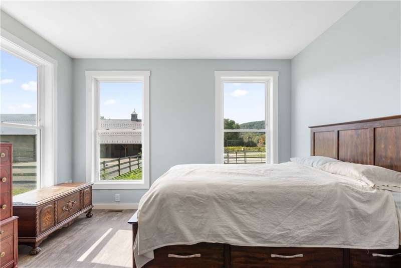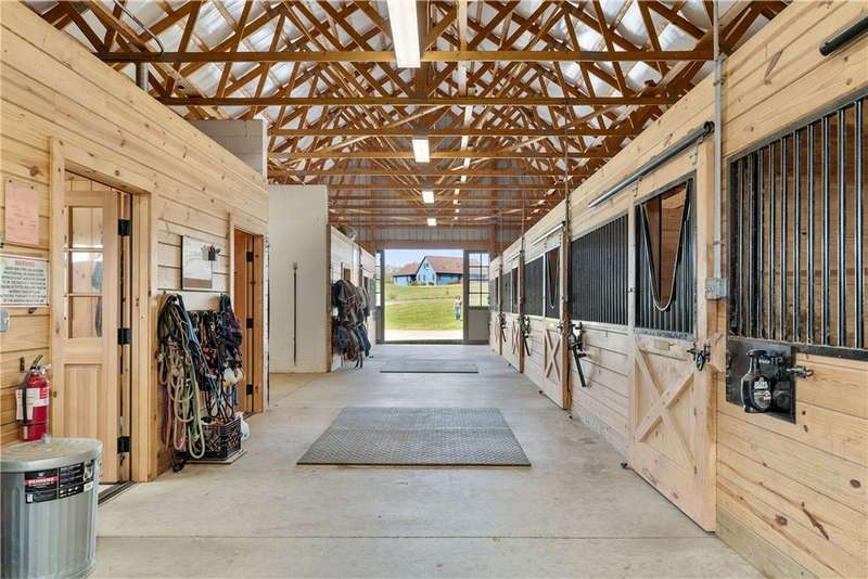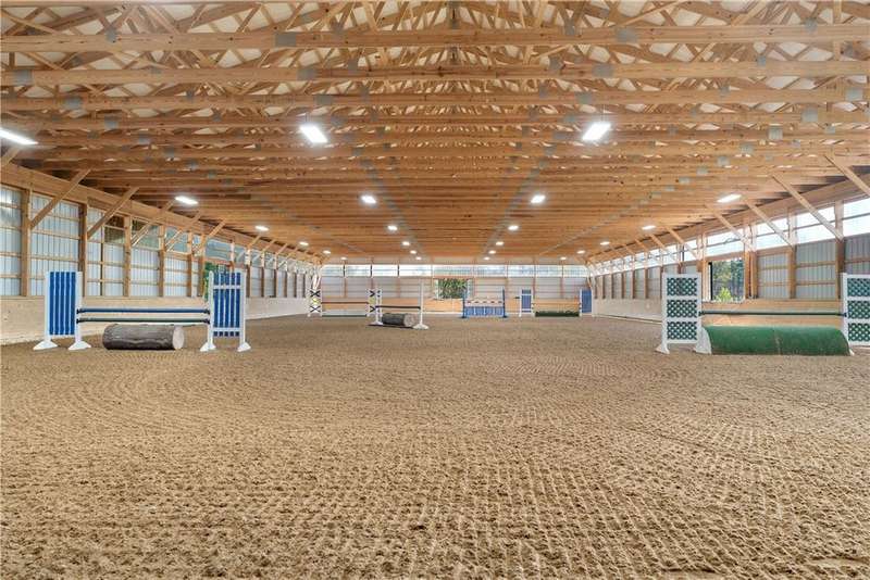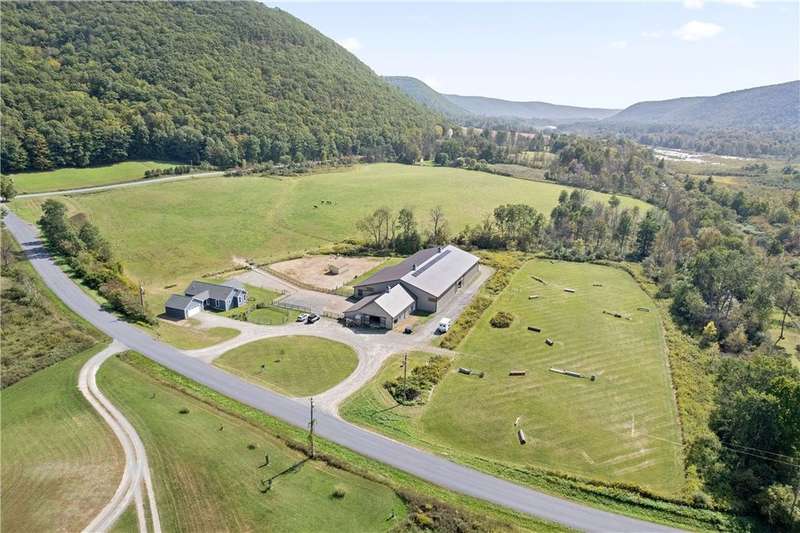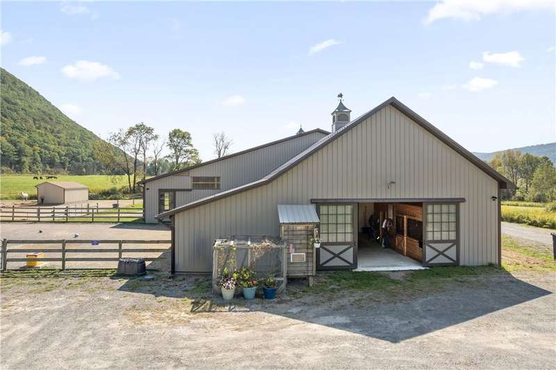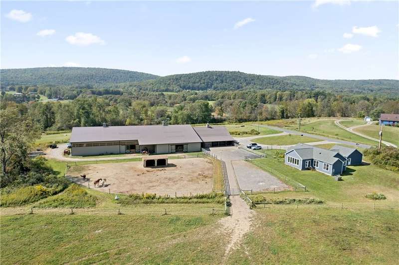This exceptional equestrian property offers a rare combination of features. Set on 30 acres only 15 minutes from Cornell University in the Finger Lakes region, this facility's amenities are top of the line! The barn features 6 stalls, all with 12x12' mats, outlets and automatic waterers, a wash stall, heated bathroom, feed room, and heated tack room with observation area. 5 stalls have Dutch doors to the run-in shed and dry lot paddock that leads to a 20-acre pasture. The 80 x 160 indoor arena is perfect for year-round equestrian needs and the professionally built turf riding field with cross country jumps offers even more riding space. An additional paddock with run-in and large storage area off the arena round out this elite facility. Relax and watch your horses through the wall of windows in your 2020, 3-bedroom home with an open floor plan, 9 ft ceilings, lots of light, a perfect primary suite and plenty more space in the basement to expand or use for gym/rec activities. Geothermal heat for the home and solar for the house and stable result in very low utilities. Currently an income producing boutique boarding business. Continue a business or use it all for your own horses! Listed Taxes based on full amount but currently ag exempt so only paying $10,765 total annually for property taxes.
