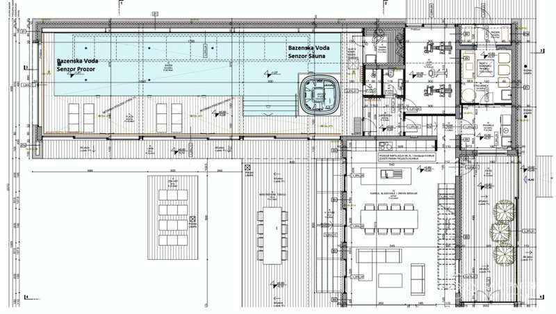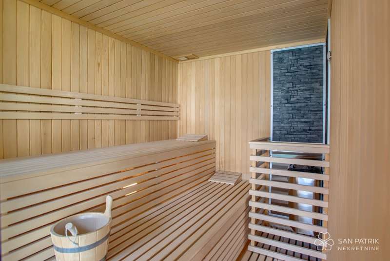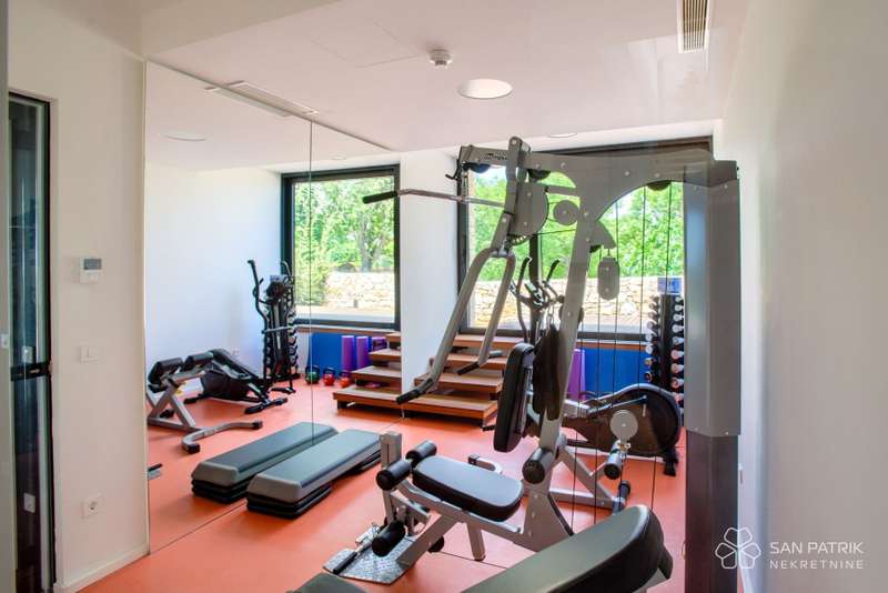 The heart of the villa is undoubtedly the impressive 18-meter long indoor pool, ideal for athletic swimming. The pool is surrounded by a spacious area that can be fully opened in the summer and closed in the winter, providing a perfect ambiance for relaxation all year round. In addition to the pool, the prospective owners can enjoy a wellness area, which includes a gym and sauna, perfect for relaxation and nurturing body and mind.