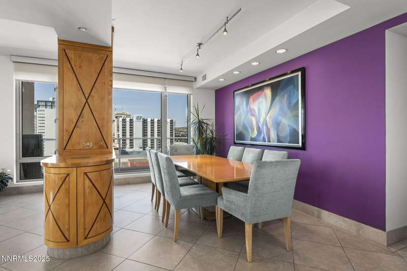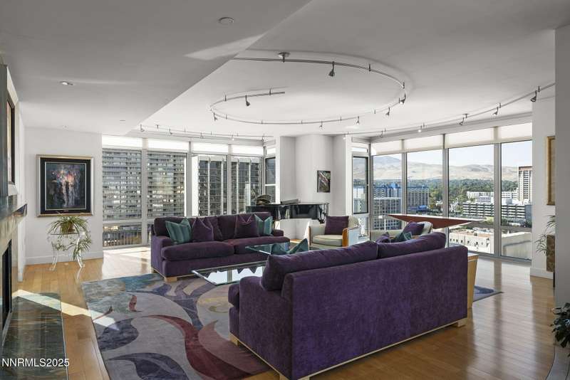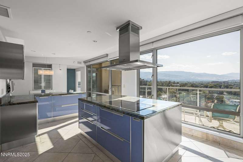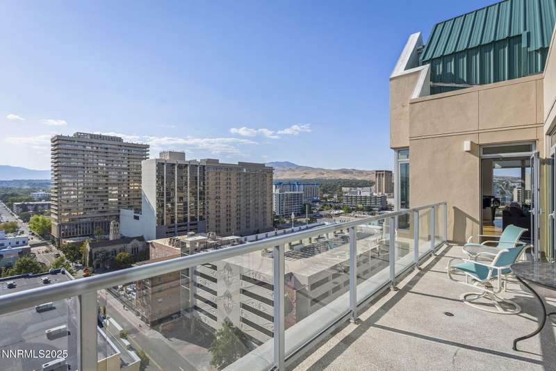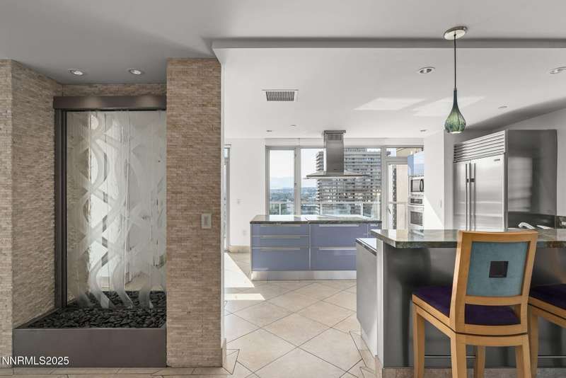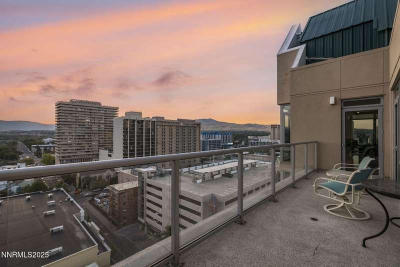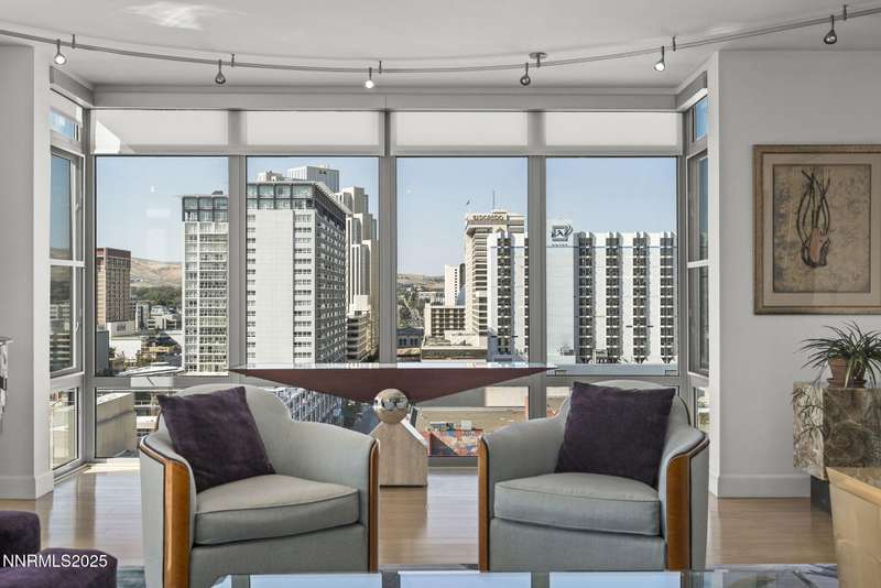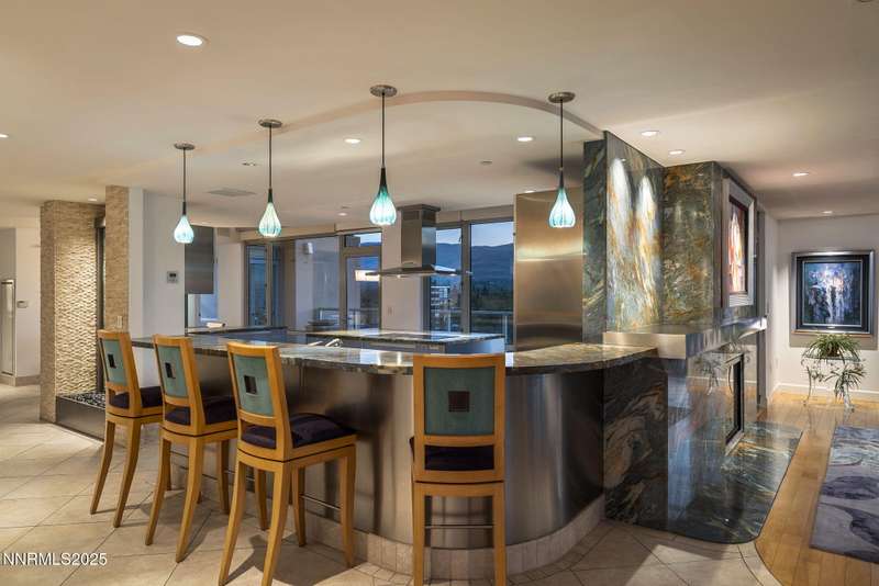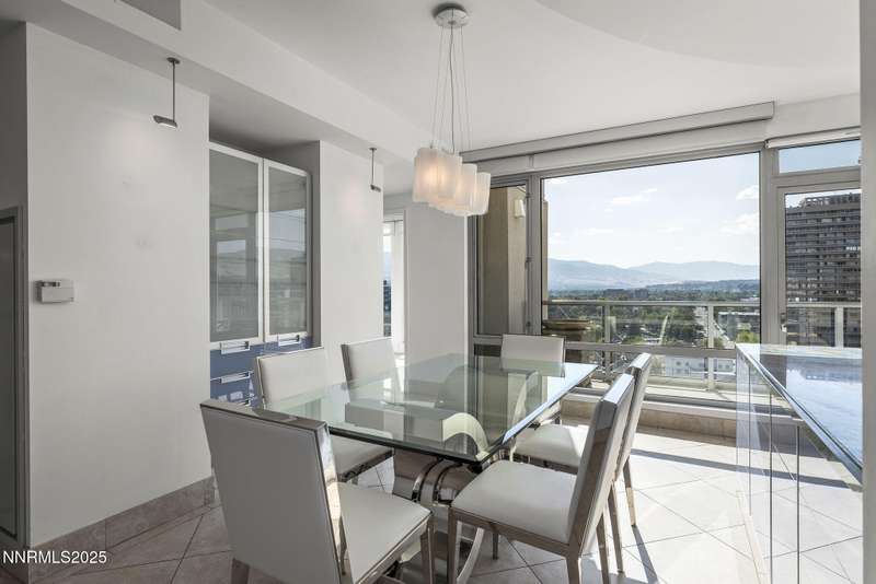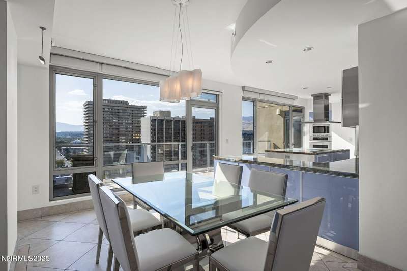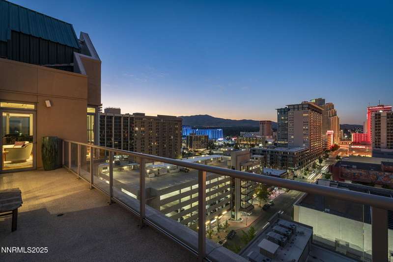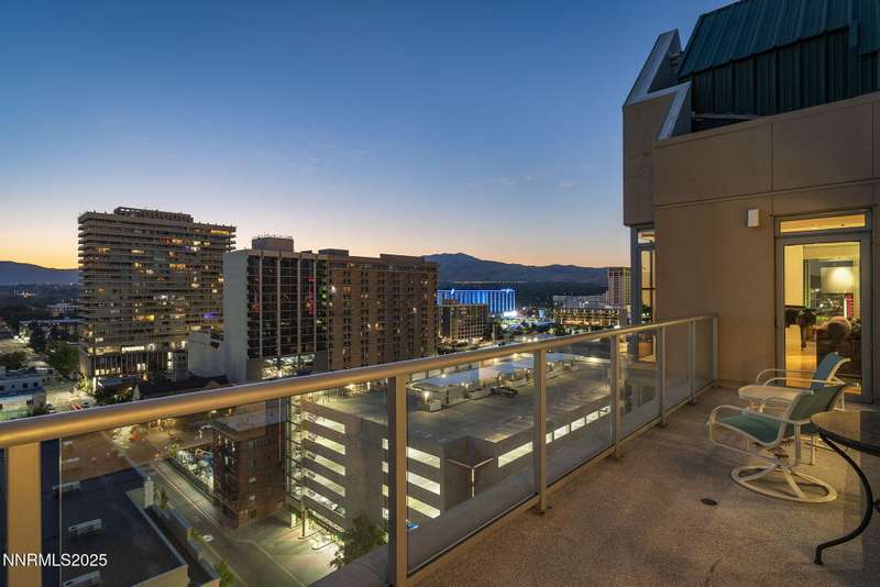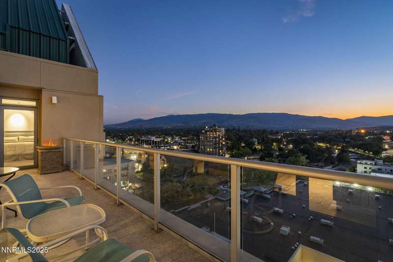 Where space meets sky: this penthouse at The Palladio offers a rare combination of size, privacy, and views seldom seen in downtown Reno. Available for the first time in nearly 20 years and one of only four penthouses in the building, this 3,066 sq ft residence blends genuine single-family scale with the convenience of lock-and-leave living. The great room at 50 N Sierra St PH13 sets the tone with maple floors, custom wood details, and a fireplace wrapped in striking Blue Louise granite—both a stunning feature and a cozy hearth. Walls of glass reach full height, bringing the horizon indoors and turning sunrises, sunsets, and city lights into part of everyday life. Two terraces extend the living space skyward, showcasing a sweeping panorama from Sierra peaks to the Truckee River and the glowing city lights. The dining room flows seamlessly from this central gathering area. Framed by windows and opening onto the terrace, it's spacious enough for long tables and celebrations, yet warm enough for daily meals. Bathed in natural light, the room invites gatherings to move easily between indoors and outdoors, with the city shimmering as a backdrop. The kitchen combines sleek design with professional-grade functionality. Italian Scavolini cabinets in a rare periwinkle hue pair with polished countertops and statement lighting. A Thermador induction cooktop, double ovens, a Miele dishwasher, and a vented hood deliver precision for the home chef. A walk-in pantry adds utility, while the oversized counter-height bar and bright breakfast nook support everything from quick mornings to dinner parties that linger. Beyond the kitchen, a dedicated wine and storage room highlights the home's exceptional livability. Here, a Sub-Zero dual-zone refrigerator holds 147 bottles, complemented by shelving and cabinetry, proving that penthouse living can offer the same capacity and practicality as a single-family home. Each ensuite bedroom is distinct. The primary suite combines comfort with elegance: heated marble floors, dual vanities, and a walk-in shower paired with a custom closet system. Wide windows frame the downtown skyline, anchoring the room in its urban setting. The secondary suite provides a peaceful retreat with a soaking tub, steam shower, dual vanities, and generous closet space. Expansive windows open to mountain views, filling the room with natural beauty. Beyond the main living areas, the home is designed for versatility and ease. A dedicated office offers built-in storage and abundant natural light, ideal for remote work or daily tasks. The laundry room features a side-by-side washer and dryer, deep cabinets, a utility sink—a practical space with thoughtful details. A powder bath with a vessel sink and rich finishes leaves a striking impression for guests. Throughout, motorized shades, integrated lighting controls, custom closets, and built-ins create a home that is both effortless and elegant. Life at The Palladio balances privacy with connectivity. With only 92 residences, the building was designed from the ground up as condominiums, featuring higher ceilings, true outdoor terraces, and thoughtful layouts. Residents enjoy secured entry with camera monitoring, two garage parking spaces accessible via fob, dedicated storage, and Reno's only infinity-edge pool suspended above the Truckee River. From this address, the best of the city is at your doorstep: Pioneer Center performances, river festivals, museums, Midtown dining, and café culture. Yet at home, quiet and privacy prevail. For buyers seeking a lock-and-leave lifestyle without sacrificing space or storage, this penthouse offers both. Beyond square footage or finishes, this residence grants a rare opportunity to live with mountain, river, and city views converging at your windows—a downtown home crafted for both ease and impact. Claim your place in Reno's skyline and experience a home where every horizon belongs to you.