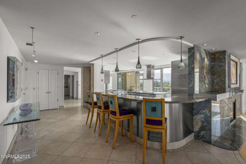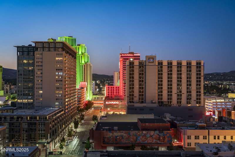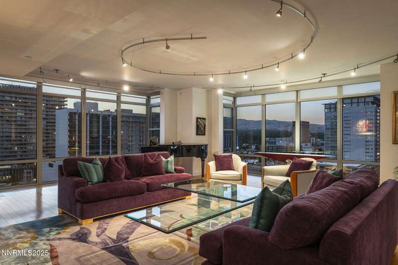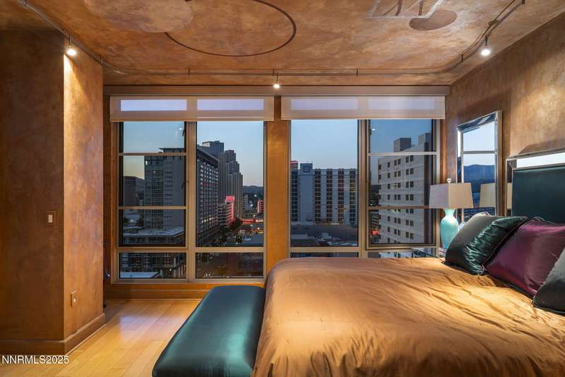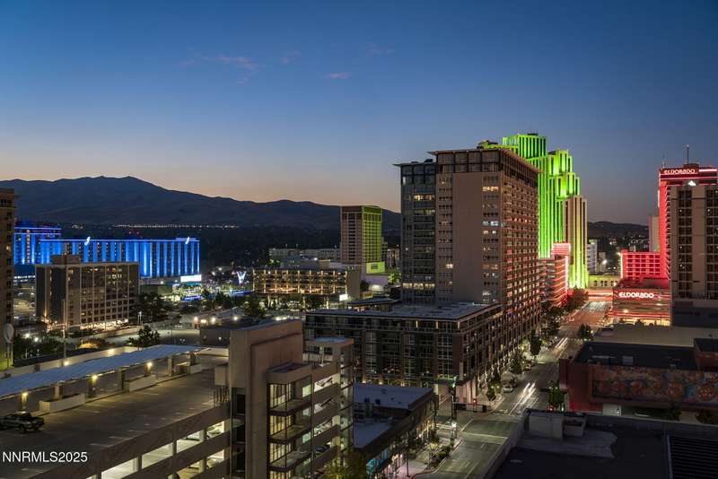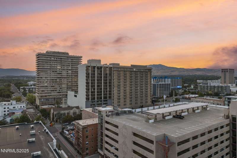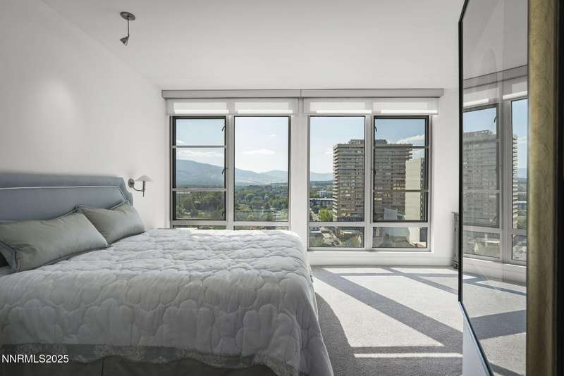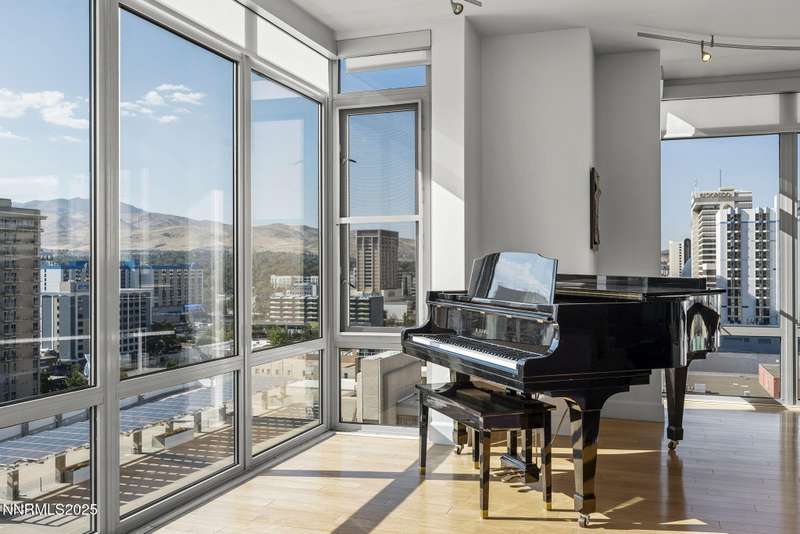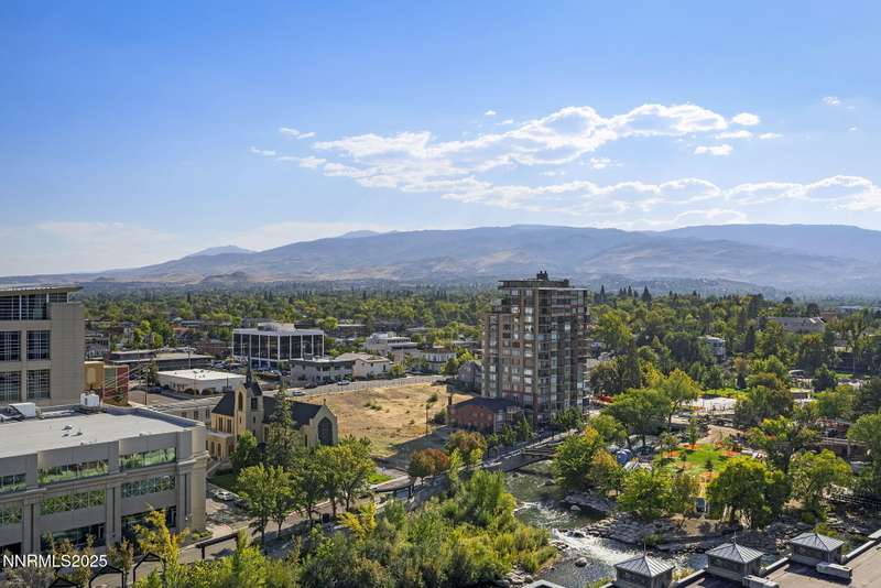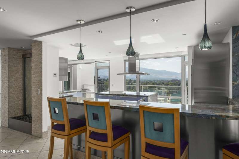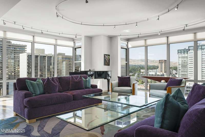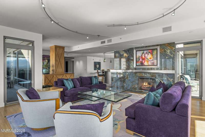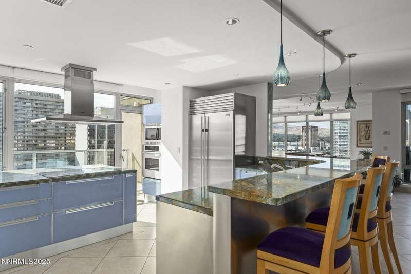 Where space meets sky: this penthouse at The Palladio offers a rare combination of size, privacy, and views seldom seen in downtown Reno. Available for the first time in nearly 20 years and one of only four penthouses in the building, this 3,066 sq ft residence blends genuine single-family scale with the convenience of lock-and-leave living. The great room at 50 N Sierra St PH13 sets the tone with maple floors, custom wood details, and a fireplace wrapped in striking Blue Louise granite—both a stunning feature and a cozy hearth. Walls of glass reach full height, bringing the horizon indoors and turning sunrises, sunsets, and city lights into part of everyday life. Two terraces extend the living space skyward, showcasing a sweeping panorama from Sierra peaks to the Truckee River and the glowing city lights. The dining room flows seamlessly from this central gathering area. Framed by windows and opening onto the terrace, it's spacious enough for long tables and celebrations, yet warm enough for daily meals. Bathed in natural light, the room invites gatherings to move easily between indoors and outdoors, with the city shimmering as a backdrop. The kitchen combines sleek design with professional-grade functionality. Italian Scavolini cabinets in a rare periwinkle hue pair with polished countertops and statement lighting. A Thermador induction cooktop, double ovens, a Miele dishwasher, and a vented hood deliver precision for the home chef. A walk-in pantry adds utility, while the oversized counter-height bar and bright breakfast nook support everything from quick mornings to dinner parties that linger. Beyond the kitchen, a dedicated wine and storage room highlights the home's exceptional livability. Here, a Sub-Zero dual-zone refrigerator holds 147 bottles, complemented by shelving and cabinetry, proving that penthouse living can offer the same capacity and practicality as a single-family home. Each ensuite bedroom is distinct. The primary suite combines comfort with elegance: heated marble floors, dual vanities, and a walk-in shower paired with a custom closet system. Wide windows frame the downtown skyline, anchoring the room in its urban setting. The secondary suite provides a peaceful retreat with a soaking tub, steam shower, dual vanities, and generous closet space. Expansive windows open to mountain views, filling the room with natural beauty. Beyond the main living areas, the home is designed for versatility and ease. A dedicated office offers built-in storage and abundant natural light, ideal for remote work or daily tasks. The laundry room features a side-by-side washer and dryer, deep cabinets, a utility sink—a practical space with thoughtful details. A powder bath with a vessel sink and rich finishes leaves a striking impression for guests. Throughout, motorized shades, integrated lighting controls, custom closets, and built-ins create a home that is both effortless and elegant. Life at The Palladio balances privacy with connectivity. With only 92 residences, the building was designed from the ground up as condominiums, featuring higher ceilings, true outdoor terraces, and thoughtful layouts. Residents enjoy secured entry with camera monitoring, two garage parking spaces accessible via fob, dedicated storage, and Reno's only infinity-edge pool suspended above the Truckee River. From this address, the best of the city is at your doorstep: Pioneer Center performances, river festivals, museums, Midtown dining, and café culture. Yet at home, quiet and privacy prevail. For buyers seeking a lock-and-leave lifestyle without sacrificing space or storage, this penthouse offers both. Beyond square footage or finishes, this residence grants a rare opportunity to live with mountain, river, and city views converging at your windows—a downtown home crafted for both ease and impact. Claim your place in Reno's skyline and experience a home where every horizon belongs to you.
