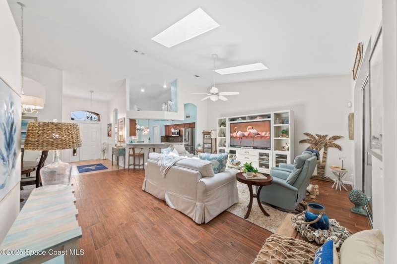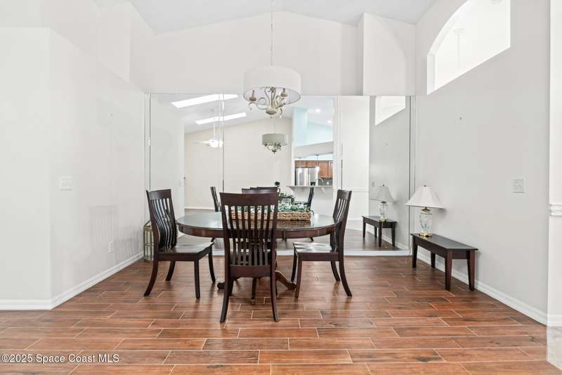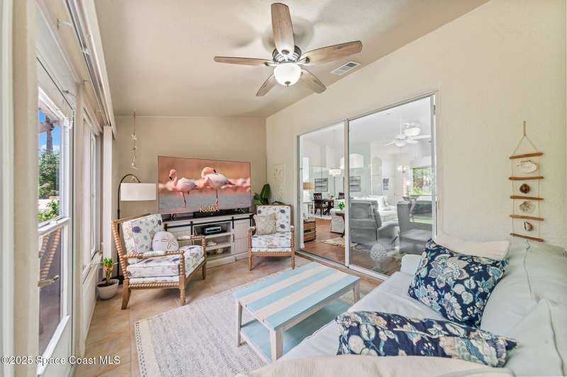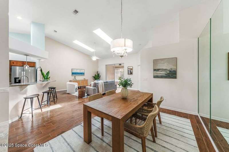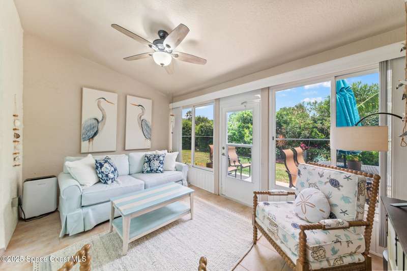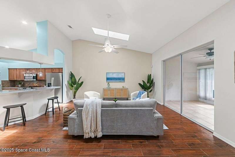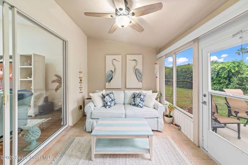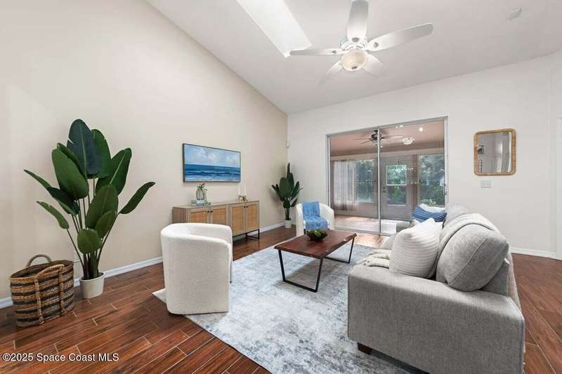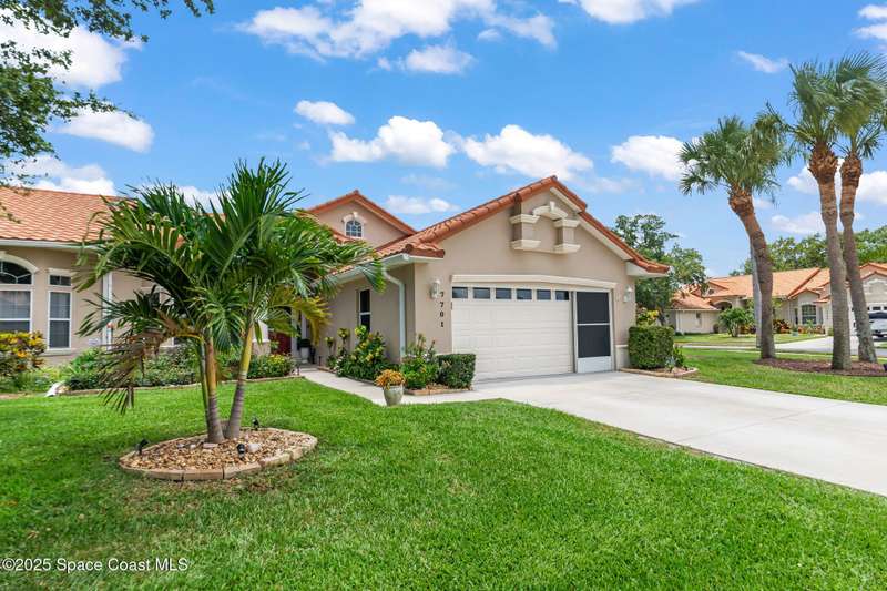 Step into comfort and convenience at 7701 Candlewick Dr, a beautifully cared-for end-unit home nestled in the gated community of Emerald Pointe in Suntree. This charming 3BDRM, 2BA residence offers over1,900sqft of living space with an open layout and vaulted ceilings.Natural light pours into the spacious living and dining areas, while sliding glass doors lead to a fully enclosed Florida room, ideal for year-round enjoyment. The primary suite includes a generous walk-in closet, dual sinks, a relaxing garden tub and a separate walk-in shower. Recent updates throughout the home, including sleek flooring, new epoxy garage floors, modern lighting, upgraded fixtures, & new AC! Enjoy added privacy with the corner lot and lush landscaping, plus extras like plantation shutters, a garage screen, and a metal roof for long-term peace of mind. Located just minutes from beaches, parks, golf, and local shopping and dining!