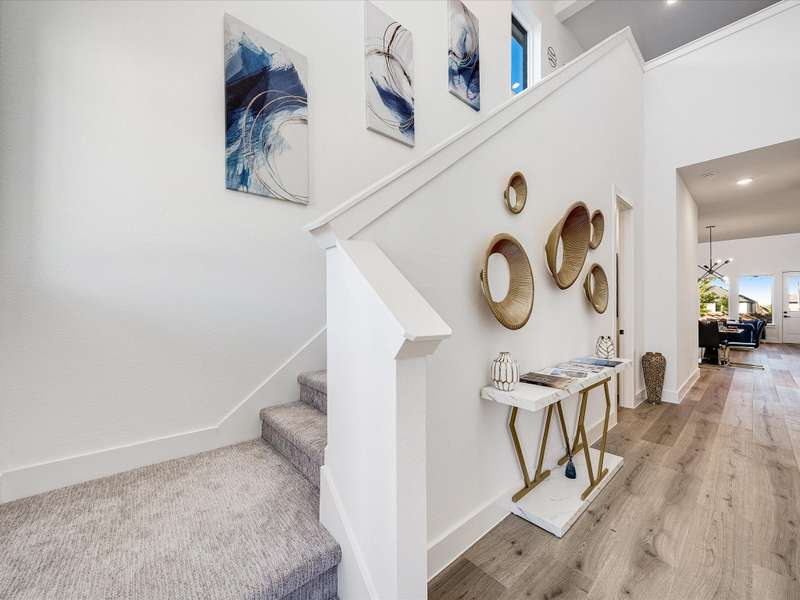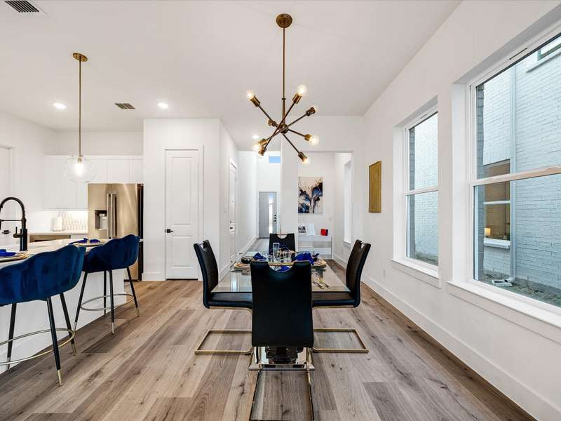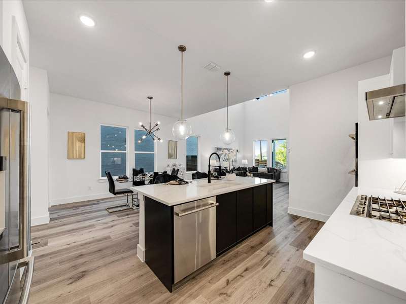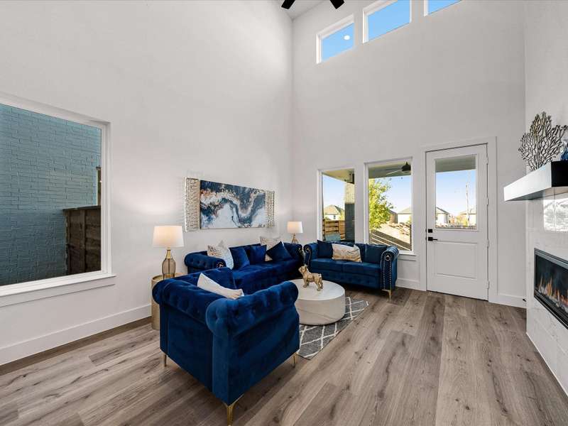 Ready Now! Furnished model Home. Feel like a Royal in our Alexander floor plan. Step into the epitome of modern living with this brand-new Monarch Home, where architectural sophistication blends seamlessly with everyday comfort. This 4-bedroom, 3.5-bath masterpiece includes a spacious game room and a functional pocket office, offering versatility for both entertainment and work-from-home lifestyles. Designed for discerning tastes, the home boasts premium finishes throughout. The Chef-Inspired Kitchen is outfitted with a JennAir appliance package, including double ovens and a 5-burner gas cooktop, making it a culinary dream. Enjoy the elegant touch of quartz countertops, a pot filler, Blanco Silgranit sink, and soft-close cabinetry with upgraded hardware. A decorative backsplash adds a sleek, modern flair. Gather around the crystal-accented gas fireplace under the ambient glow of luxury Kichler lighting. The Karastan Cultivated wood flooring in common areas downstairs as well primary bedroom, combined with 8-foot doors and 12x24 sleek tile accents, creates a clean and contemporary vibe. The Resort-Worthy Primary Suite has a luxurious primary bath featuring floating cabinets, a large frameless glass shower, decorative tiles, framed mirrors, and quartz countertops with undermount sinks. Enjoy effortless indoor-outdoor flow with a large covered patioperfect for entertaining, relaxing evenings, or weekend barbecues, rain or shine.Enjoy gridless modern windows that provide unobstructed views and flood the home with natural light. The community is in fabulous location near an abundance of shopping, dining, entertainment, just minutes from PGA. Located within the highly acclaimed Frisco Independent School District, this home ensures top-tier education in a thriving community. Every detail in this Monarch Home reflects a commitment to excellence and precision craftsmanship, promising a lifestyle of comfort, elegance, and modern flair.