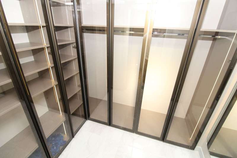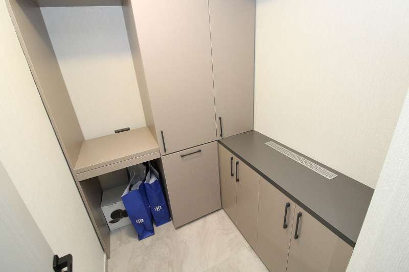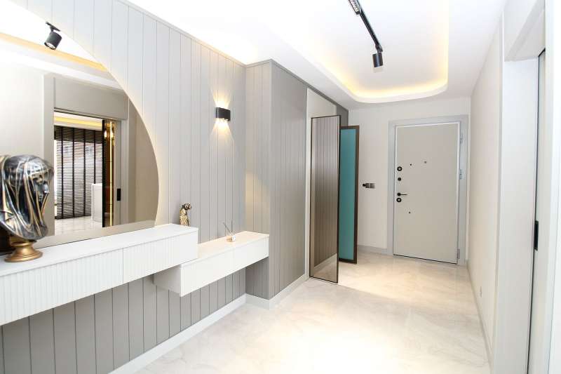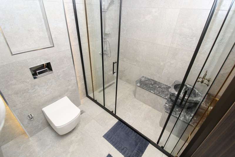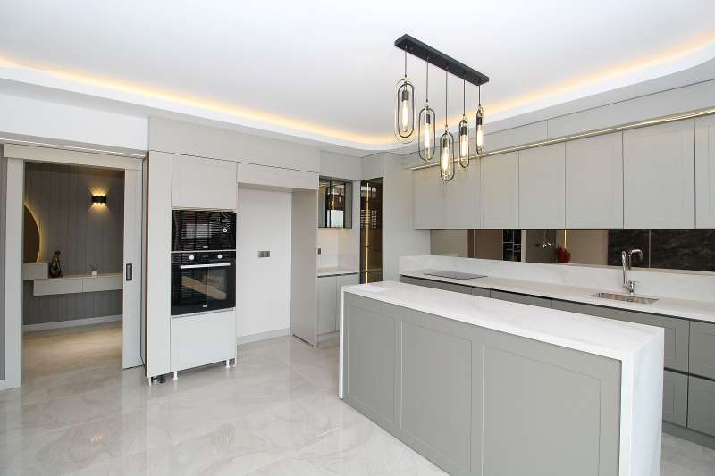 The luxury apartments with city views feature 5 bedrooms, a spacious living room, a separate island kitchen, a laundry room, a bathroom, an en-suite bathroom, a dressing room, a coatroom, and a large balcony. High-quality materials used in the apartments include a central underfloor heating system, shower cabins, built-in kitchen sets, a coatroom, LED ceiling lighting, a Turkish bath, premium laminate flooring, and modern ceramic tiling in wet areas.